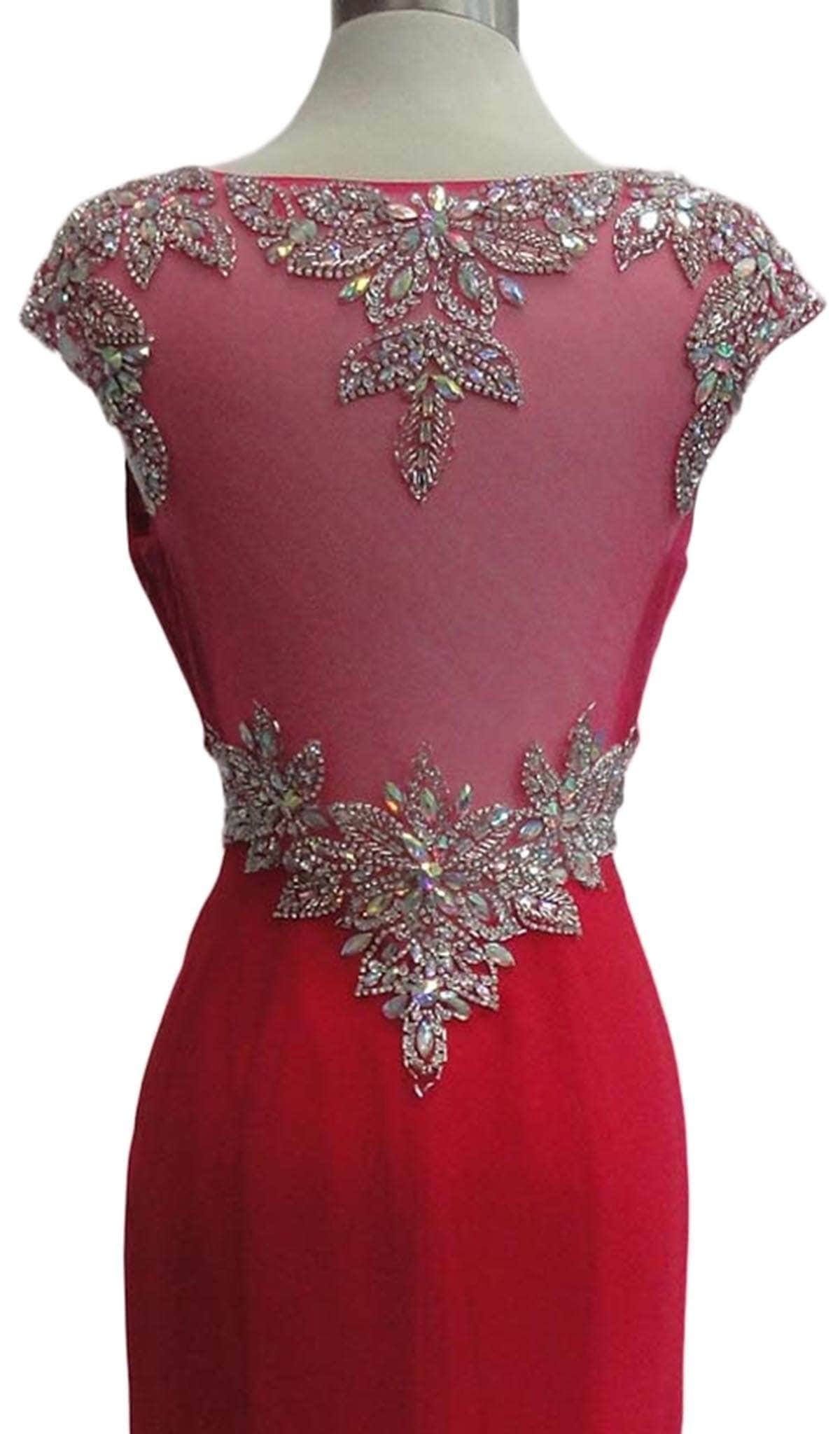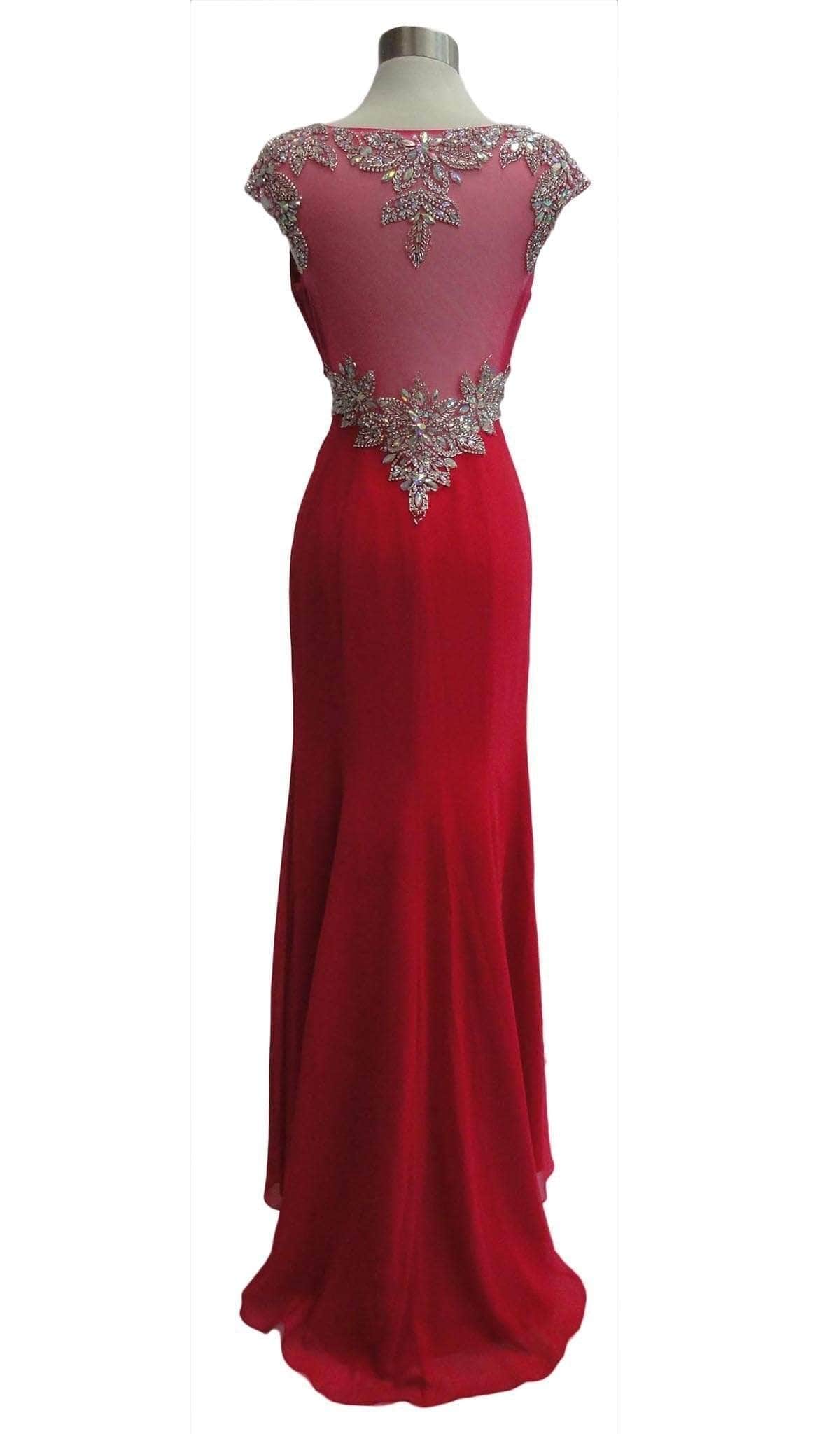 | Details: | Fitted, Ruched Bodice, Crystal Embellished Cap Sleeves and Waist, Princess Seams, Side Slit, Full Length, Sheer Back, Sweep Train |