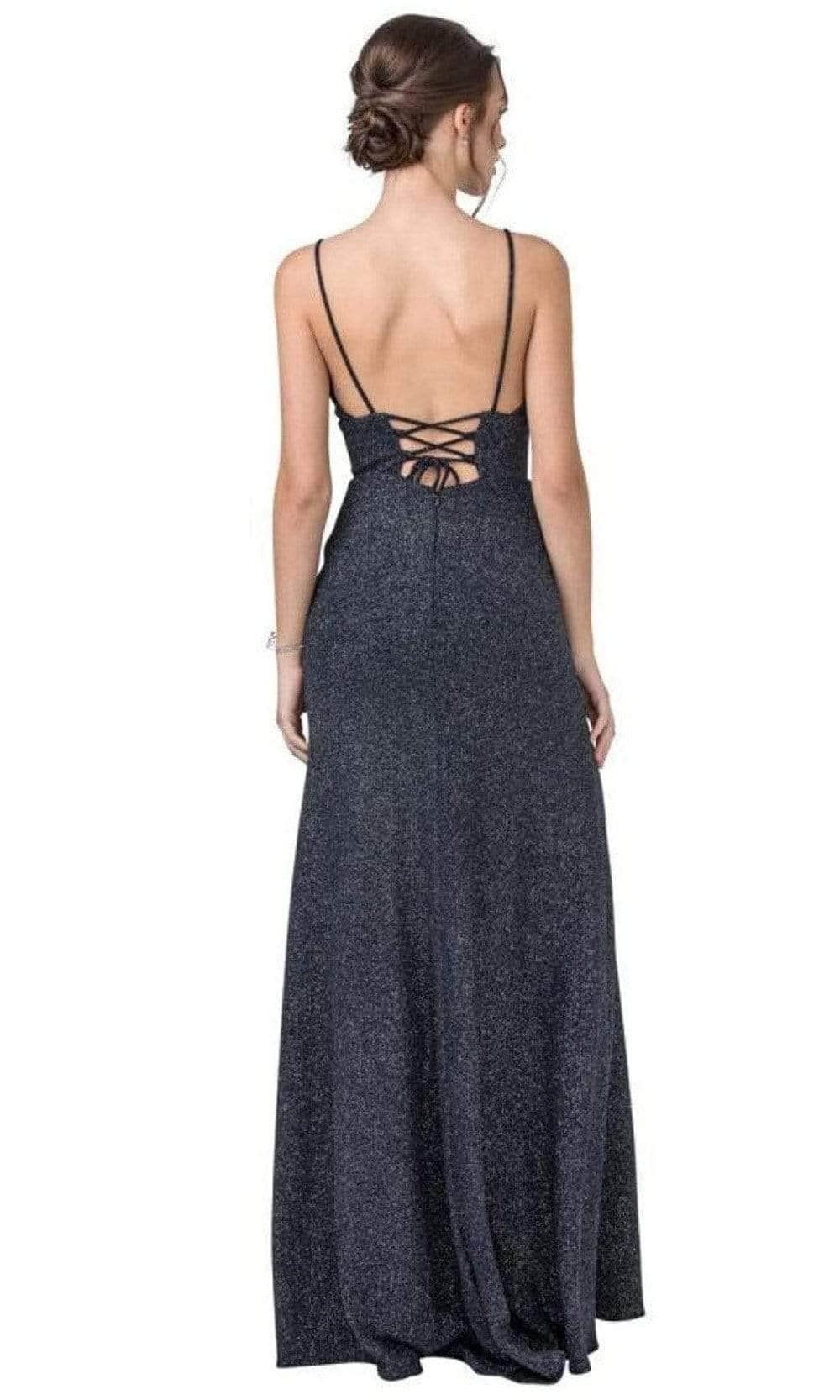 Shimmer and shine in an ethereal Trevi Collection D415. A phenomenal dress that parades a plunging neckline and spaghetti straps. The dress is shining with glitters throughout. It is fit and flare and it is in A-line silhouette. It has high slit that shows your great tone legs. The skirt is flowy and wavy that makes you walk look gorgeous. The back has a lace up tie as a closure that makes it more elegant. It also has a back sipper for security. Be ready to mesmerize the night in this Trevi Collection masterpiece.