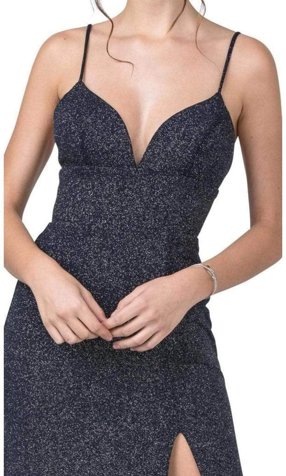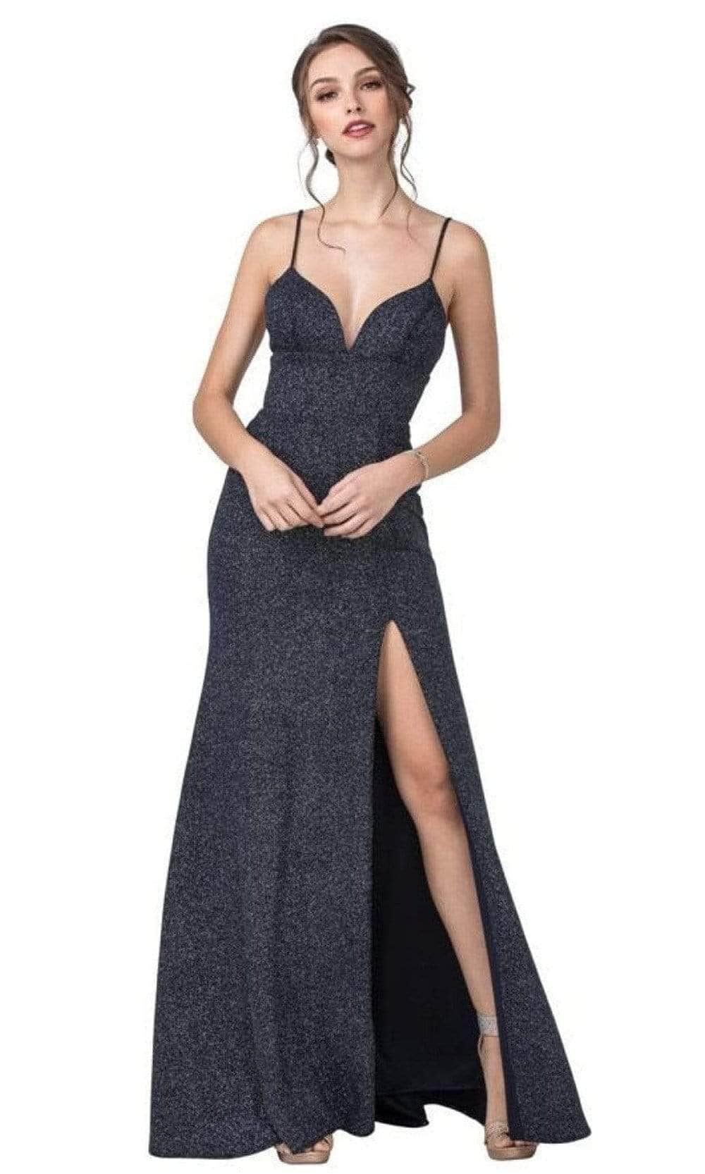 | Details: | Sleeveless, Spaghetti straps, Plunging neckline, Fitted bodice, Glitters, High slit, Open back, Floor length, Sweep train |