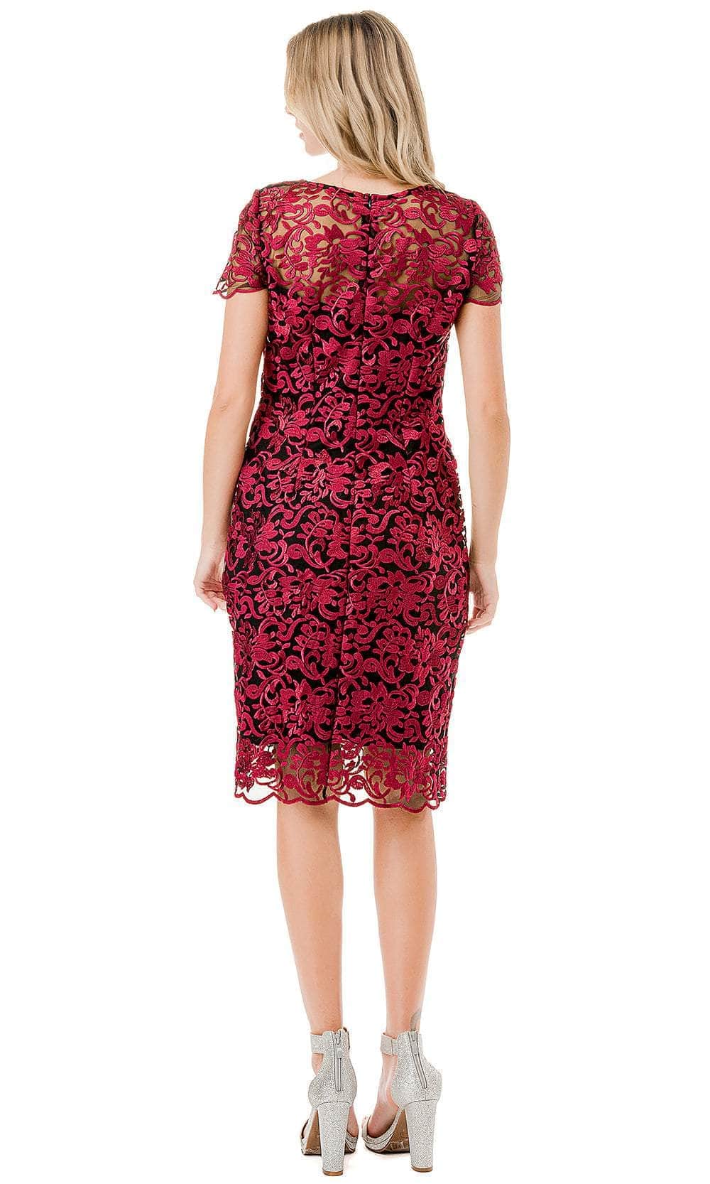 Make a lasting impression with this creation from Trevi Collection D713. The dress is completely adorned with embroidery that adds a touch of intrigue and charm. The illusion detail on the short sleeves and jewel neckline creates a captivating visual effect, while the full back features a zipper closure for a seamless fit. The sheath skirt cascades down to a knee-length hemline, drawing attention to your curves with poise. Complete with amazing scalloped trim. Leave everyone speechless when you enter the room in this Trevi Collection D713 dress. Models are wearing Bk-Burgundy, Bk-Green, Bk-Mauve, and Bk-Purple colors.