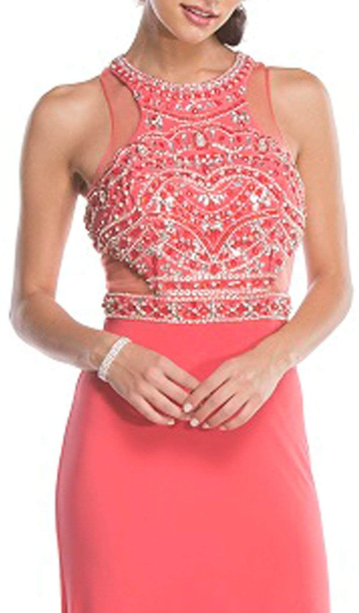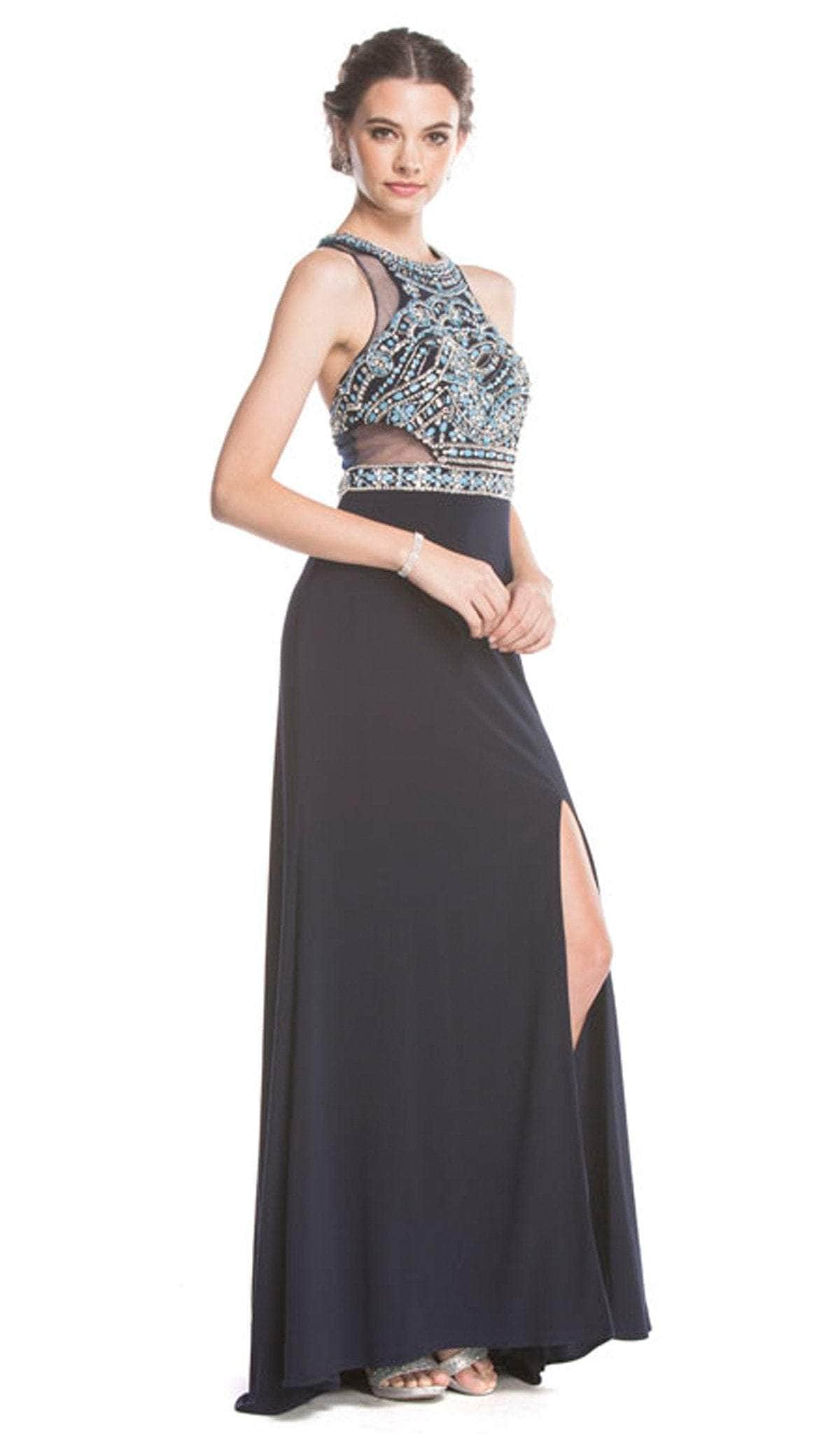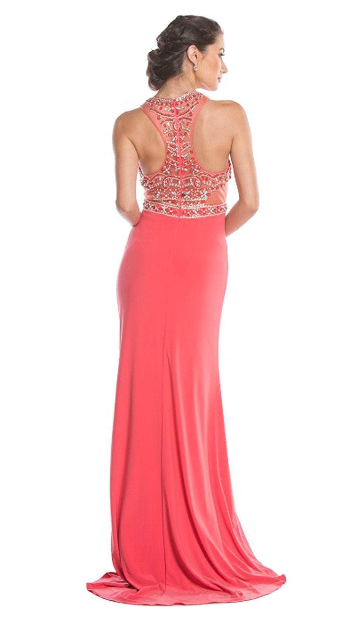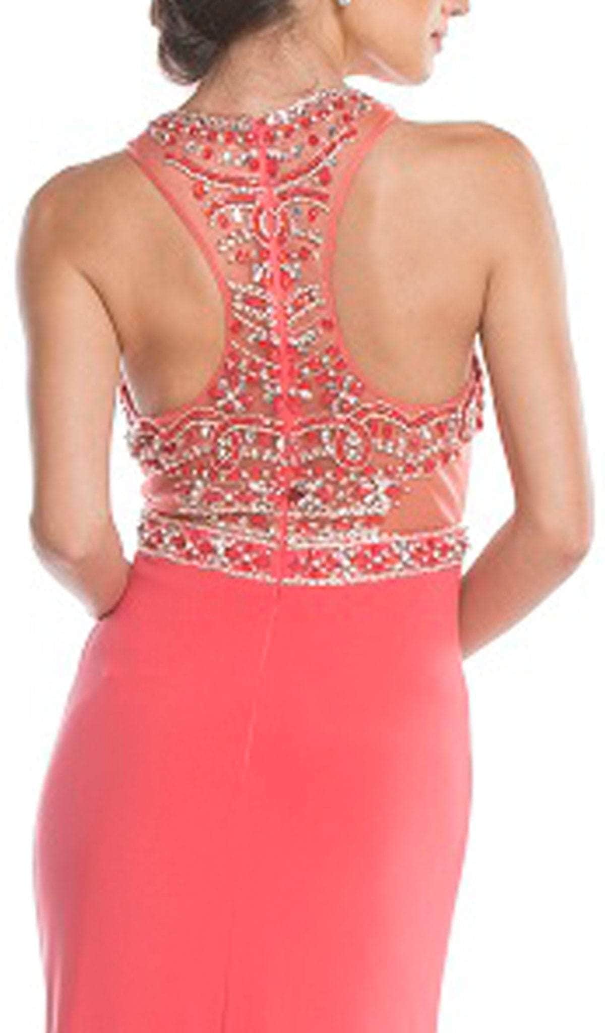 Heighten your charming appeal wearing this long dress by Trevi Collection L1619. Glams in a sleeveless, halter neckline with fitted bodice bedecked with embellishments. The dress has a racerback style while the fitted skirt is accented with a slit and a sweep train finish. Dive into a divine event in this luxe Trevi Collection dress.