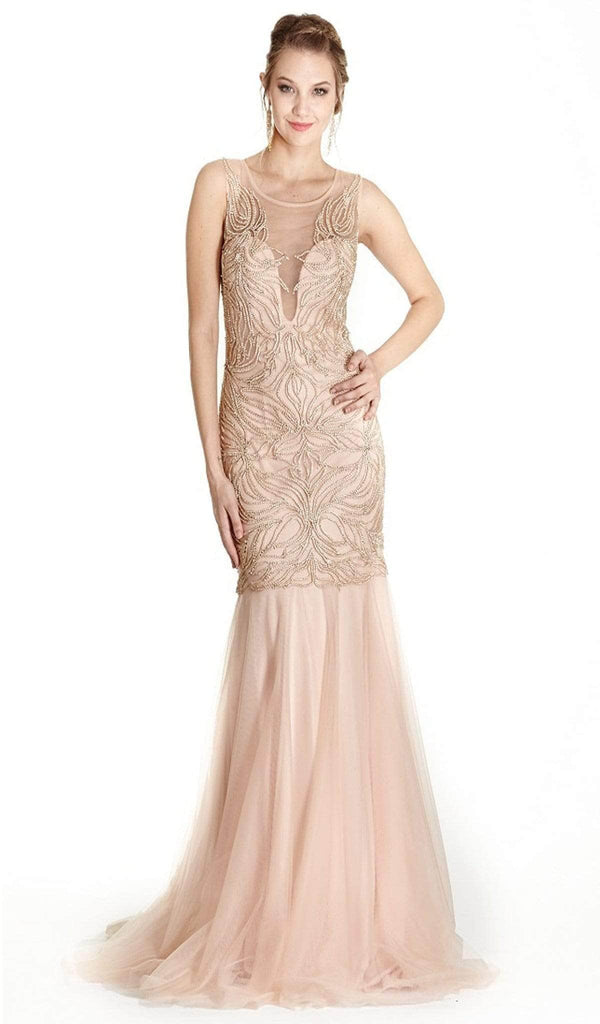 Portray the rich variety of design in this long dress from Trevi Collection L1764. Presents in a sleeveless, illusion scoop neckline with a plunging neckline detail. The fitted bodice is ornate with embellishments and flaunts a sheer back. The skirt has a trumpet silhouette that perfectly hugs your curves and brings drama with its sweep train finish. Get glam in this fabulous dress from Trevi Collection.
