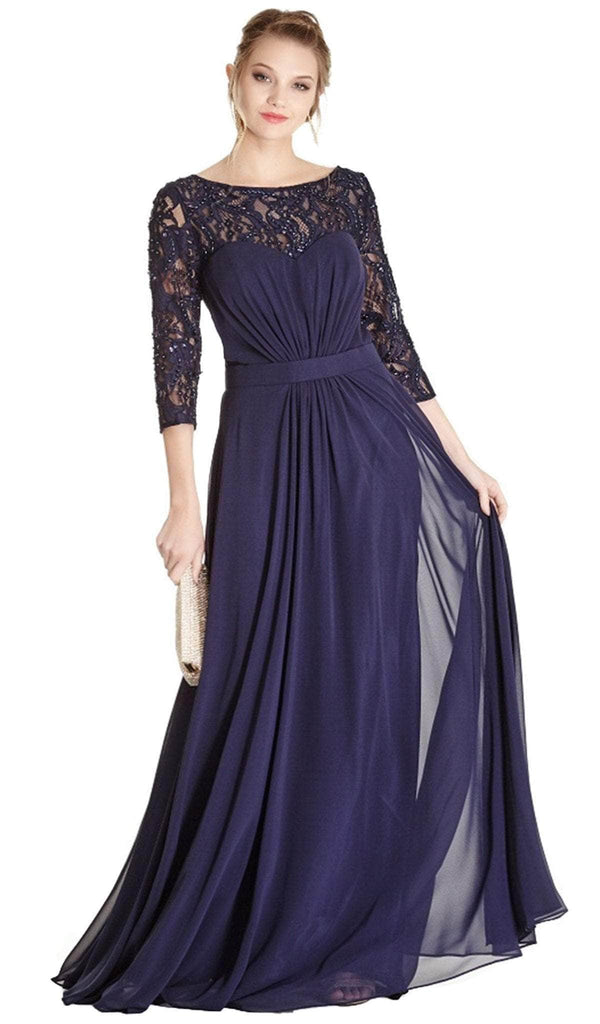 Show your sophisticated sense of style in this dress from Trevi Collection M1801. Glams in an illusion bateau neckline with quarter length sleeves. The dress is adorned with embellished lace and the sweetheart lined bodice is ruched and wrapped in a thin band at the waist. Look sassy and stunning in this daring dress by Trevi Collection.