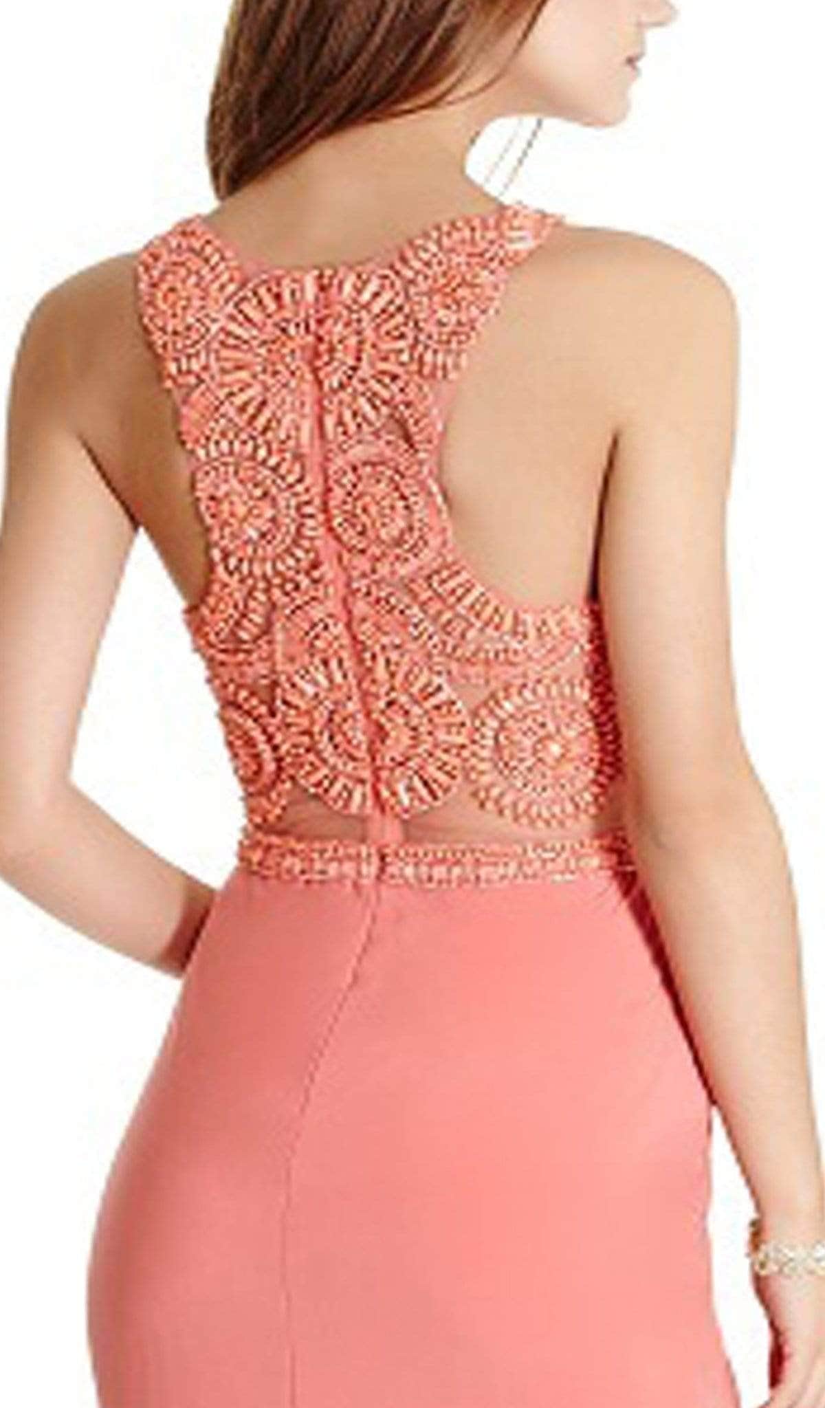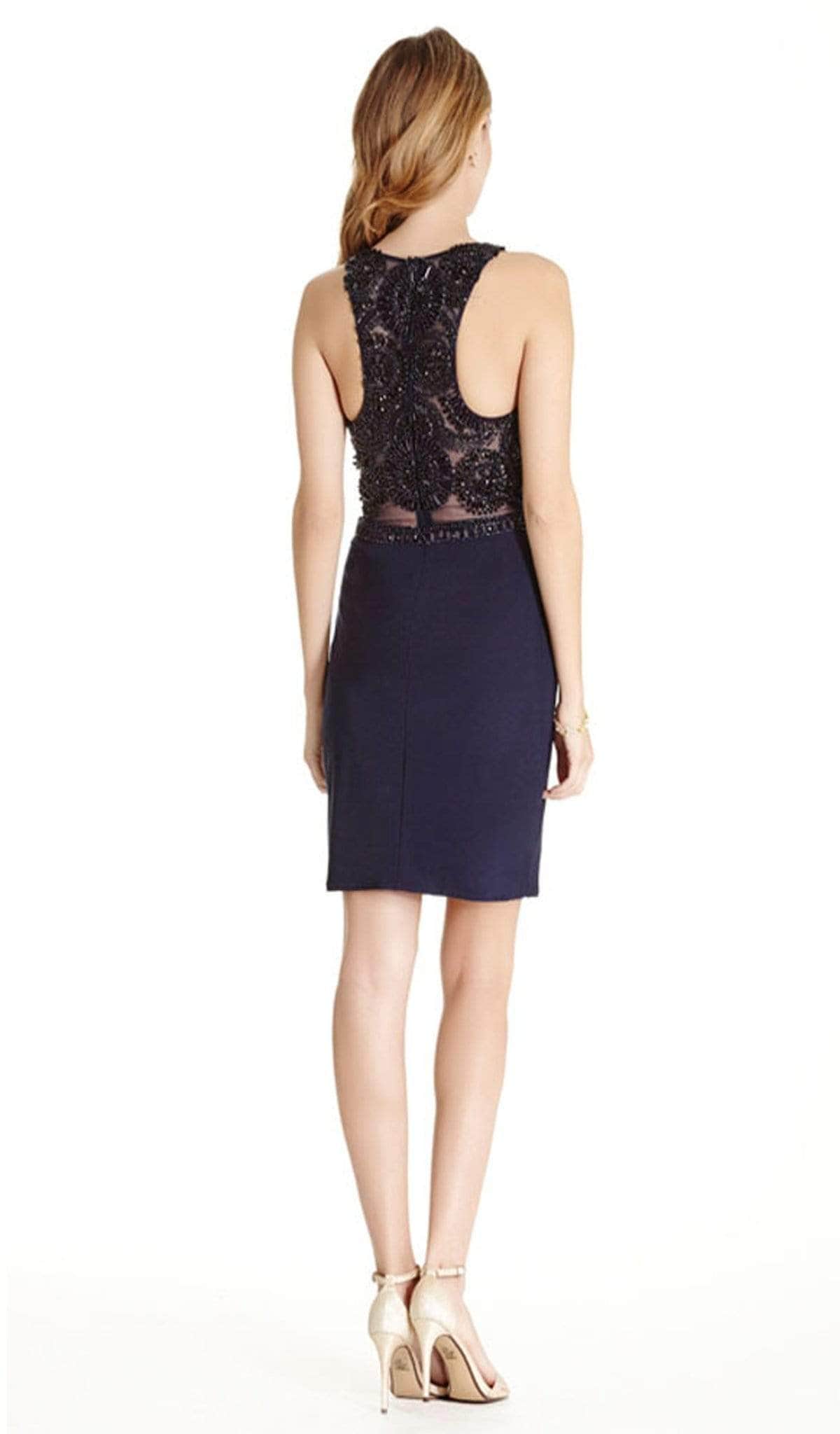Be beautiful in this fashionable cocktail dress by Trevi Collection S1724. This elegant mock two piece dress showcases a sleeveless, halter neckline with fitted bodice ornate with embellishments. The skirt heightens your curves with its fitted silhouette and mid-thigh hem. This trendsetting Trevi Collection dress is sure to get you noticed.