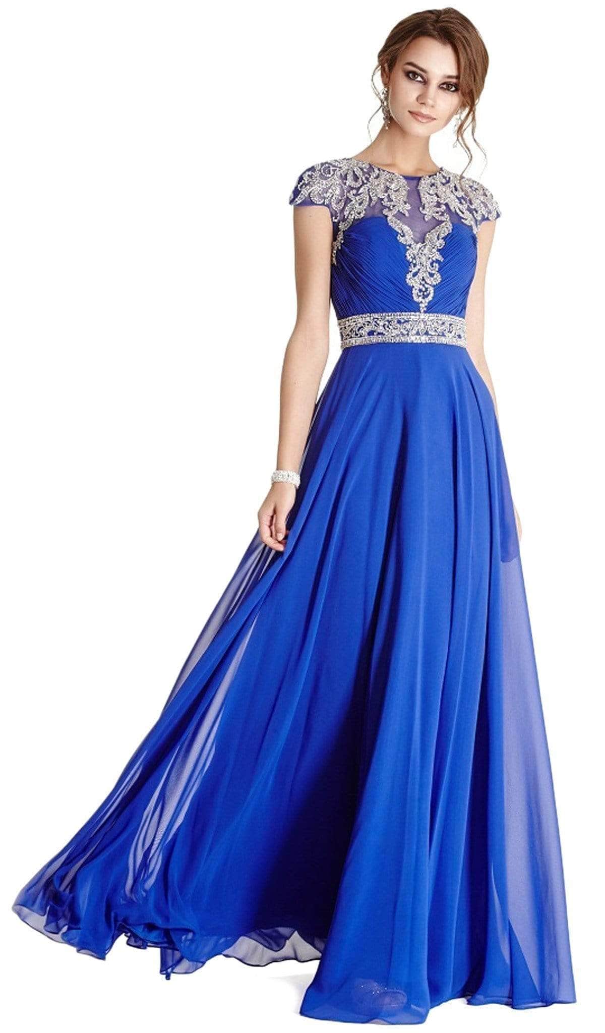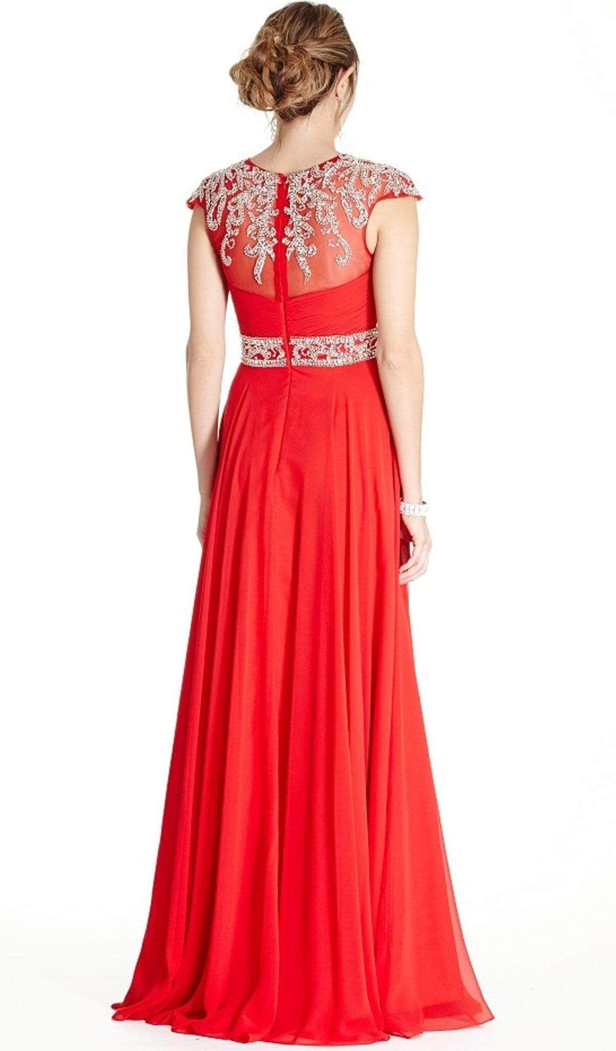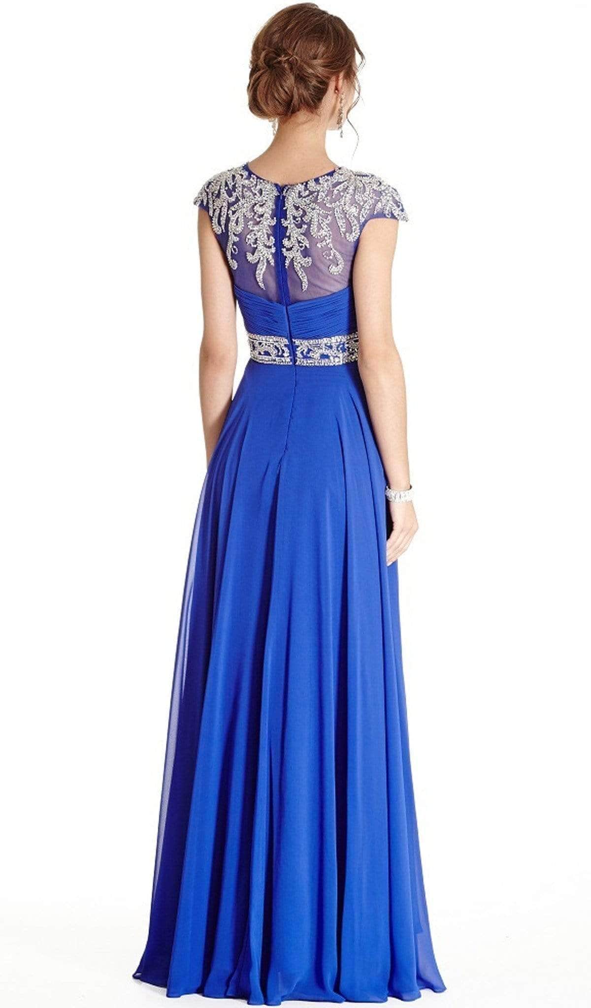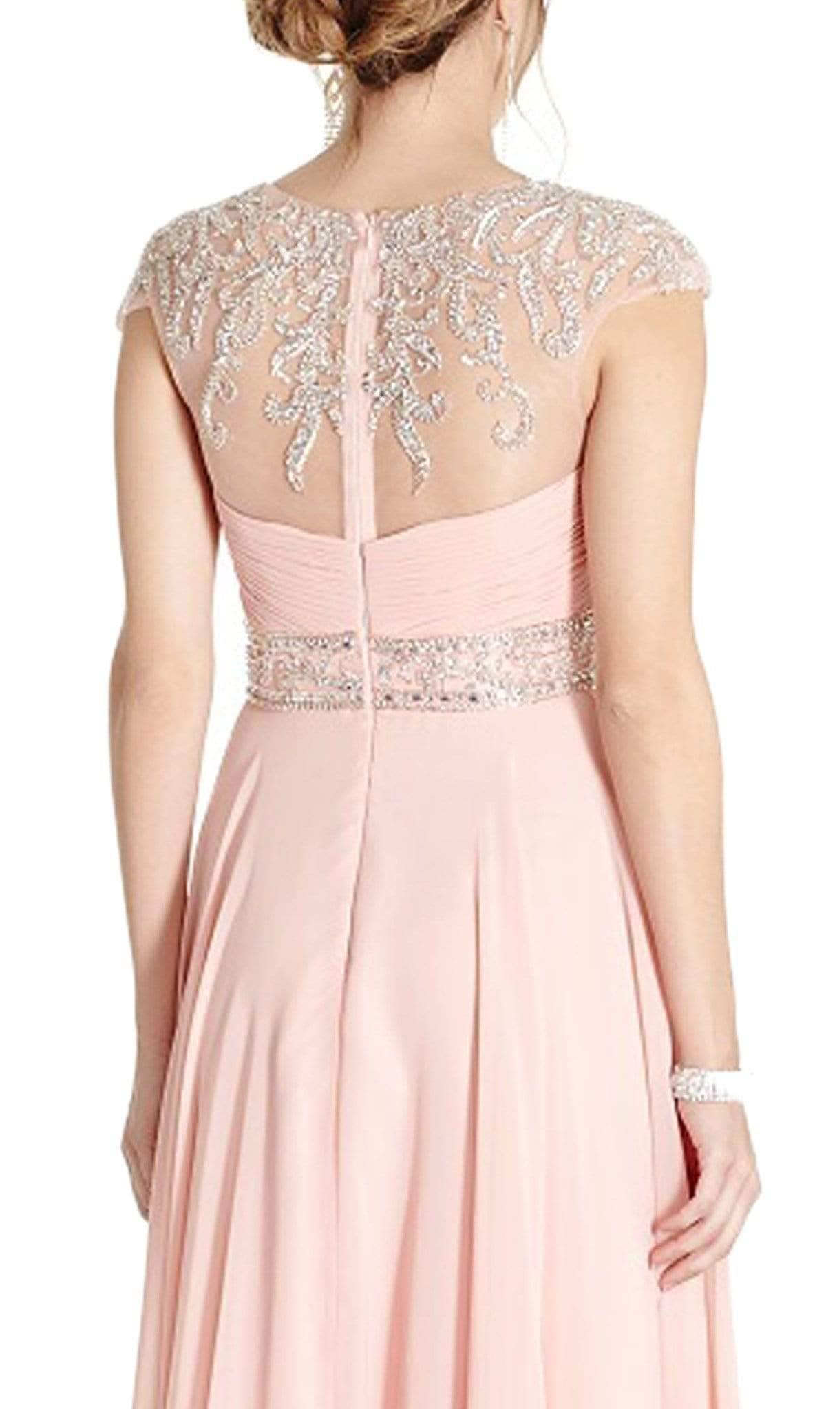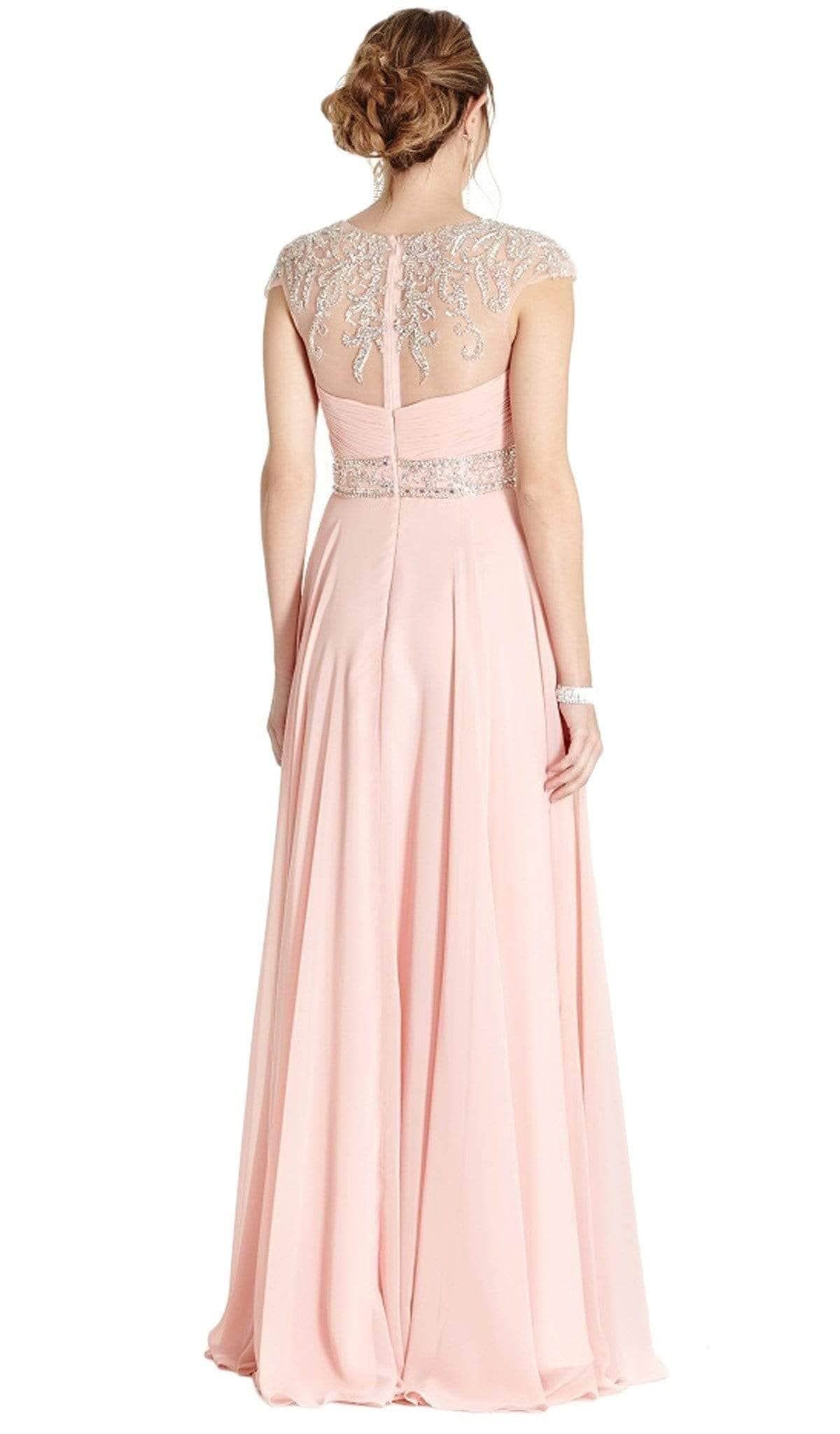 Steal the show in this dazzling dress from Trevi Collection L1821. Charms in an illusion jewel neckline with cap sleeves. The ruched bodice is bedecked with beautiful embellishments and cinched at the waist with an ornate band. The skirt begins from the natural waist and opens an A-line silhouette with mini train. This Trevi Collection piece is sure to be an attention-grabber in any occasion.