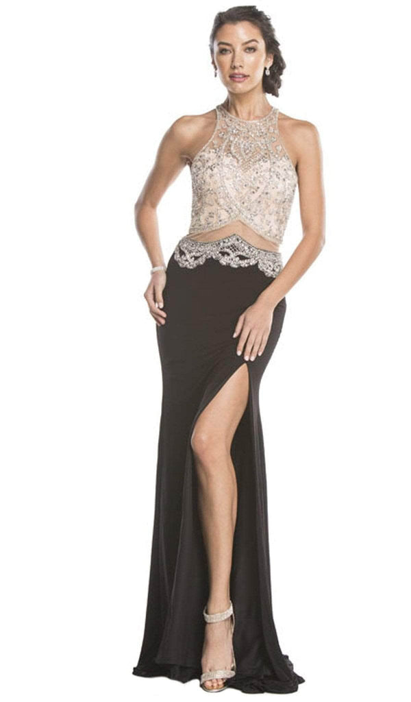 | Details: | Sheer Fitted Embellished Bodice, Sleeveless, Floor Length, Side Slit, Racerback, Back Zipper Closure, Sweep Train |
