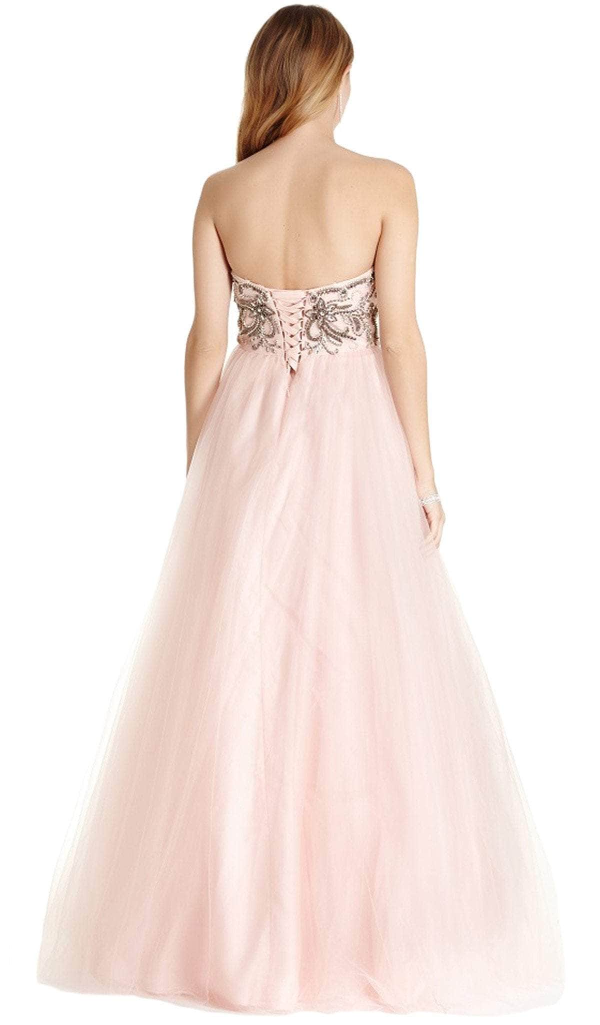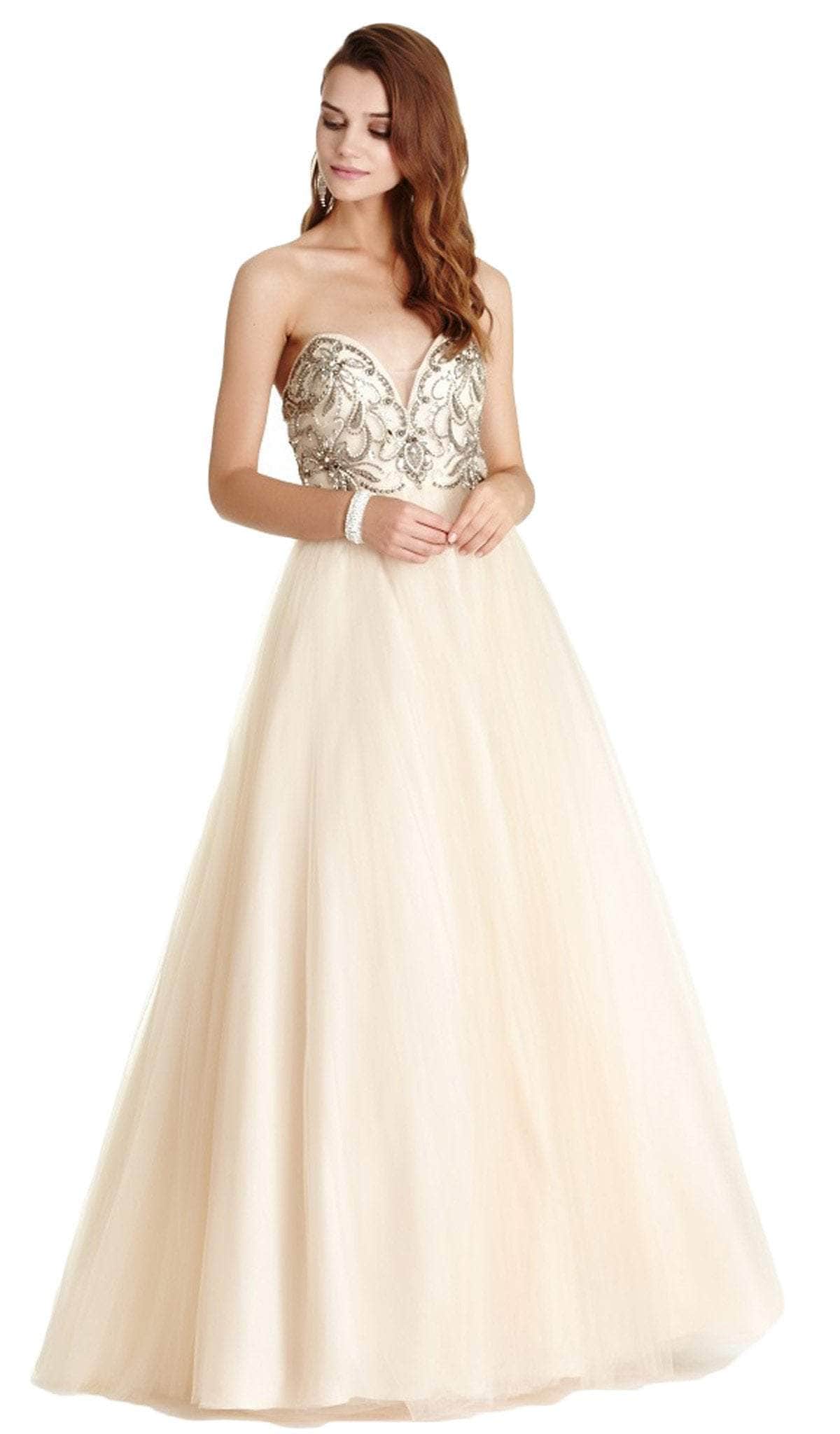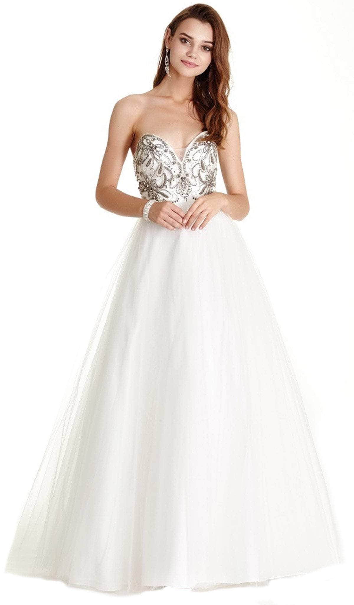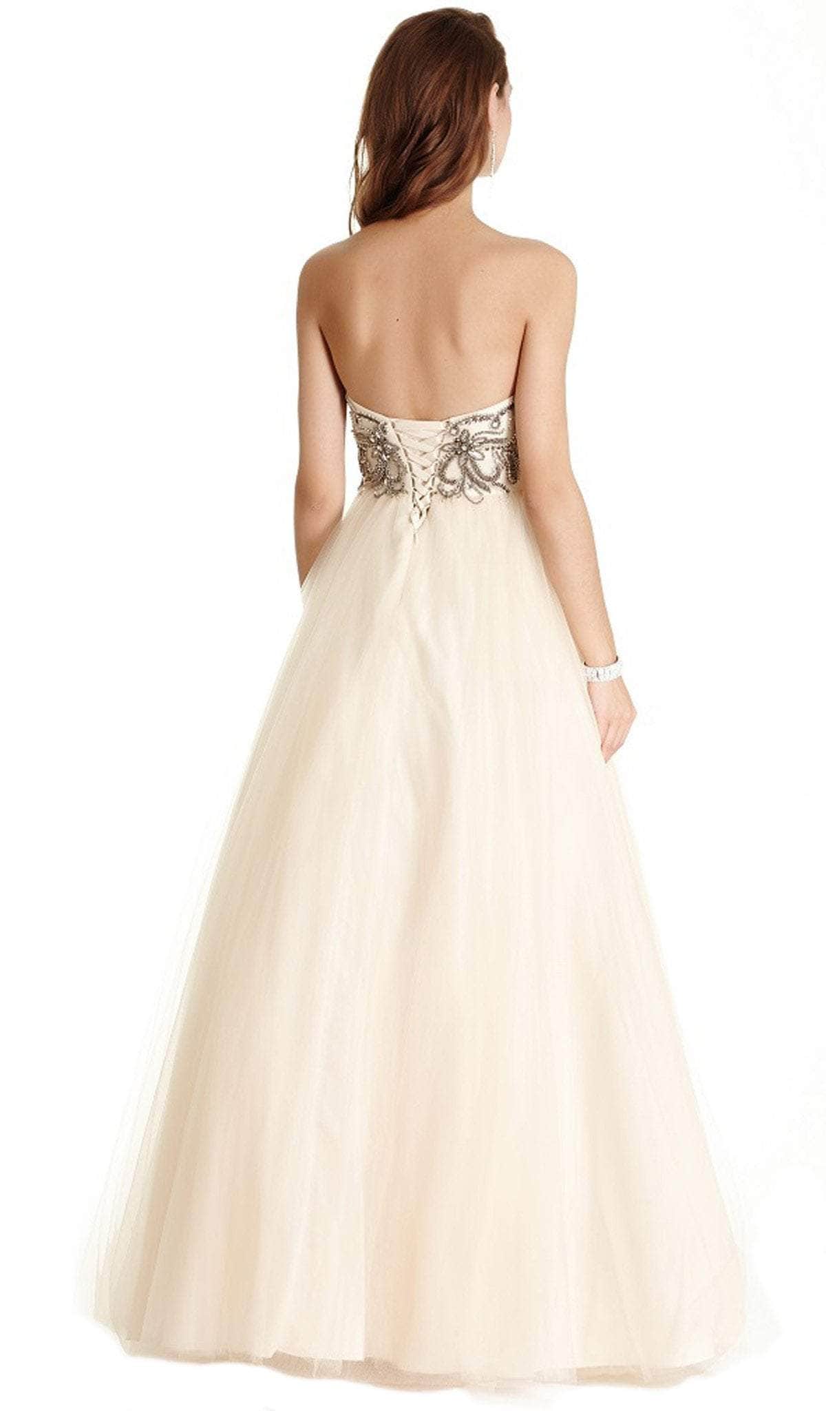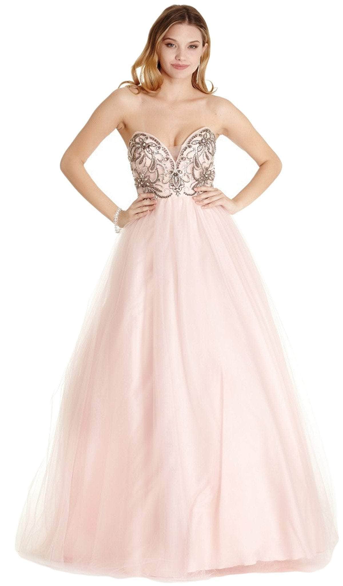Walk in glamour and let all heads turn on you in this creation by Trevi Collection L1829. Features a strapless, plunging sweetheart neckline with sheer panel on mid-bust. The bodice is lavishly adorned with embellishments and has a lace up closure. From the natural waist begins a full length ballgown skirt that gives that princess look. This Trevi Collection gown is sure to make you the darling of the party!