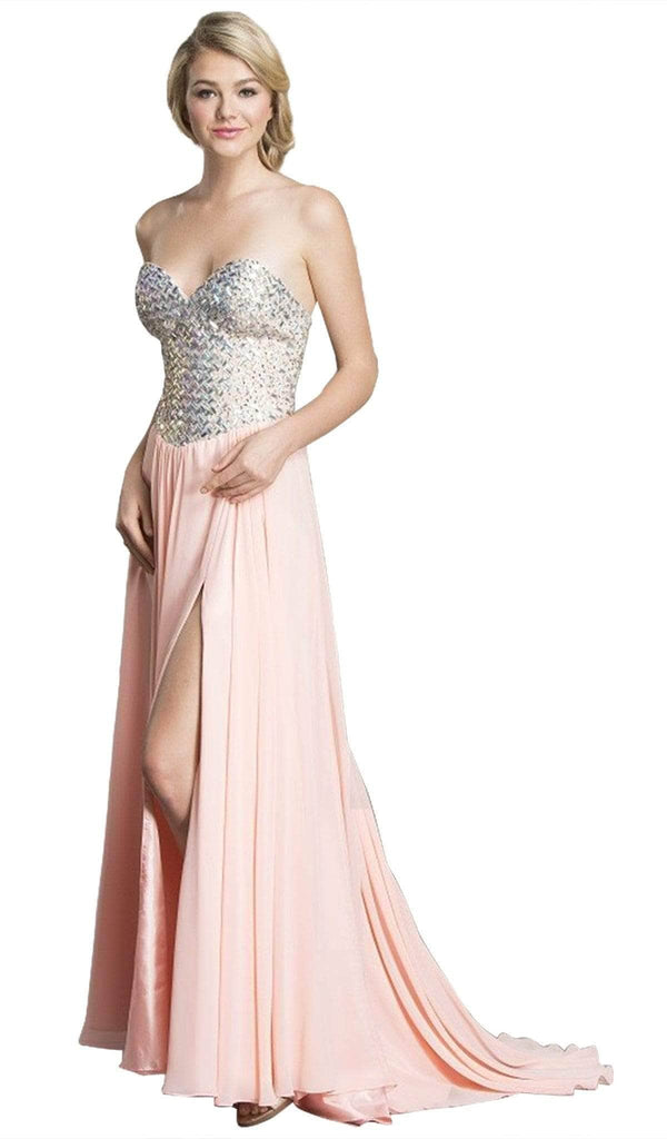 Dress to impress when you step out wearing this stunning strapless evening Prom dress by Trevi Collection L1299. Fabulous on all figures, this striking piece has a strapless sweetheart neckline and fitted bodice fully adorned with opulent sparkling beads. This full-length style features a high leg slit and a sweep train at the floor. Pair with chandelier earrings, rhinestone bracelets, and sparkly heels for a chic look. Ideal for prom, pageant, or black tie event, you are sure to stun the crowd wearing this spectacular style by Trevi Collection.