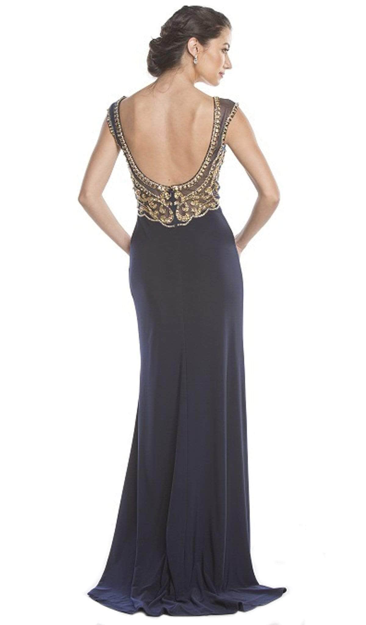 Be stunningly beautiful wearing this lovely evening dress by Trevi Collection L1548. An illusion V neckline and slight cap sleeves frame the sheer and fitted bodice adorned with elegant gold embellishments. The A-line skirt cascades to a floor length hem with a thigh high slit that perfectly elongate your sexy legs. The back flaunts a low scooped cut while a mini train finishes the look of this ensemble. This dress by Trevi Collection is a sure stand out at the party.