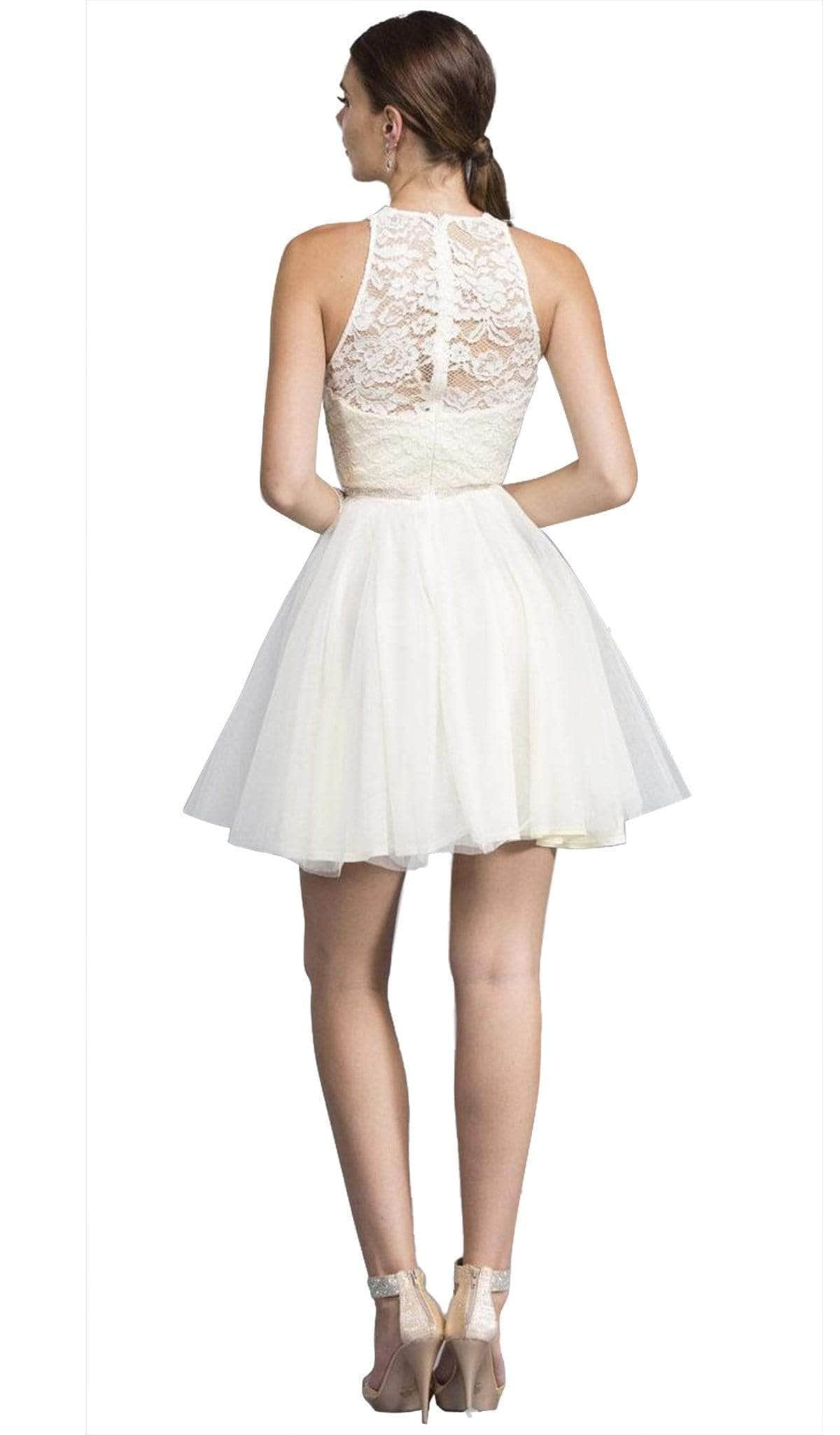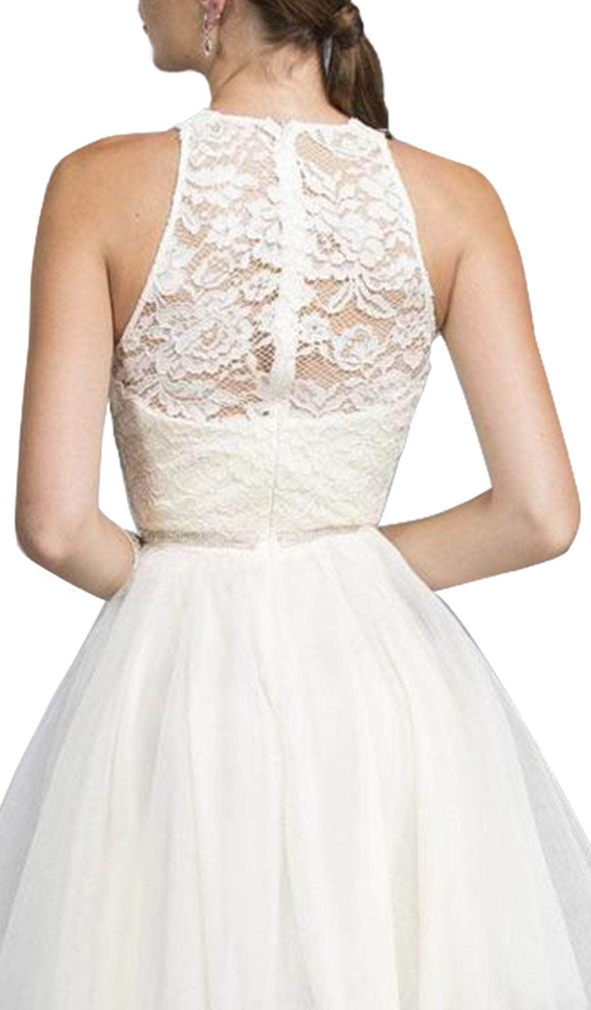Radiate sophistication at your next special occasion in this Trevi Collection D135 cocktail dress. The sleeveless ensemble boasts a halter neckline with cut-in shoulder detail. Floral lace overlay richly adorn the fitted bodice. This charming style features a crystal embellished belt as the A-line skirt slides to the mid-thigh hemline with tulle overlay. This Trevi Collection special is a charming choice for homecoming, graduation, cocktail party, wedding events or any other special occasions. Model is wearing the Ivory color.