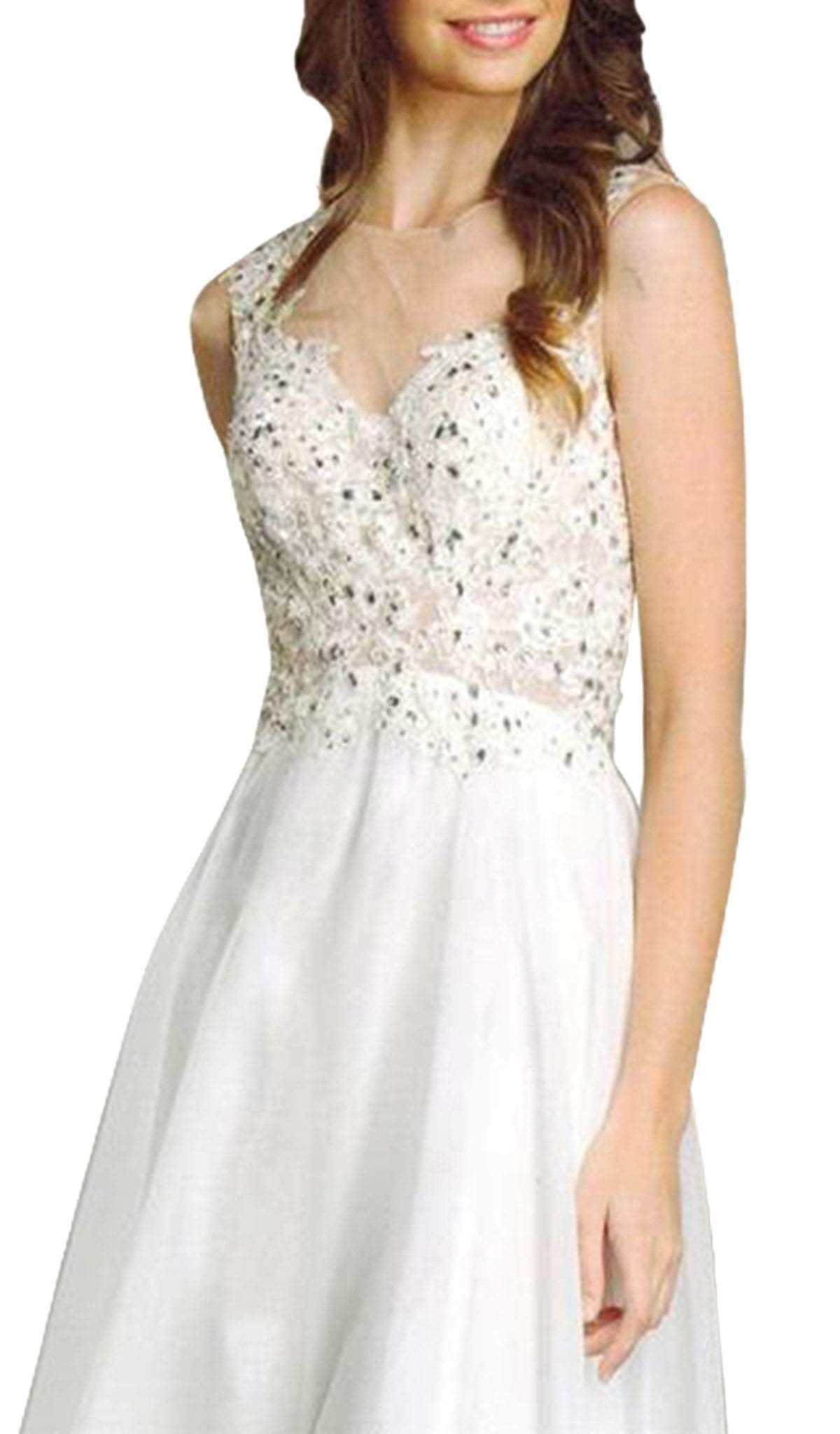 All eyes will be on you as you wear this gorgeous dress by Trevi Collection L1425 to your prom. This enchanting dress showcases an illusion neckline with fully adorned stunning floral lace beaded bodice and a breathtaking sheer back. Fine pleats gathered at natural waistline, while featuring a lovely chiffon skirt flowing out perfectly. This lovely creation by Trevi Collection is sure to have you fall in love!