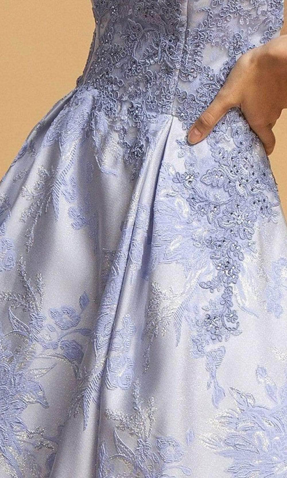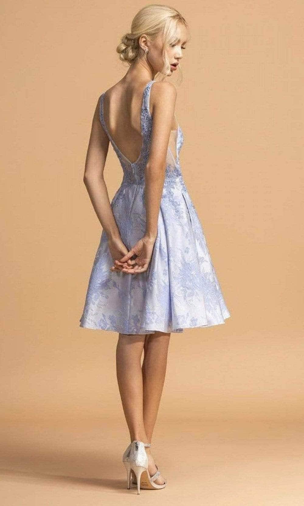 This knee-length dress highlights an illusion jewel neckline in a sleeveless and embroidered bodice. Revealing an A-Line silhouette, this also shows a V back with back zipper closure. Model is wearing Perry Blue color.