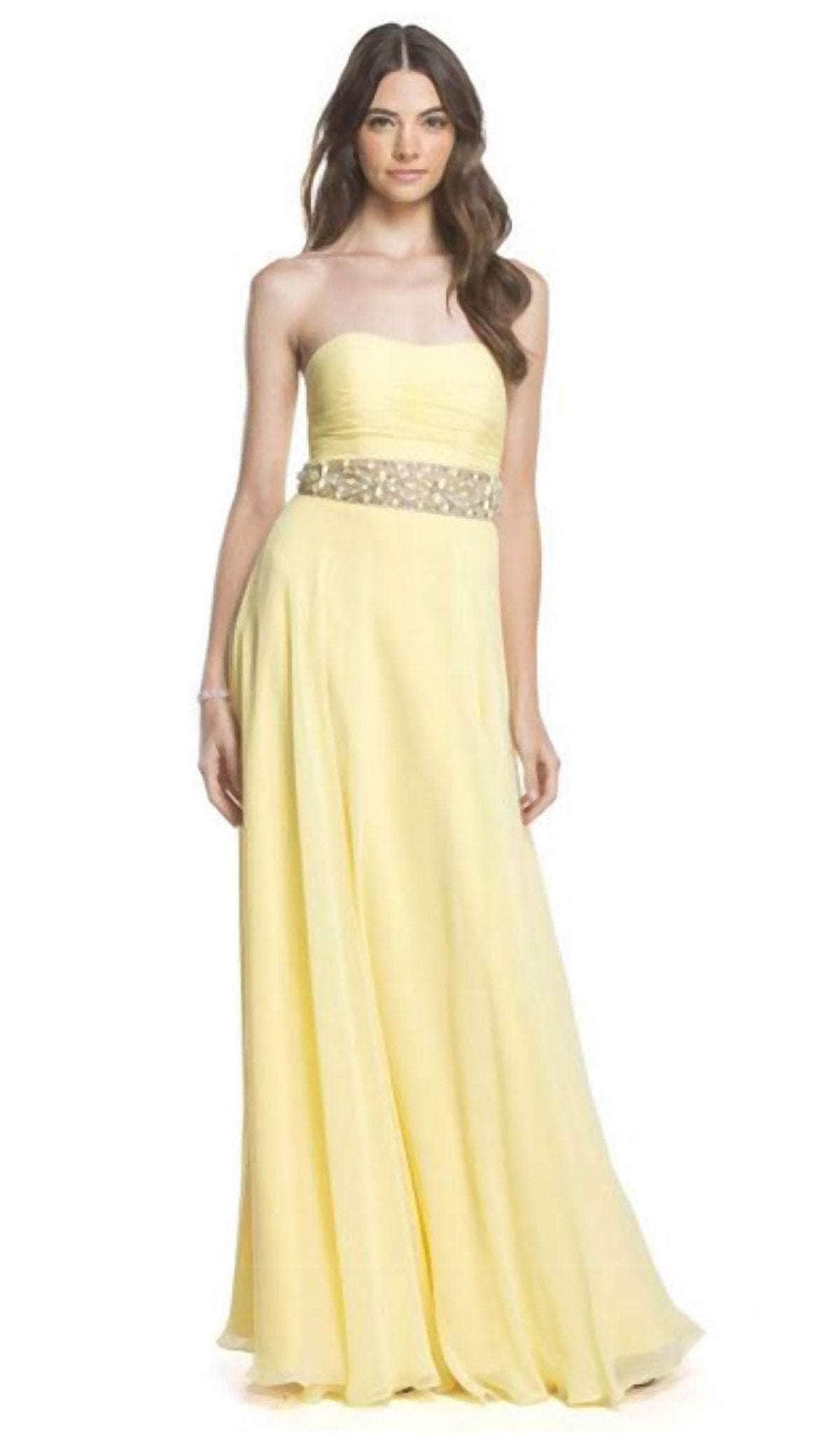 The strapless bodice is designed with pleating topped with a sweetheart neckline complemented with a mid-open back. The empire sheer waist is beautifully embellished with lovely accents. Wonderful pleats cascade through the A-line skirt of this absolutely awesome gown as a center zipper closure secures the back for a flattering fit. Models are wearing the Aqua, Lilac and Yellow colors.