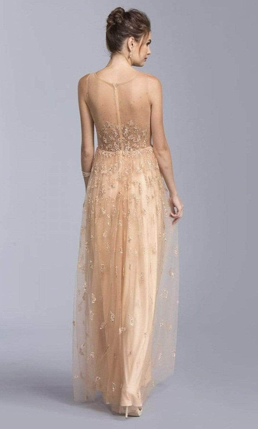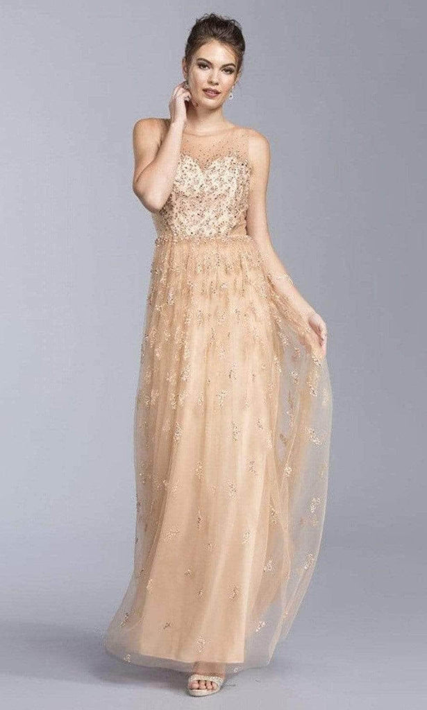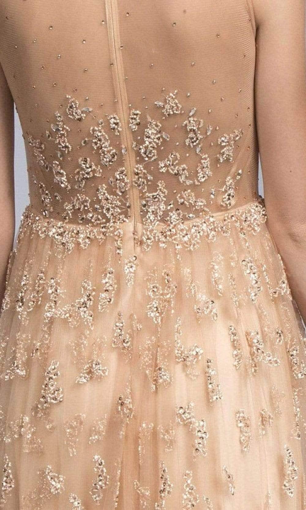 Aspire to reap appreciative glances like clockwork in this Trevi Collection L1996 creation. Dotted with rhinestones and beadwork on a sheer silhouette, this piece reveals an illusion bateau neckline with a sheer full back. Accented with sheer side cutouts, the A-line skirt shimmers as it creates a full-length design. Stun from all angles with your alluring style in this glamorous Trevi Collection masterpiece. Model is wearing the Nude color.