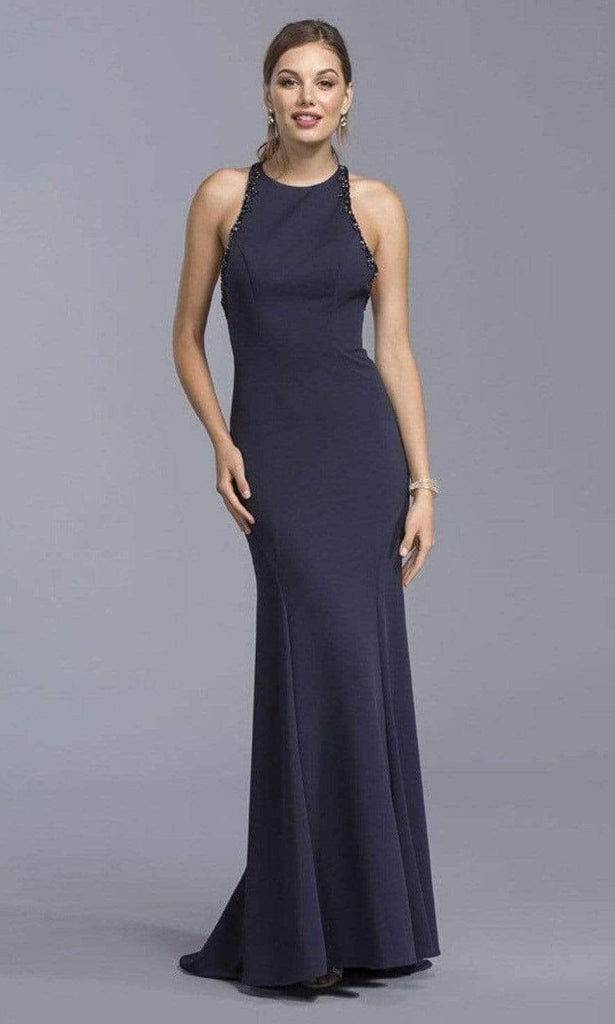 Infuse your special event with stellar style in this Trevi Collection L2017 creation. Embellished with beaded trims, this sleeveless dress flourishes a jewel neckline. The back has a crisscross design as the skirt trails to the floor with a sheath silhouette and train. Unleash that sophisticated siren in you in this Trevi Collection masterpiece. Models are wearing the Navy and Silver colors.