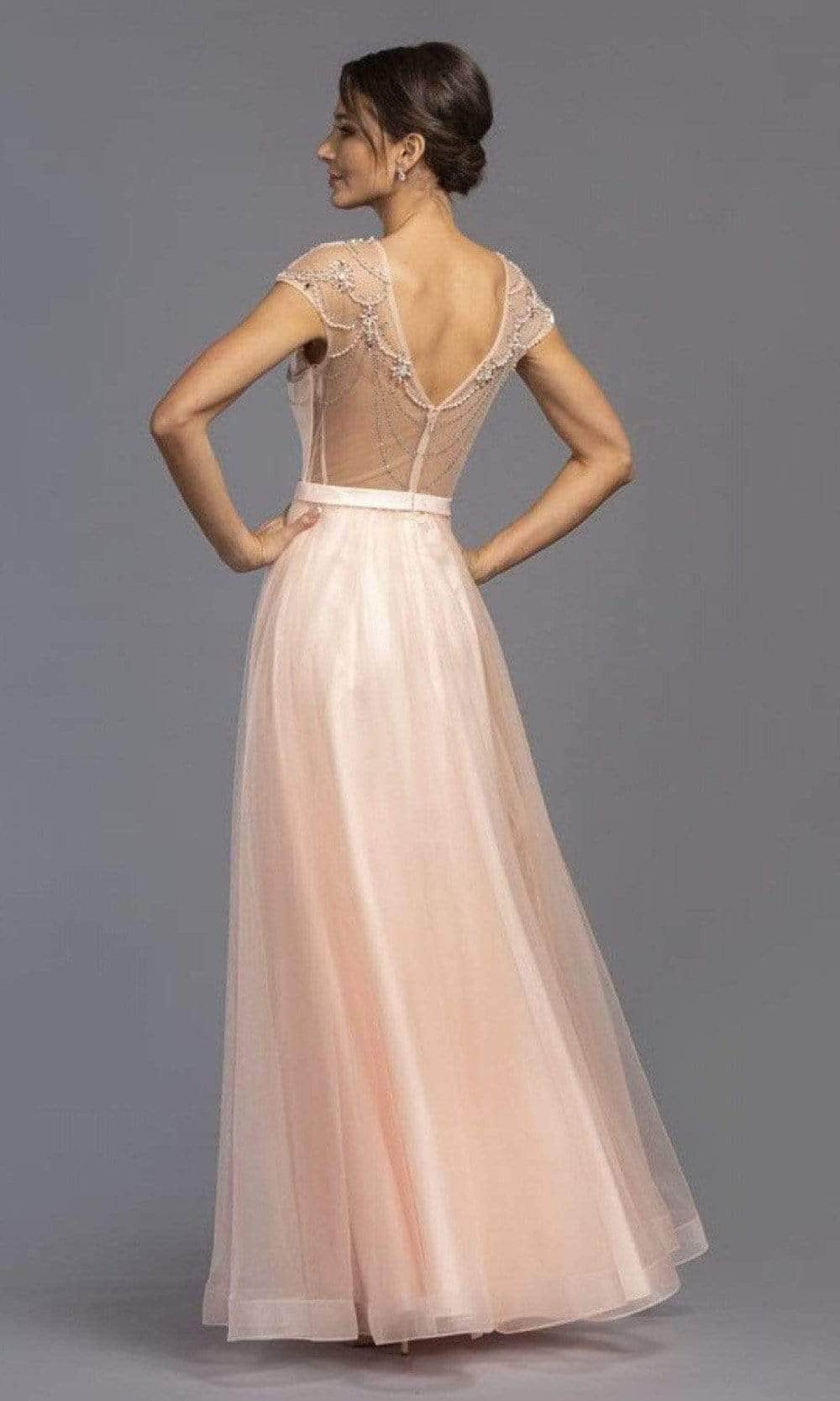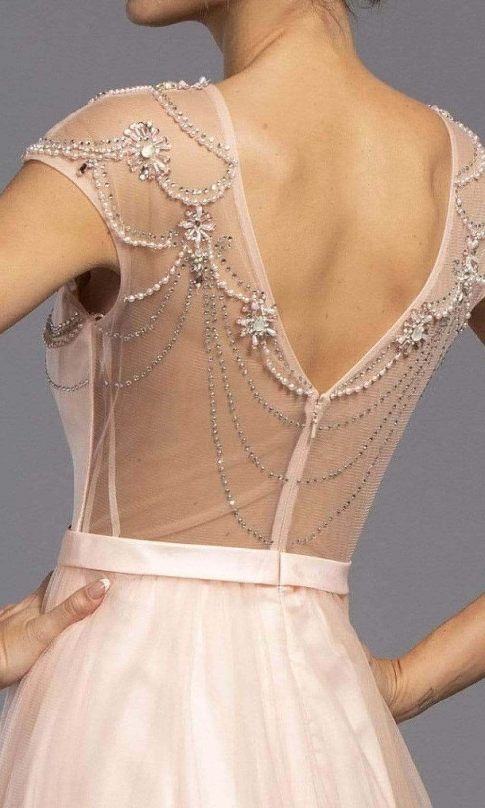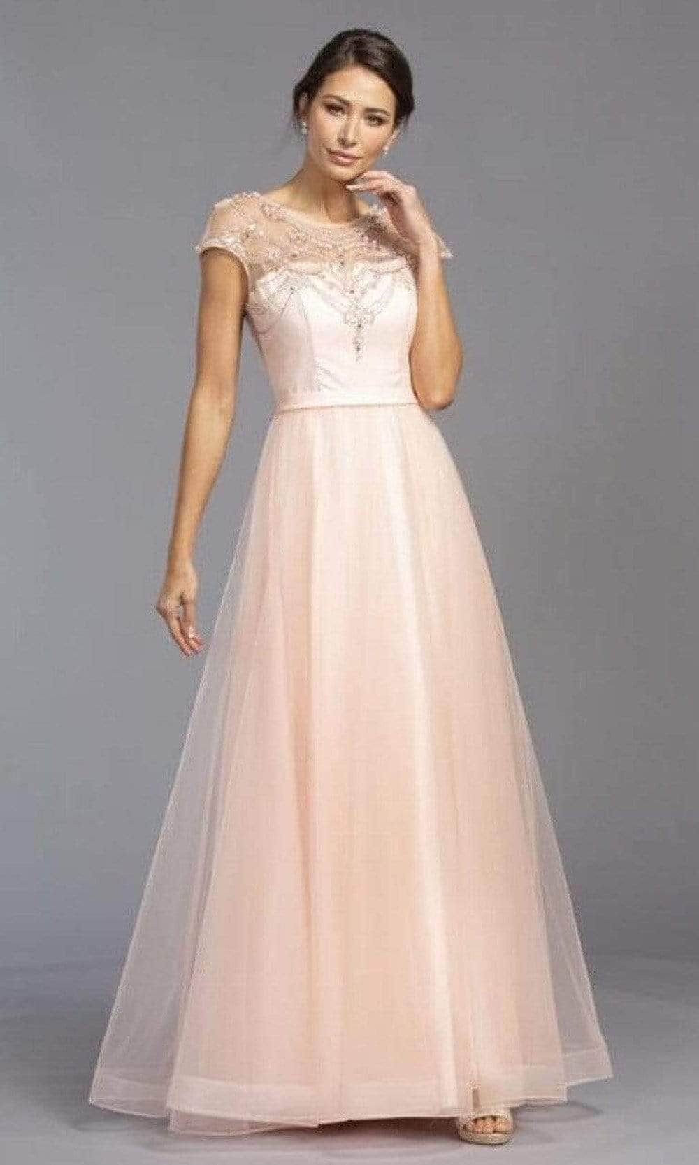 Display a feminine flair in this beautiful creation by Trevi Collection L2069. This dress showcases an illusion jewel neckline supported by cap sleeves in a beaded bodice with princess seams. Revealing an A-Line silhouette, this also shows a V back with back zipper closure. Exude a timeless appeal in this stylish Trevi Collection L2069 evening dress. Model is wearing the Blush color.
