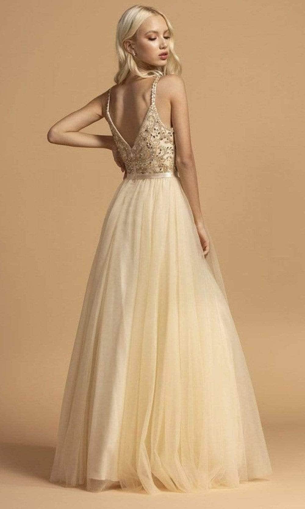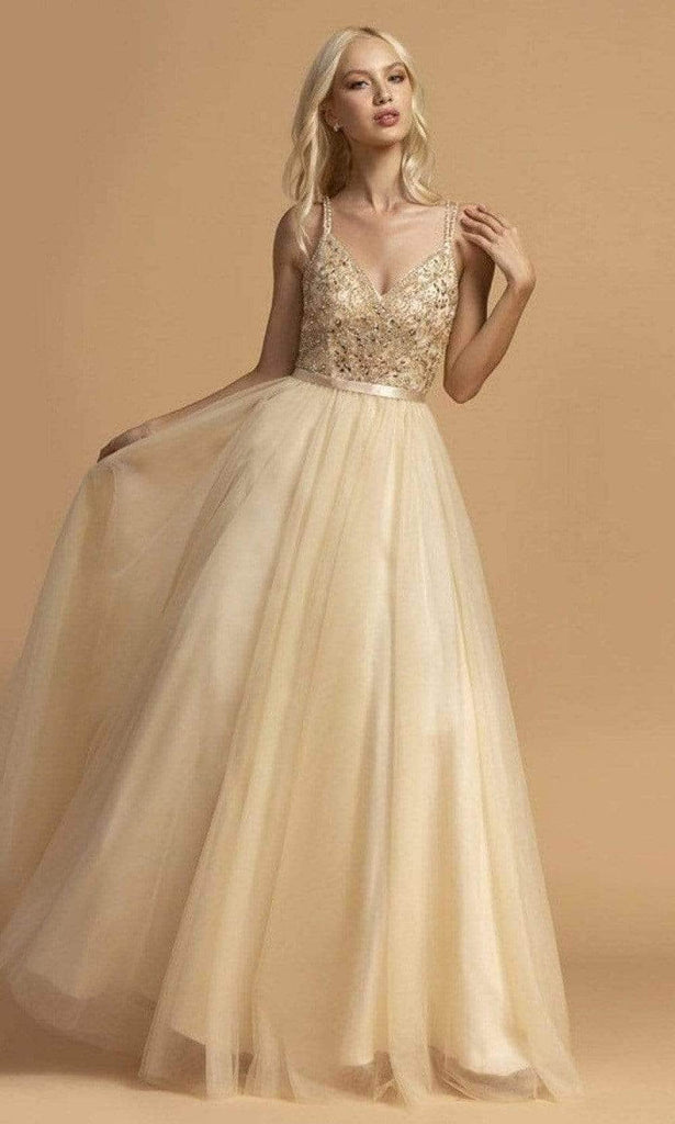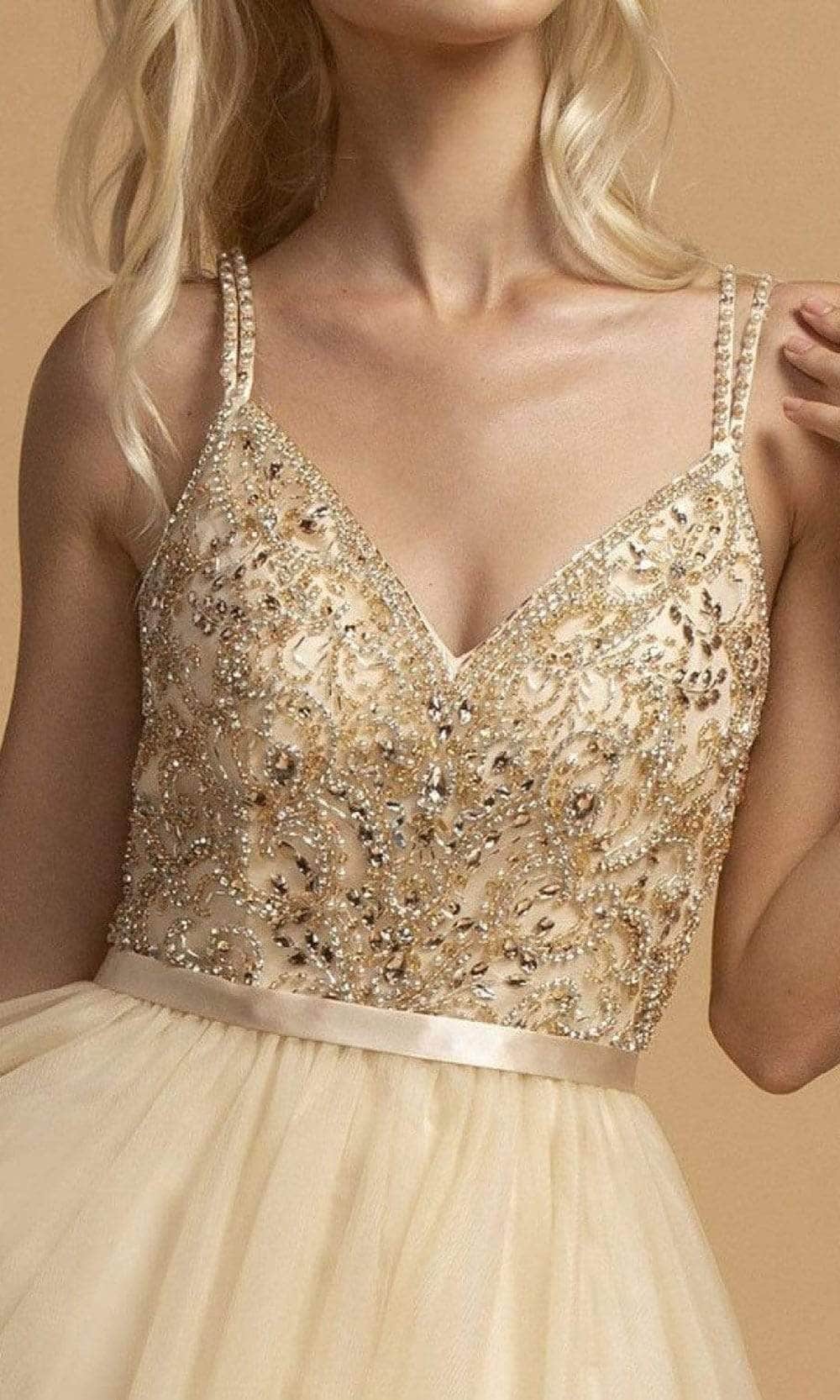 Exude a timeless appeal in this elegantly ornate Trevi Collection L2097 masterpiece. This evening dress highlights a V-neckline supported by thin straps in a beaded sleeveless bodice. Revealing an A-Line silhouette, this also shows a V-back with back zipper closure. Capture the glamour as you walk on this stunning gorgeous Trevi Collection creation. Model is wearing Champagne color.