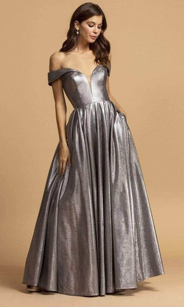 Be blown away by the sheer iridescence of this Trevi Collection L2152 creation. Tailored in a metallic silhouette, this stunner reveals a fold over accent on its off shoulder neckline with a plunging inset. Accented with a midrise back and a zipper closure, the skirt flares to the floor into a sleek A-line silhouette. Infuse your special in this Trevi Collection masterpiece. Model is wearing the Chrome color.