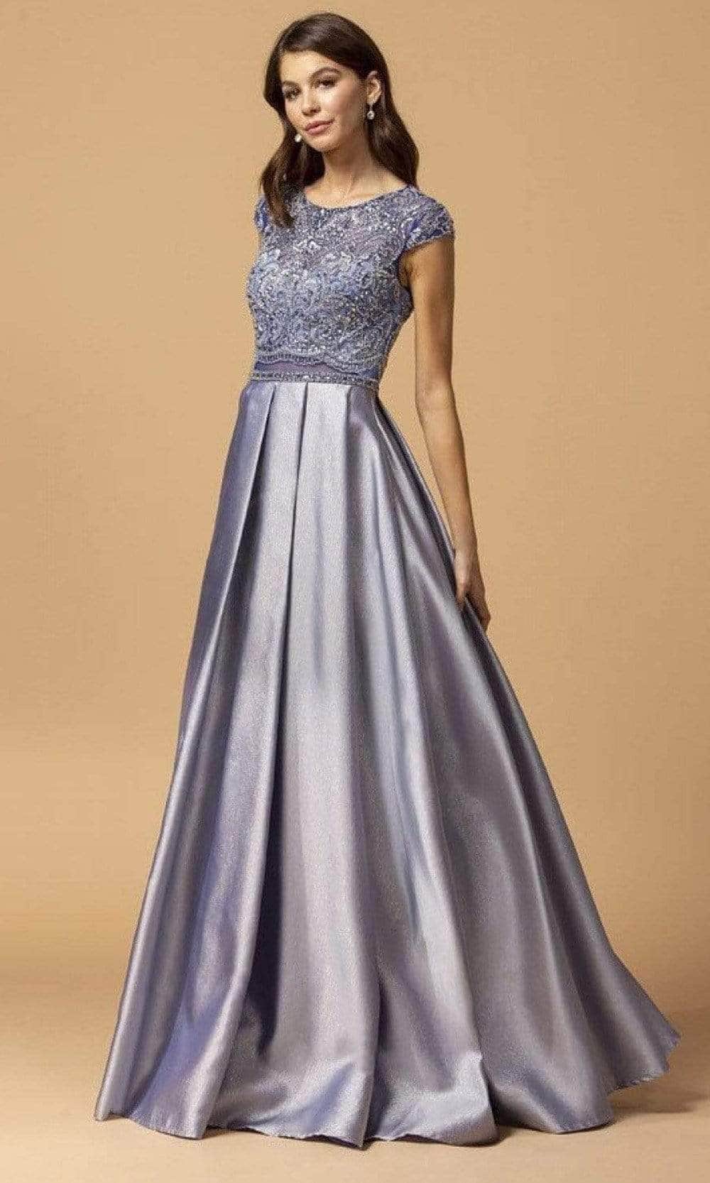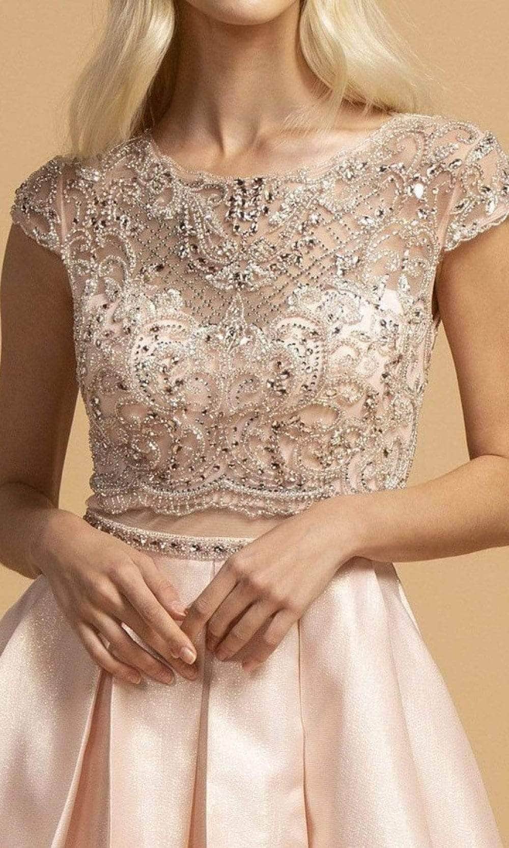 Render them speechless in this Trevi Collection L2157 masterpiece. Embellished with intricate beadwork on its sheer bodice, this dress features an illusion bateau neckline with a sheer back. Framed with cap sleeves and flaunting a faux two-piece design, the box-pleated skirt flares into a Mikado A-line silhouette and train. You'll be envied in an unbeatable dress from Trevi Collection L2157. Models are wearing the Blush, and Navy colors.