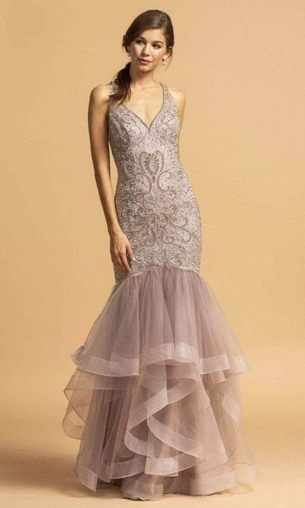 Bring a breathtaking new look to prom night in this stunning Trevi Collection L2163 evening dress. This dress showcases a V-neckline in a sleeveless beaded bodice. Revealing a trumpet silhouette with tiered skirt, this also shows a full back to complete the look. Look and feel glamorous in this Trevi Collection creation.