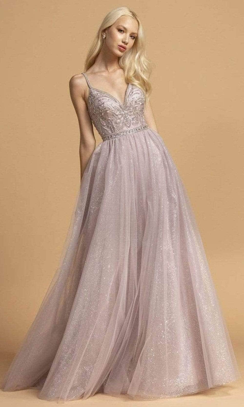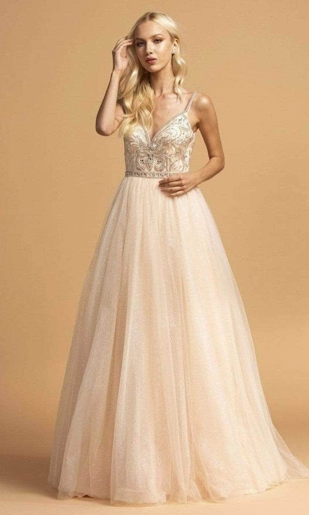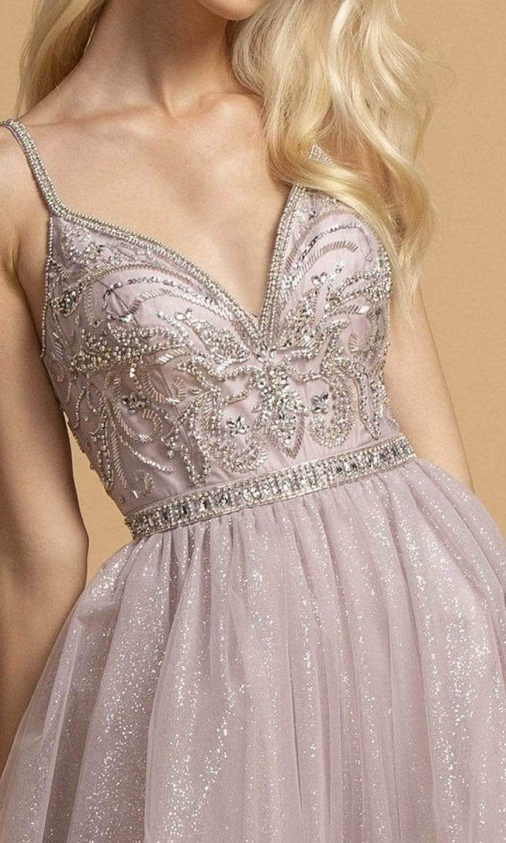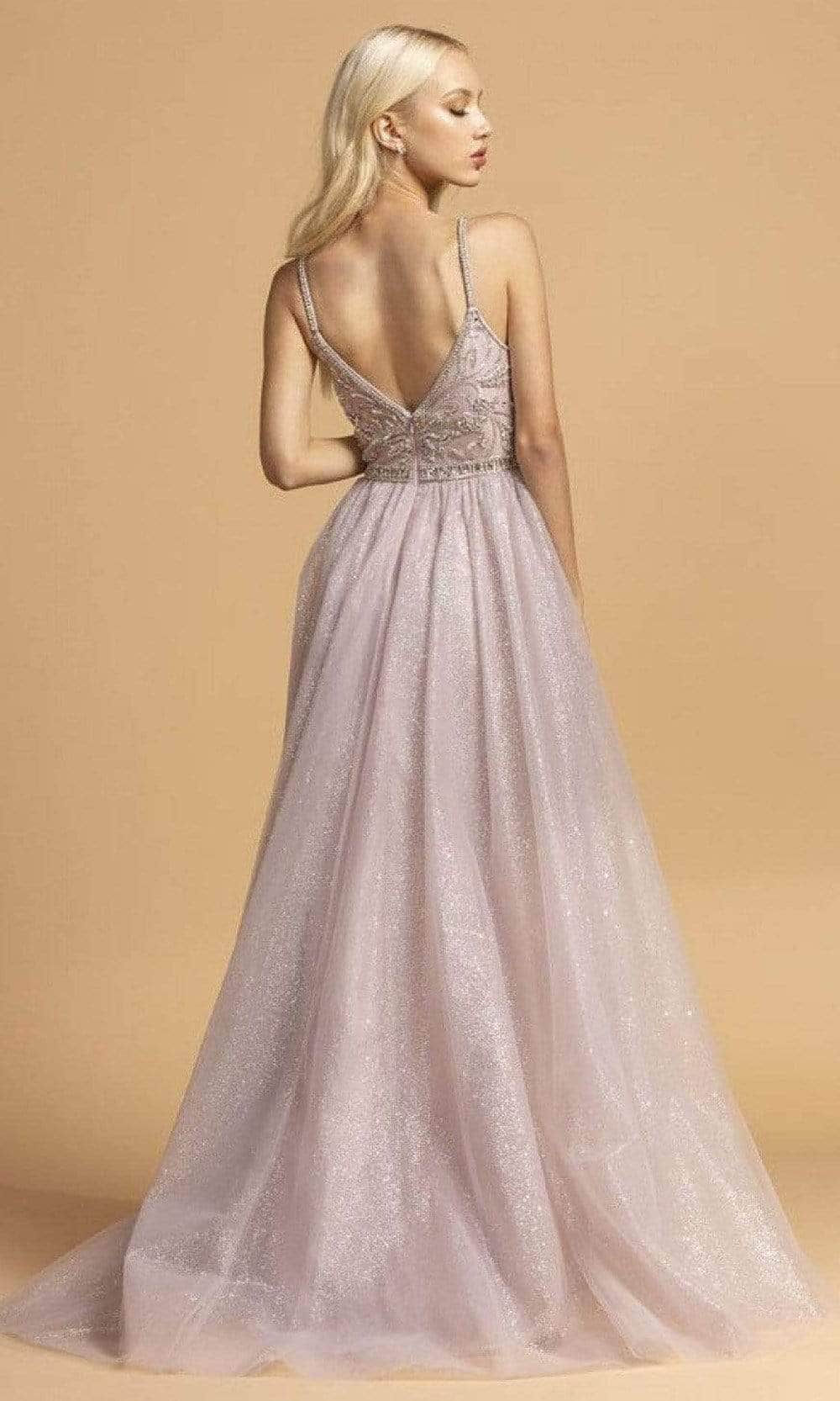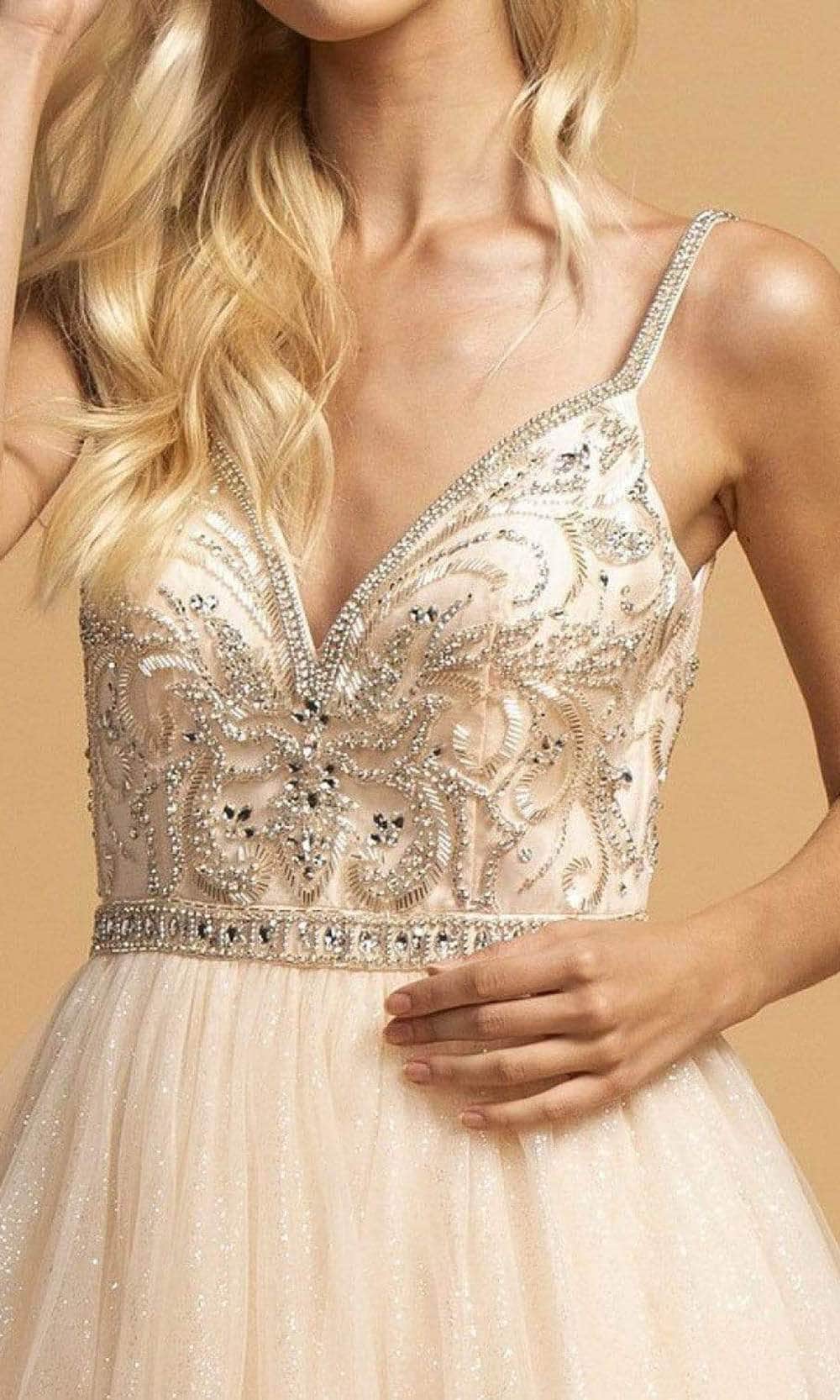 Feel dainty and feminine in this enchantingly designed Trevi Collection L2167 creation. This evening dress showcases a plunging V-neckline supported by thin straps in a beaded and glittery bodice. Revealing an A-line silhouette, this also shows a V back with back zipper closure. Inspire awe as you live the dream of a romantic night in this Trevi Collection masterpiece.