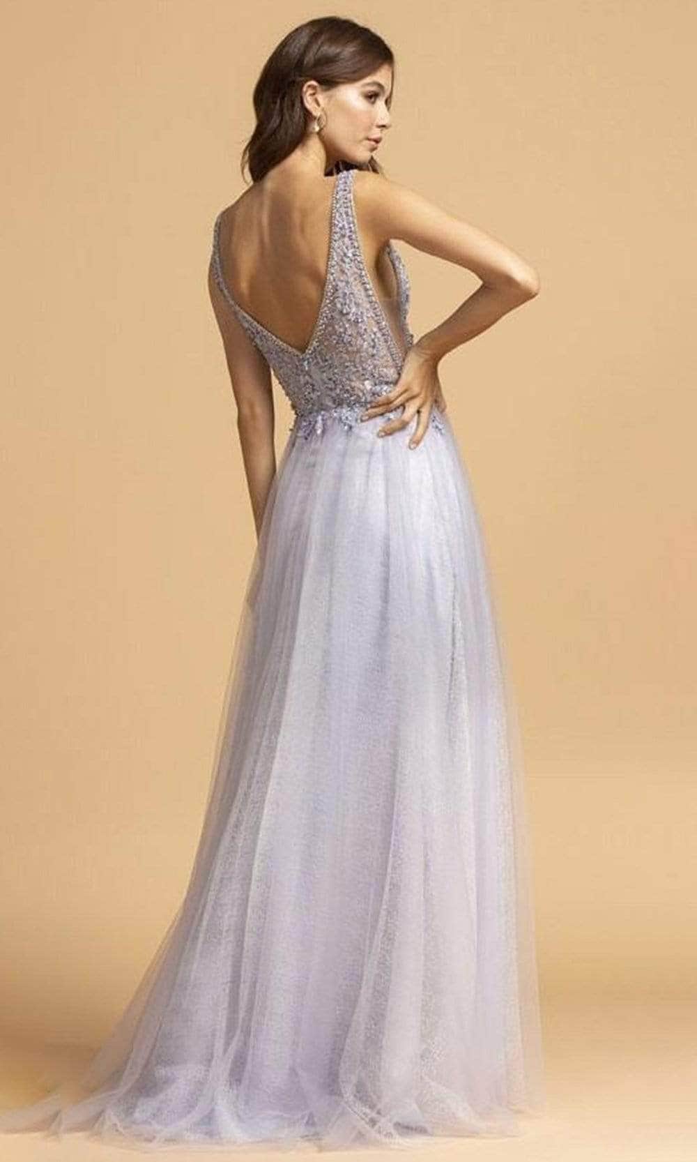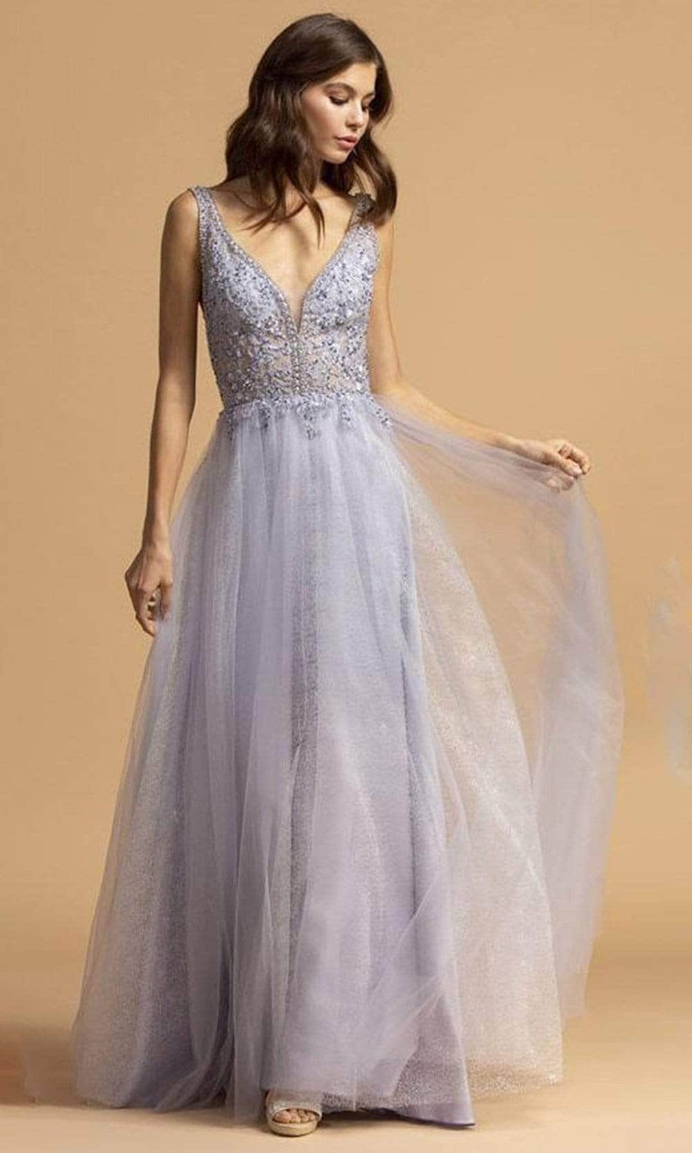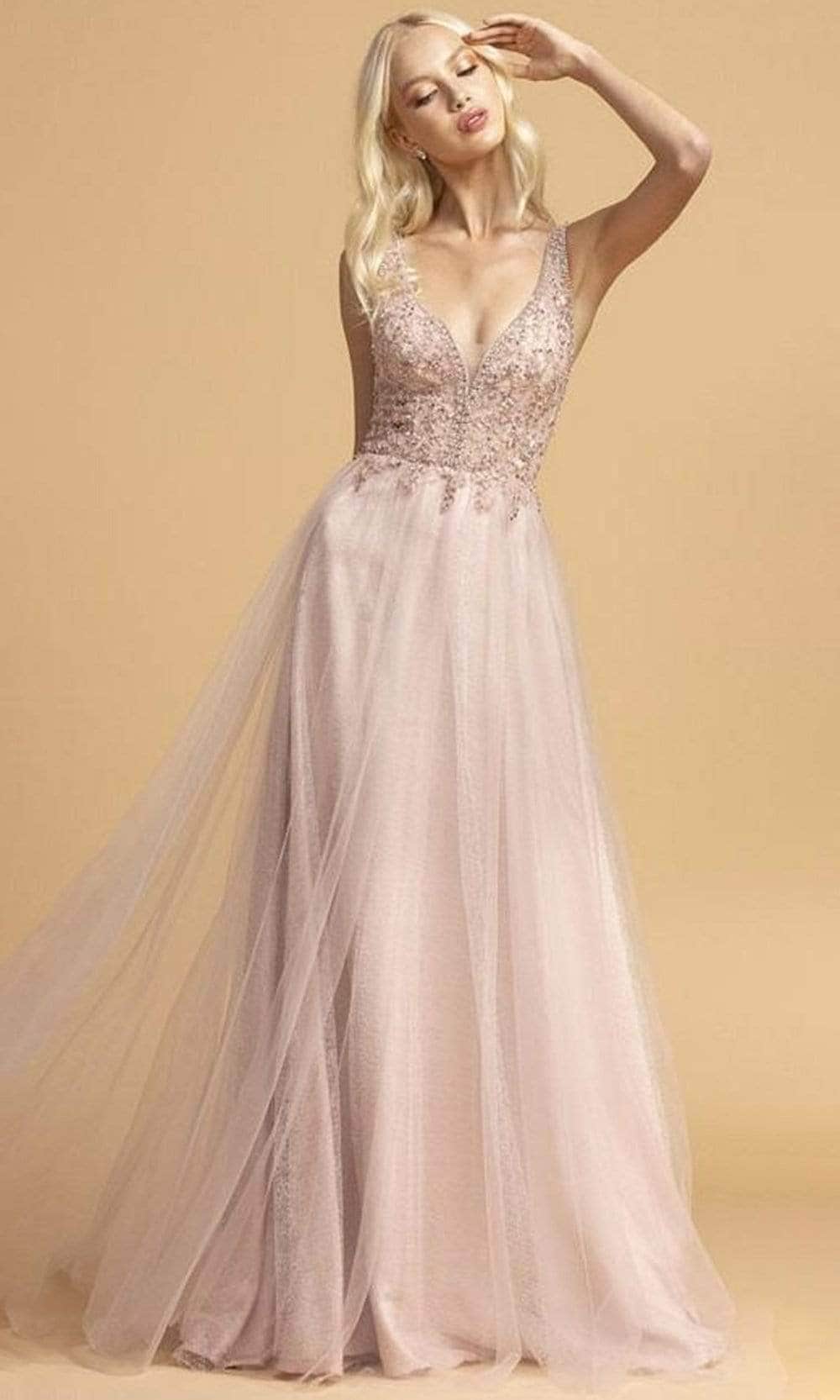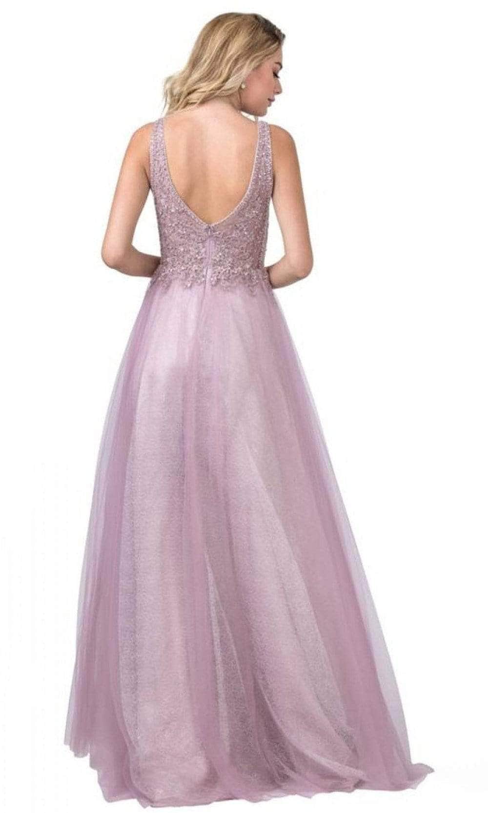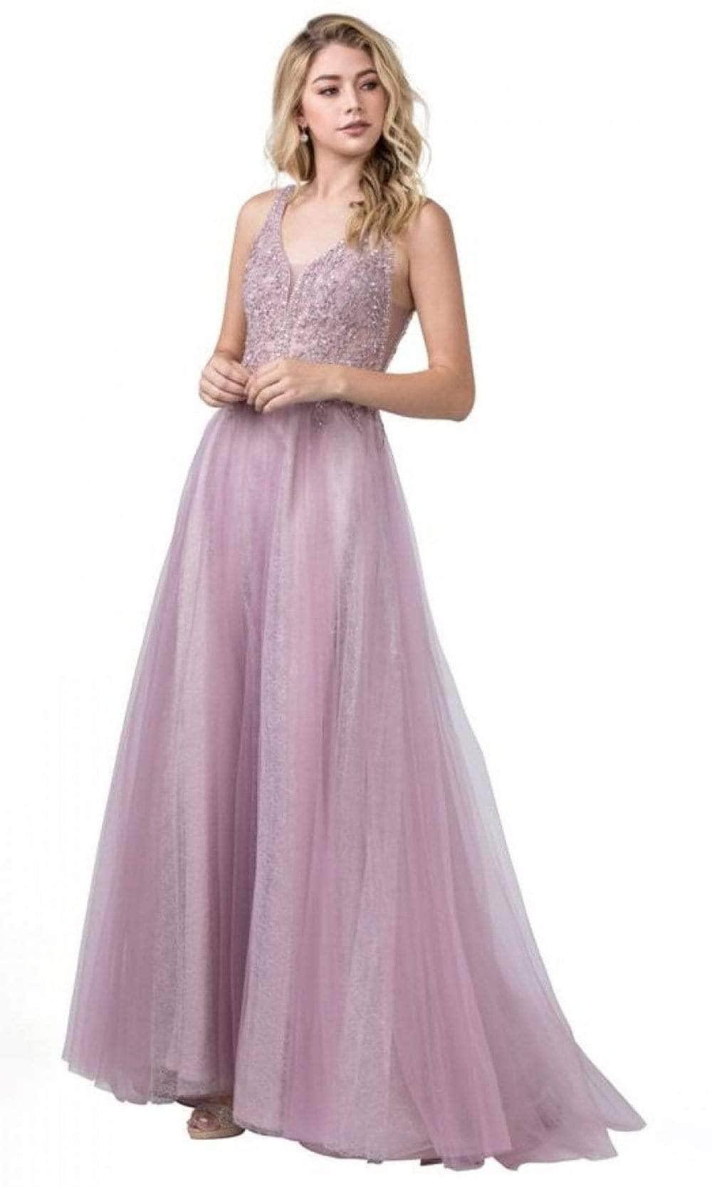 Remain at the top of the best-dressed list in this fascinating Trevi Collection L2179 creation. Adorned with adorned with beads and lace appliques, this stunner reveals a deep v-neckline with a sheer inset. The sheer bodice is complemented with a v-open back and a zipper closure. The tulle skirt creates an A-line silhouette with a train. Take them with overwhelming allure in this Trevi Collection masterpiece. Models are wearing the Mauve, Misty Lilac and Pewter colors.