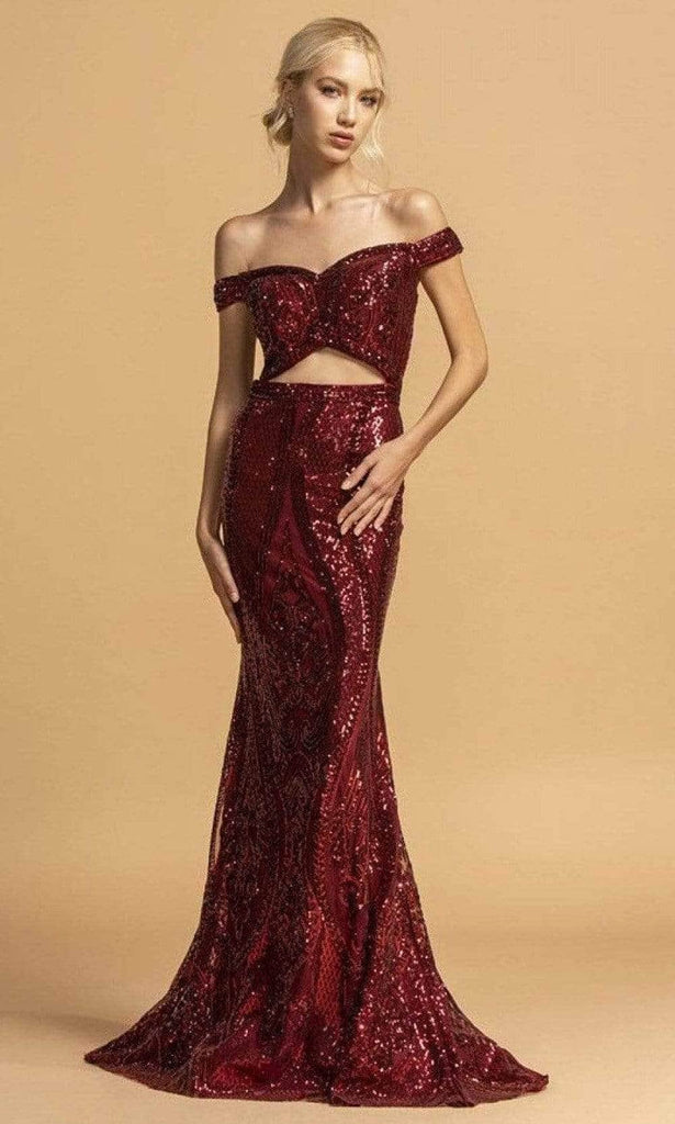 The night is yours in a spectacular Trevi Collection L2199 evening dress. This dress highlights an off shoulder neckline in an embellished two piece bodice. Revealing a sheath silhouette, this also displays a mid-open back with back zipper closure. Dive into a divine event in this luxe Trevi Collection creation.