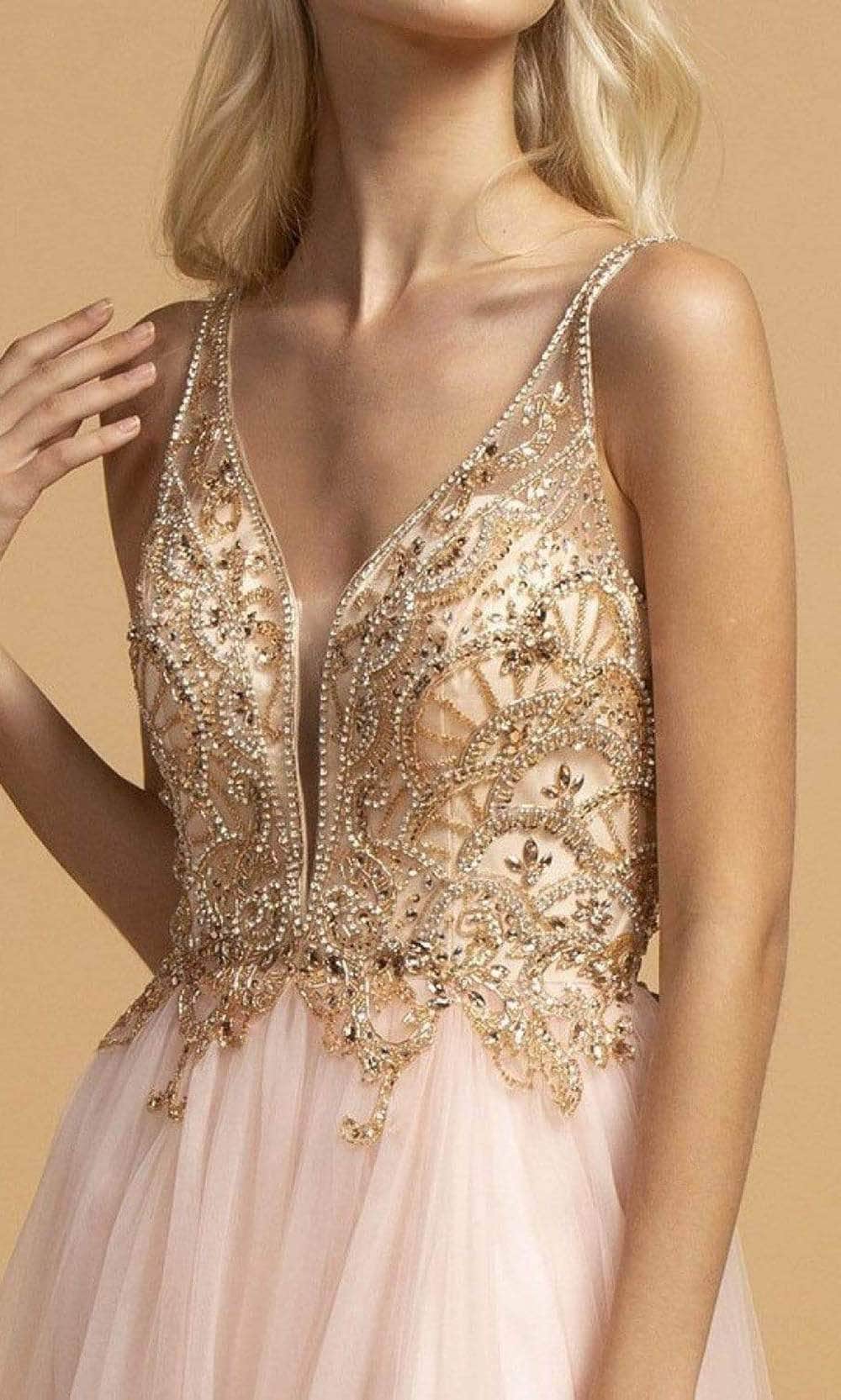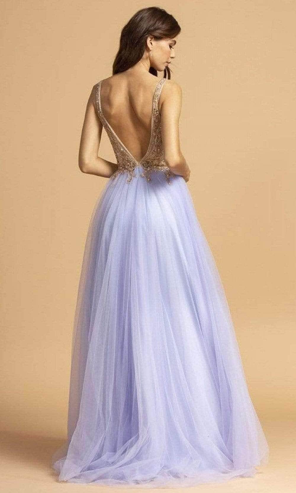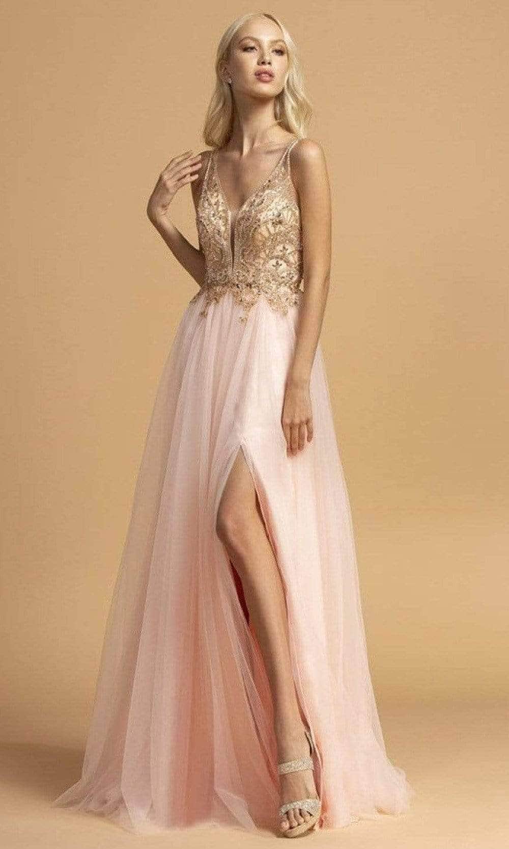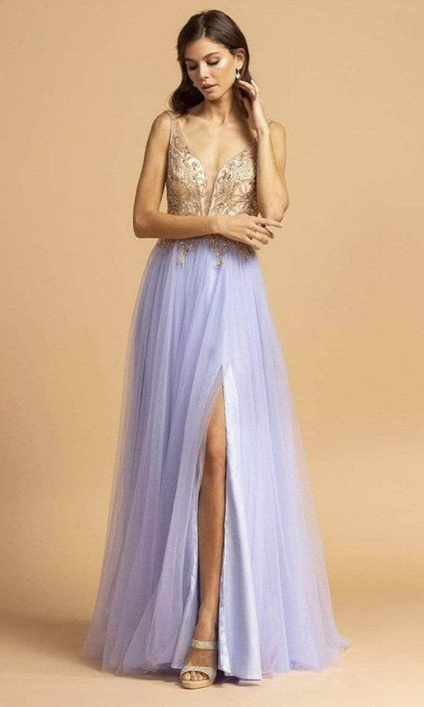 Look fresh and pretty in this Trevi Collection L2239 evening dress. This dress highlights a plunging V-neckline in a beaded bodice. Revealing an A-line silhouette skirt with slit, this also shows a V back with back zipper closure. Be strikingly gorgeous in this Trevi Collection creation.