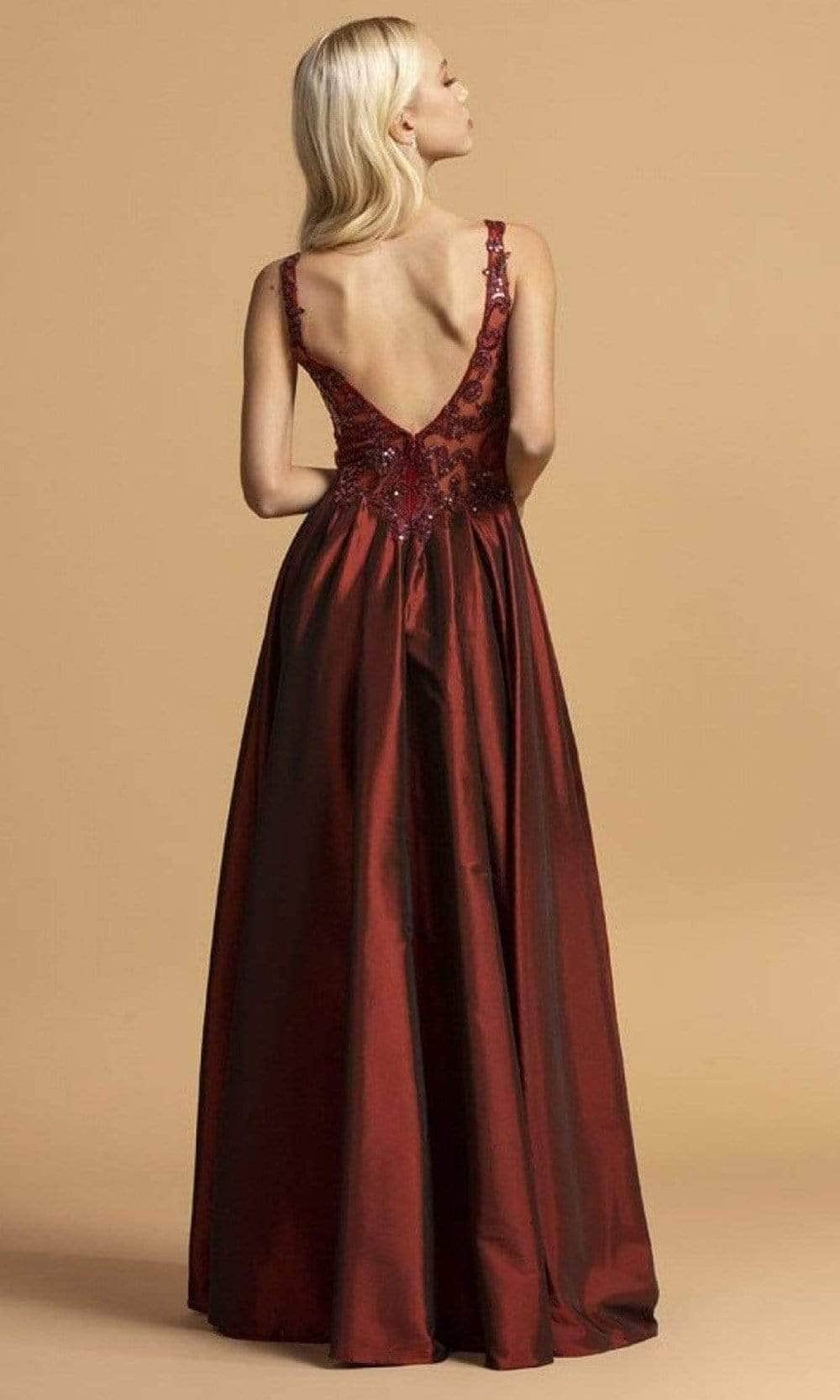 Fall in love with the stunning beauty of this Trevi Collection L2241 masterpiece. Adorned with embroidered details, beads and sequins, this sleeveless dress shows a v-neckline coupled with a v-open back. Highlighted with a side slit, the taffeta skirt flares into a full-length hemline. Be adored by the beautiful crowd in this Trevi Collection masterpiece. Model is wearing the Burgundy color.