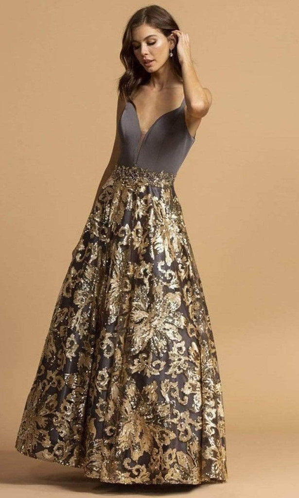 Bask in the iridescence and chic style of this Trevi Collection L2245 creation. This sleeveless dress features an unadorned bodice with a plunging sweetheart neckline and a tonal inset. Crafted with a low v-open back, metallic lace appliques streams to the floor with a sequin iridescent silhouette. Reflect a sterling sense of style in this Trevi Collection masterpiece. Models are wearing the Charcoal Gold and Navy Gold colors.