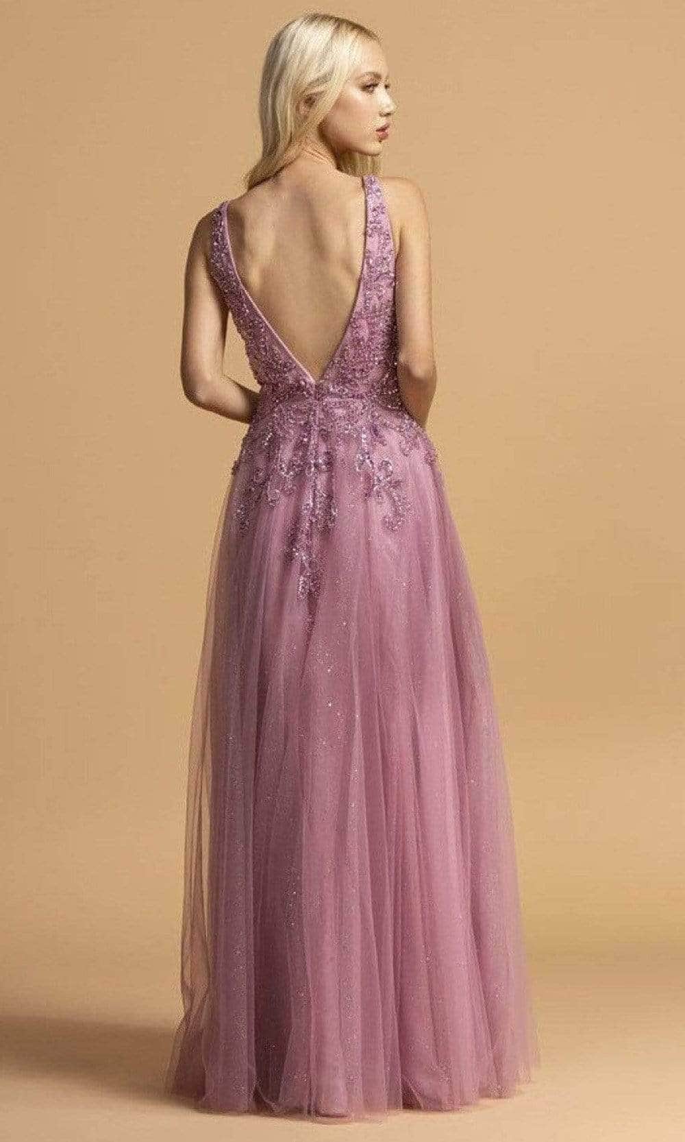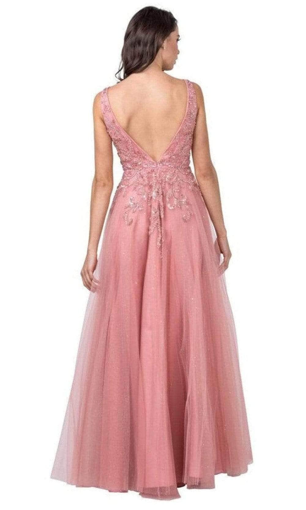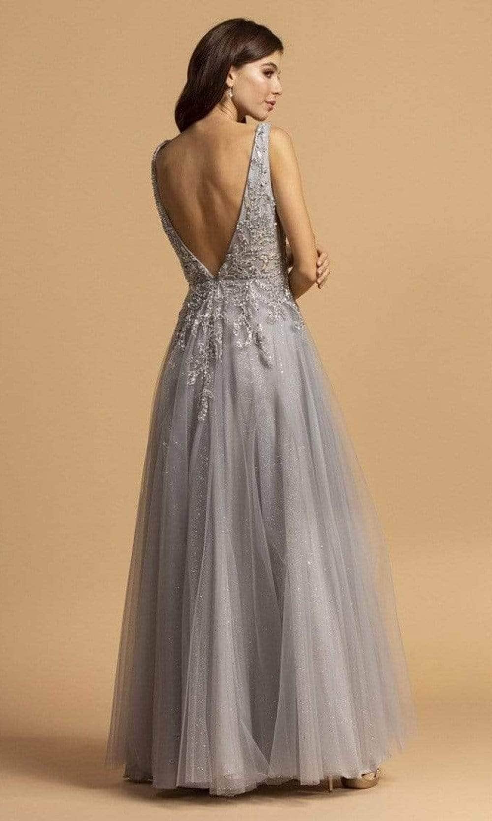 Details: Tulle, Sleeveless, Illusion Inset, Deep V-Open Back, Zipper Closure, Glitter Skirt, Full Length Hem