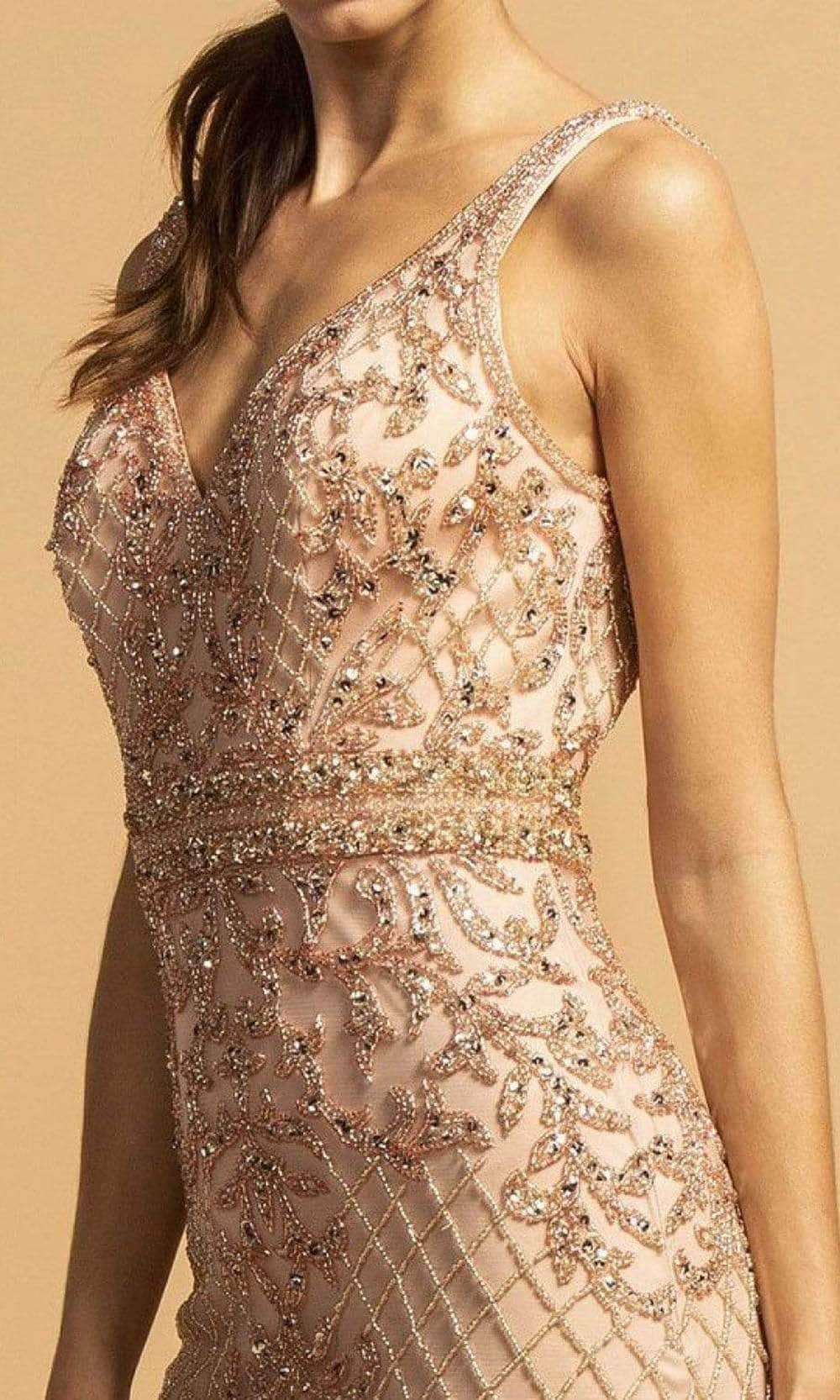 Promote attention-grabbing style in this spectacular Trevi Collection L2264 creation. A elegant dress that features a v-neck neckline and sleeveless. This dress is design with beads embellishment throughout. It will make you shine through the night. It can show your great shape. It also has a waistband that is made with beads embellishment. The low v-back is for sexy and alluring look. It has a zipper in the back for closure. Flatter your finest assets as you enthrall the crowd in this Trevi Collection L2264 masterpiece. Model is wearing the Rosegold color.