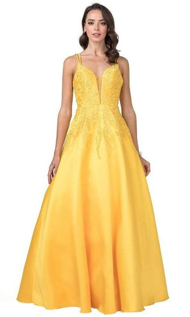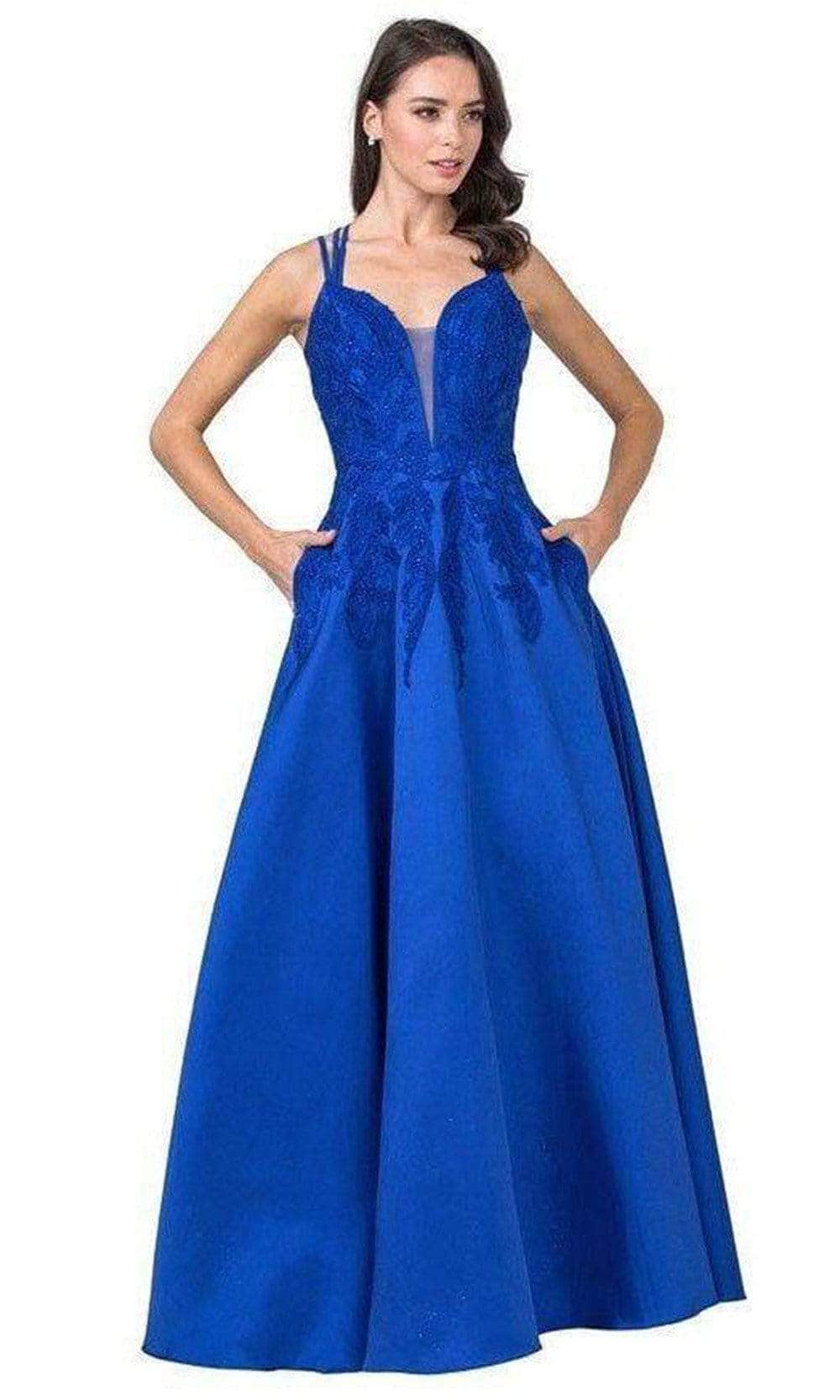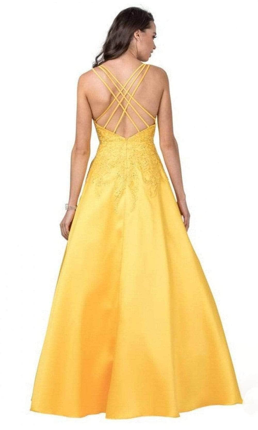 Take your time to shine in this sumptuous Trevi Collection L2401 creation. Crafted with tonal embroidery and beadwork, this stunner reveals a plunging v-neckline with a sheer inset. The back has a strappy design. Glinting with stones, the skirt flares into a fluttering full-length hemline. State your signature style in this sophisticated Trevi Collection masterpiece. Models are wearing the Marigold, Royal and Magenta colors.