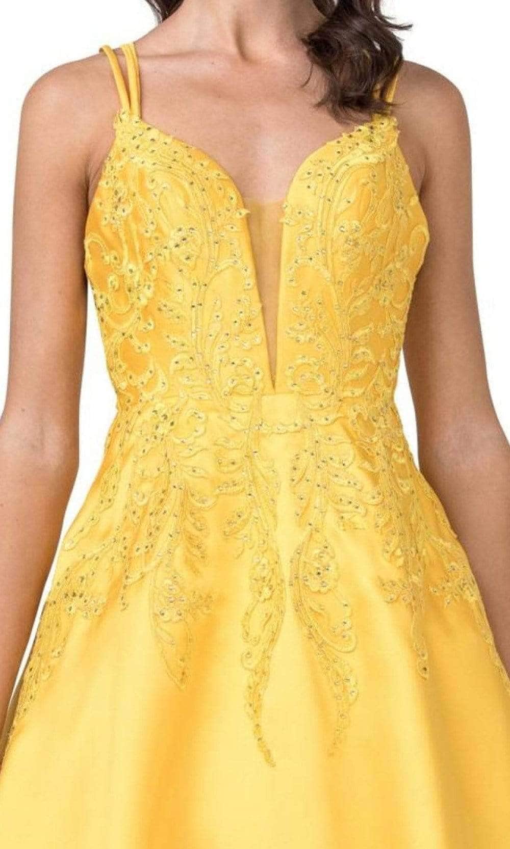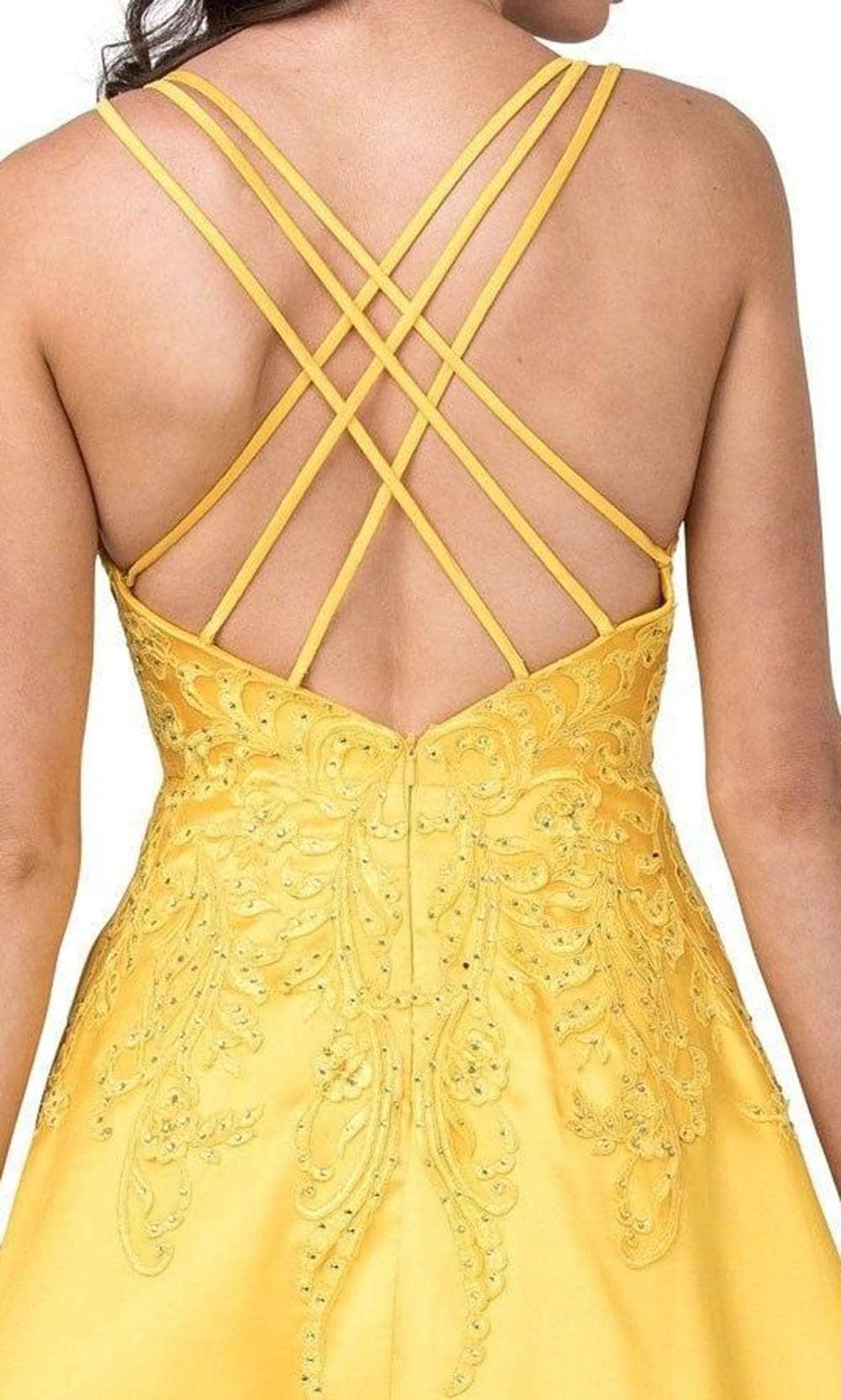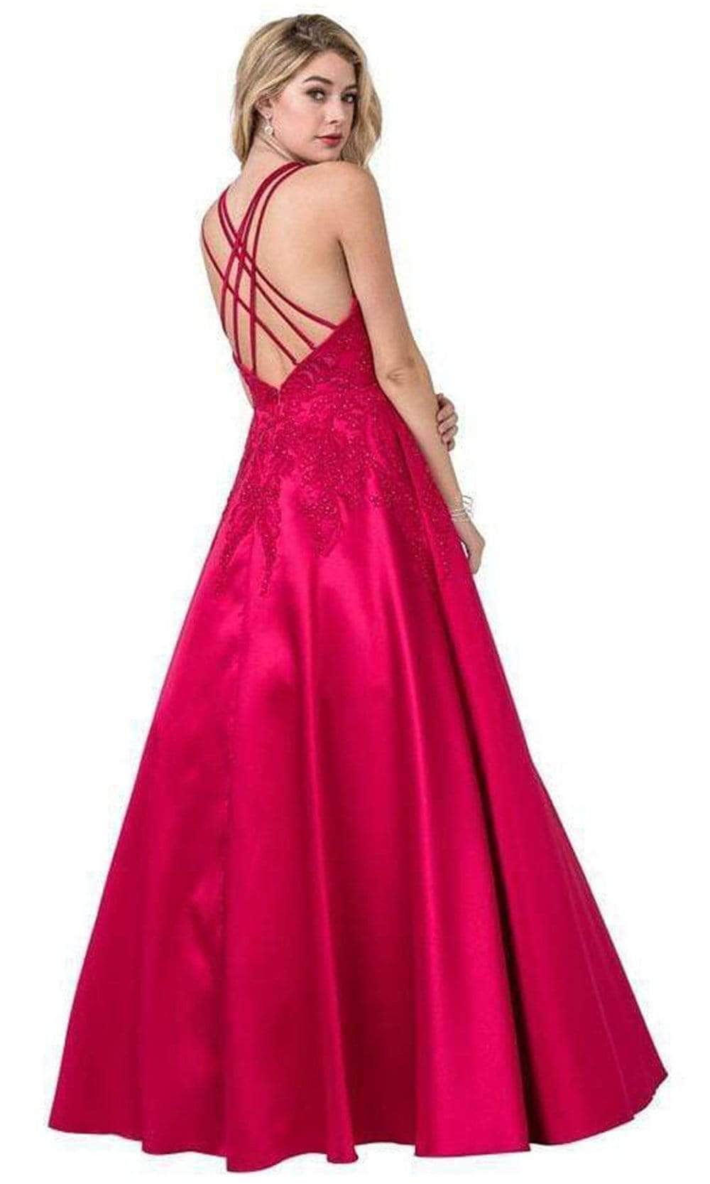 Take your time to shine in this sumptuous Trevi Collection L2401 creation. Crafted with tonal embroidery and beadwork, this stunner reveals a plunging v-neckline with a sheer inset. The back has a strappy design. Glinting with stones, the skirt flares into a fluttering full-length hemline. State your signature style in this sophisticated Trevi Collection masterpiece. Models are wearing the Marigold, Royal and Magenta colors.