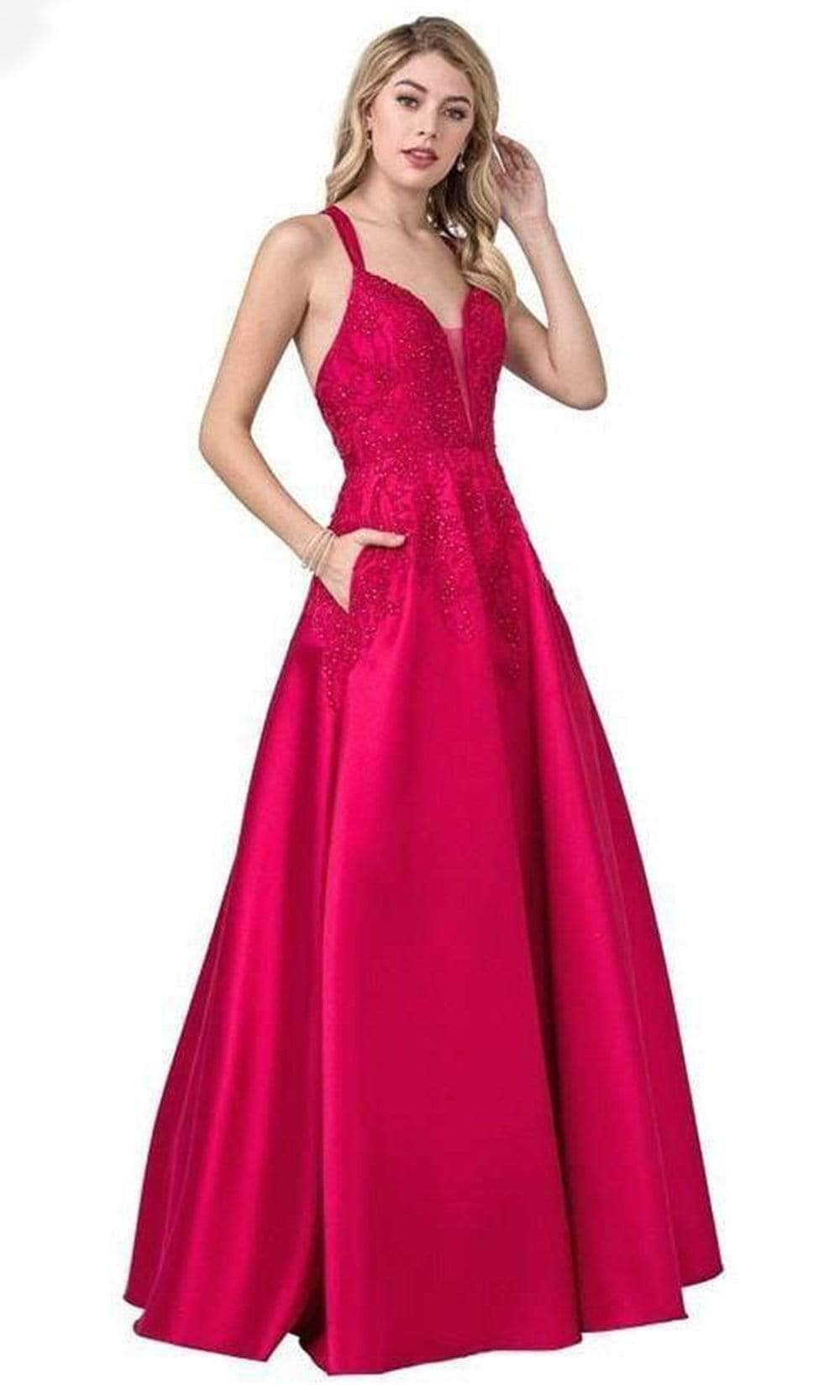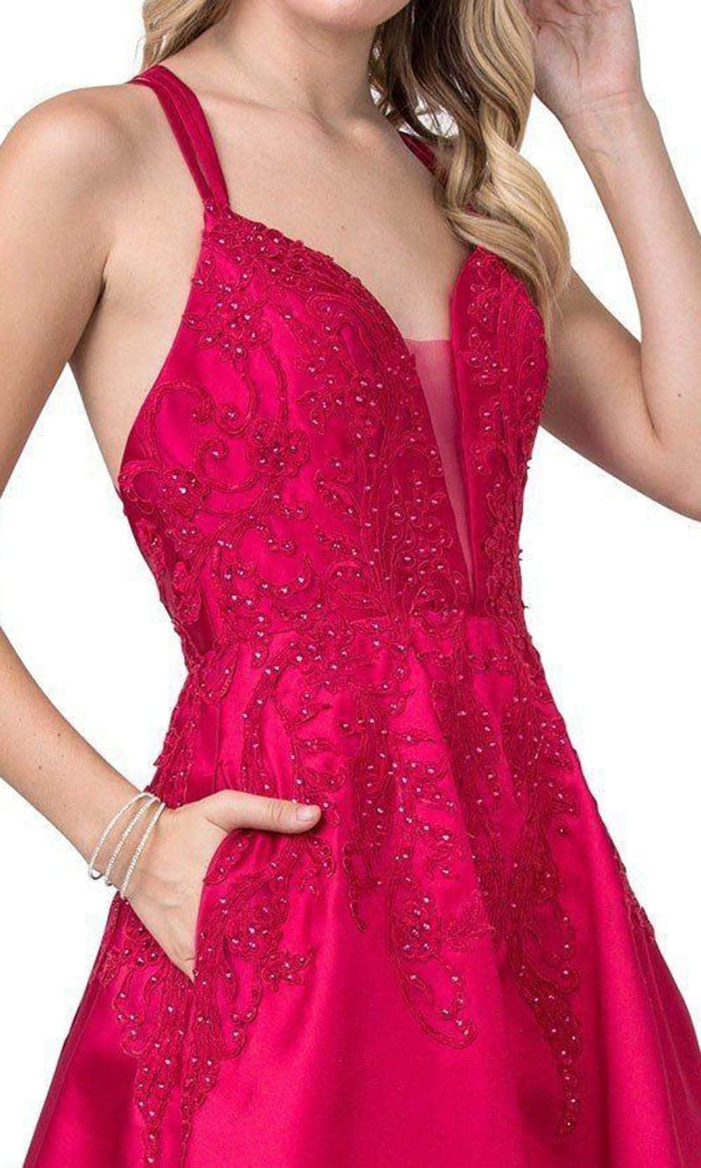 | Details: | Satin, Embroidery, Beaded, Strappy Back, Pockets, Illusion Inset, Zipper Closure, Full Length Hem |