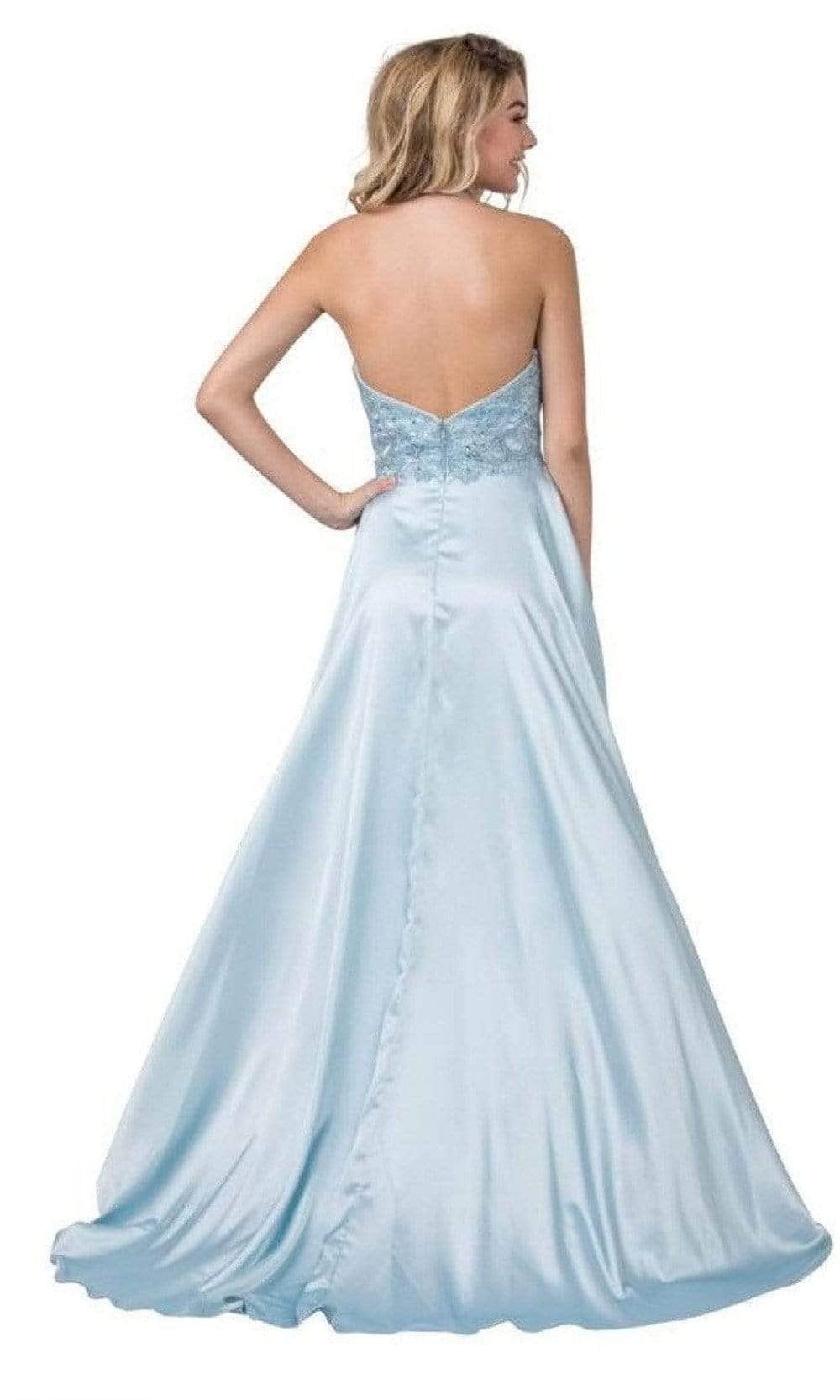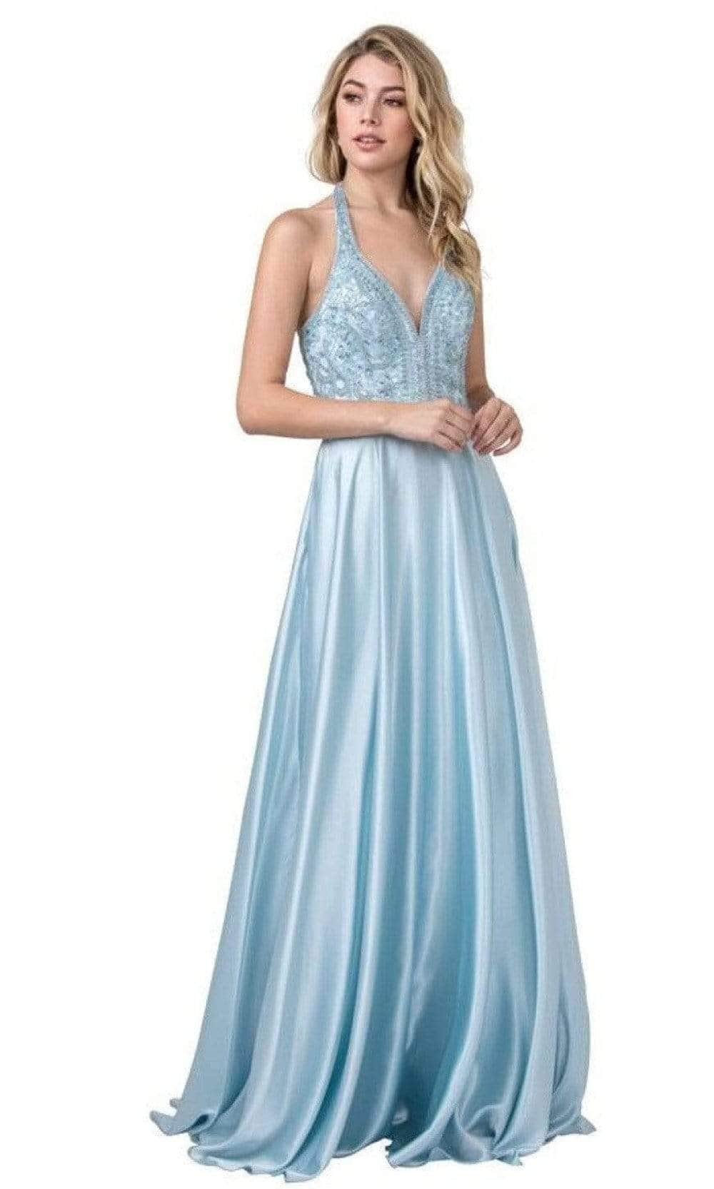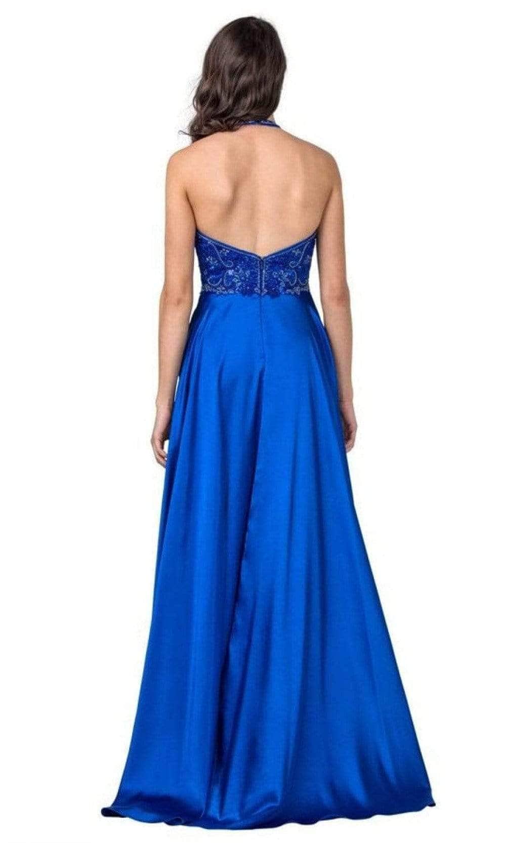 Be the talk of the town when you glide into the ballroom in this Trevi Collection L2405 creation. Adorned with intricate tonal beads and sequins, this piece showcases a plunging halter neckline with a midrise back. The sleek A-line skirt flutters into a sweeping finish. Grace that stunning party with poise in this Trevi Collection masterpiece. Models are wearing the Ice Blue and Royal colors.