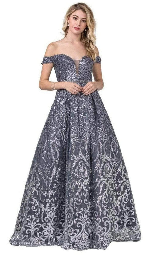 Look good and feel good with this Trevi Collection L2414 evening dress. This dress showcases an off shoulder neckline in a sequin embellished bodice. Revealing an A-line silhouette, this also shows a mid-open back with lace up back and back zipper closure. Trevi Collection creation is sure to be an attention-grabber in any occasion.