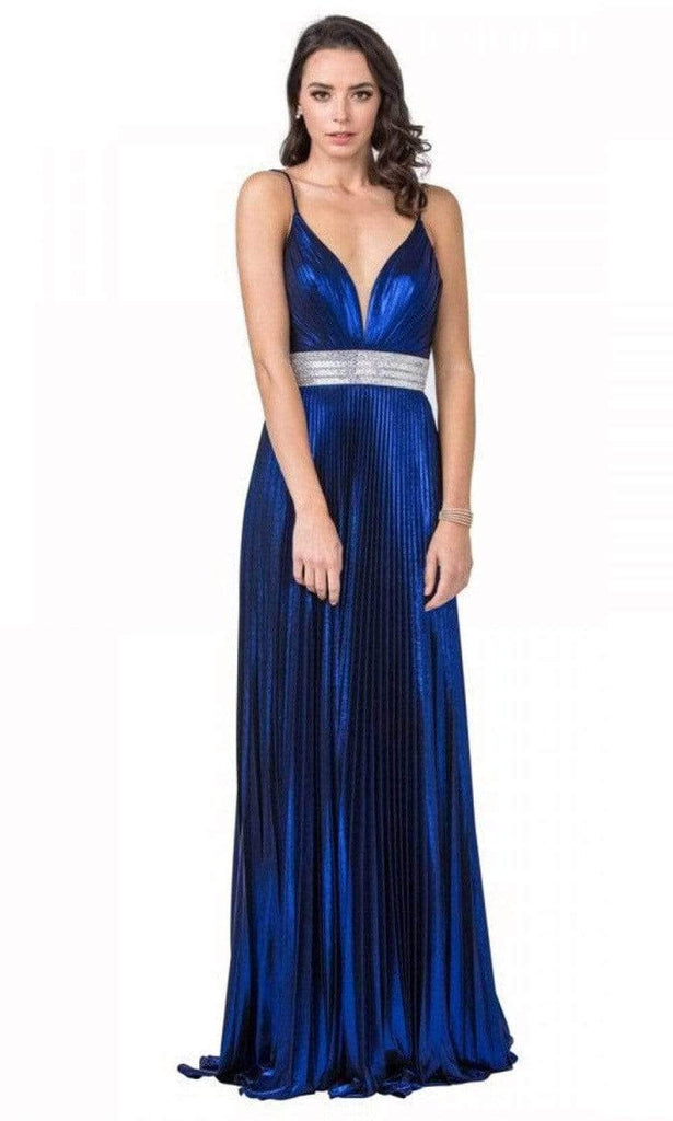 Promote attention-grabbing style in this stunning Trevi Collection L2444. Using metallic fabric gives a shiny effect on this flowy pleated A-line gown. It features a plunging V neckline, a waist band is added to enhance your shape. It flows in full length with a smooth sweep train finish. Back is open and uses back zipper as closure. Trevi Collection will let you shine like the star that you are.