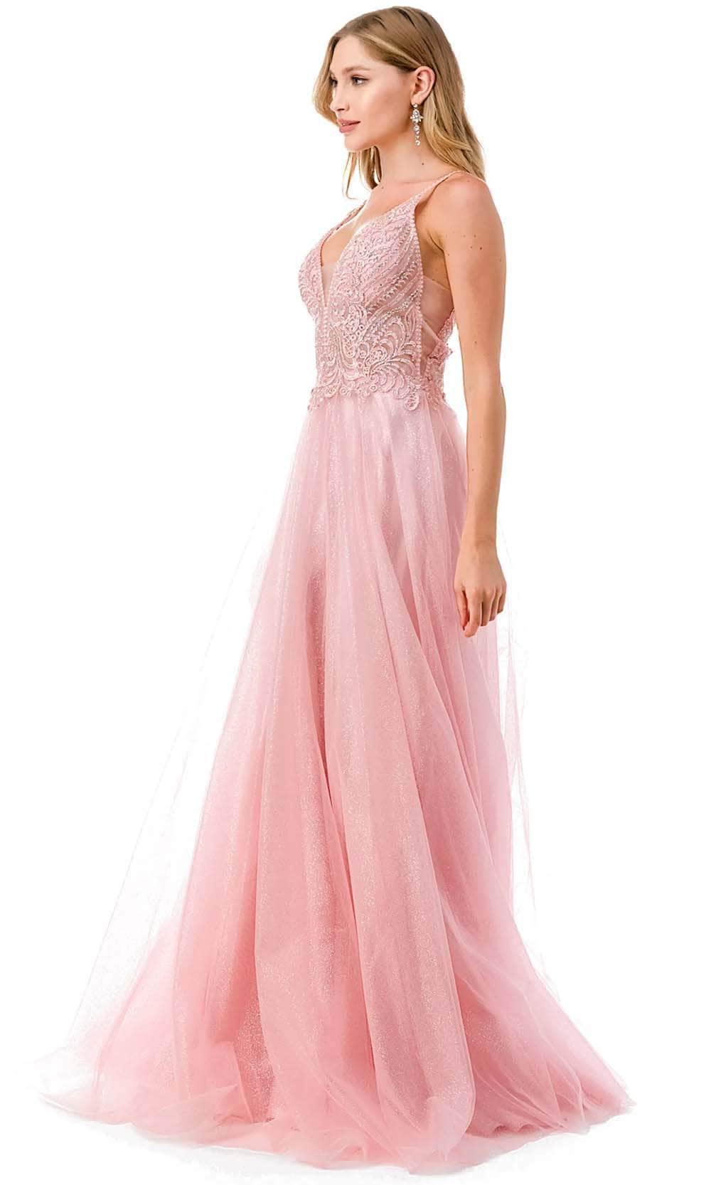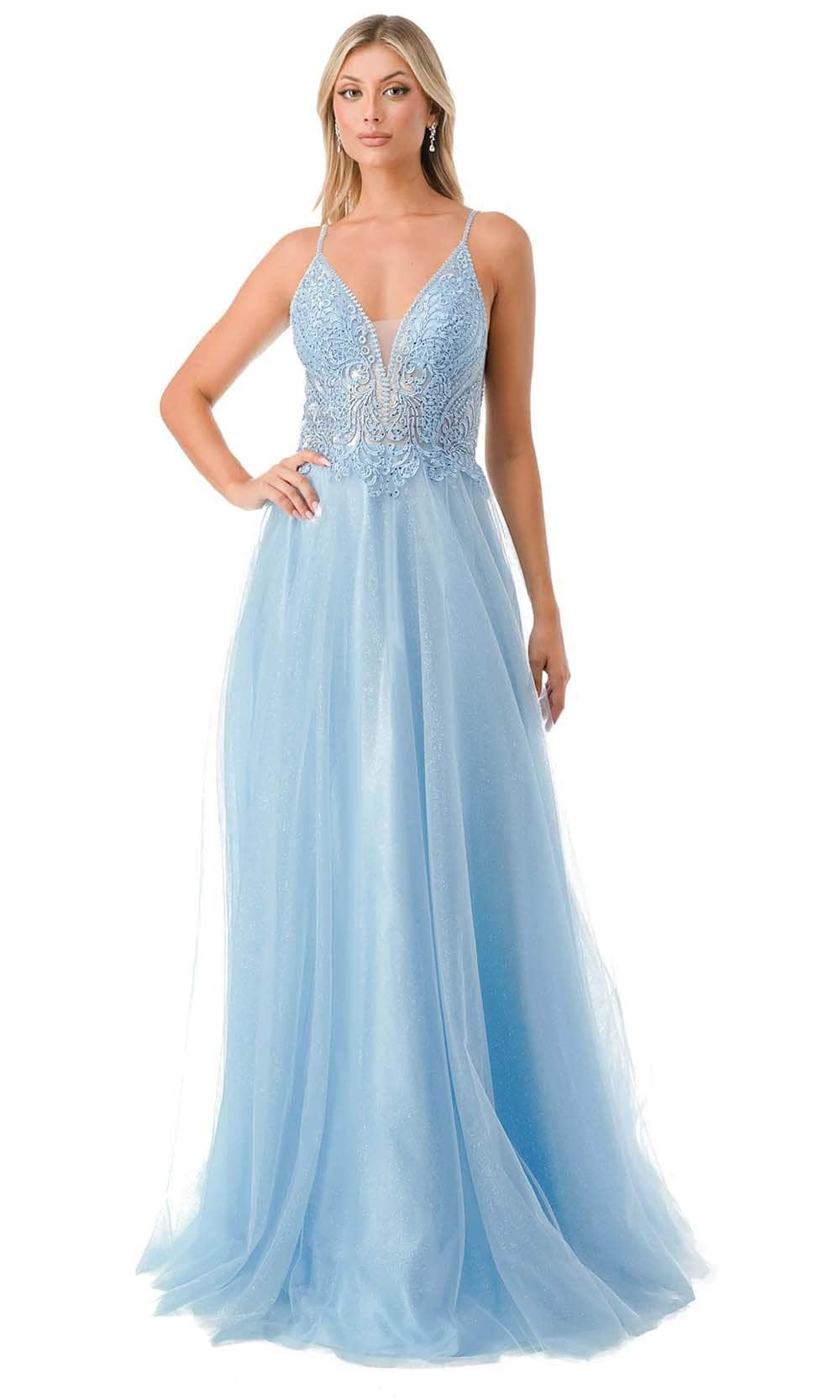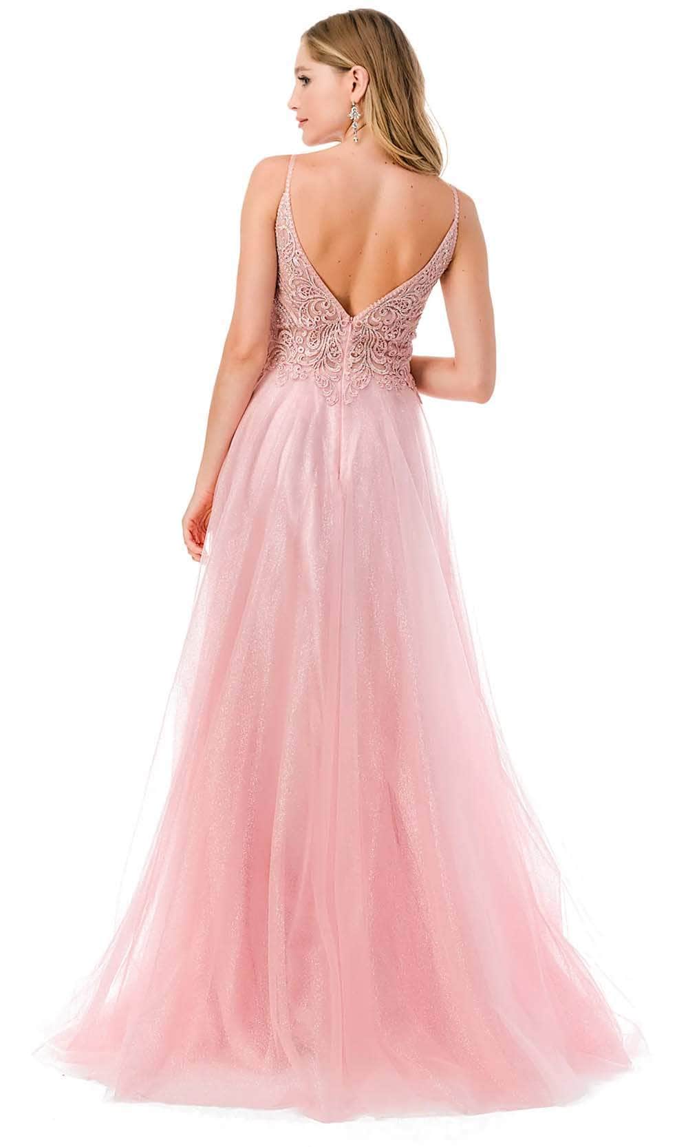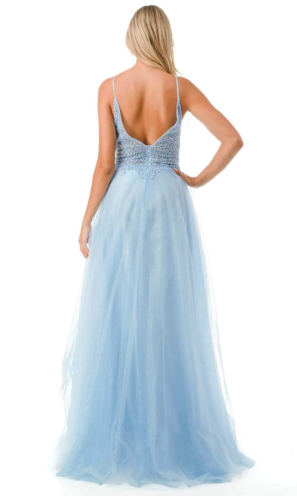 Get camera-ready and embrace the spotlight with this breathtaking Trevi Collection L2688 creation. Stylishly detailed with embroidered lace appliques accented with glittering rhinestones, this stunner flatters with a v-neckline and an illusion overlay. Stringed with spaghetti straps that trail down the bodice and the deep v-open back, the ethereally layered skirt forms an A-line silhouette as it cascades to the floor with a sweeping denouement. Be caught off guard by the spectacular allure of this Trevi Collection L2688 masterpiece. Models are wearing the Blush and Light Blue colors.
