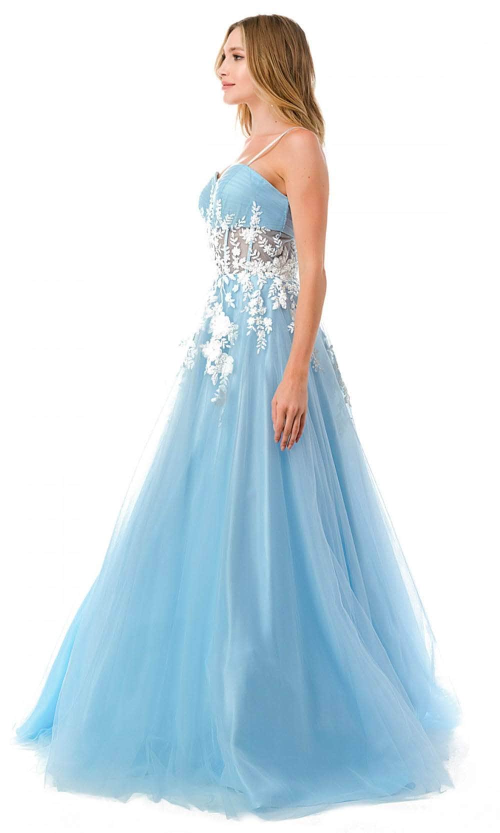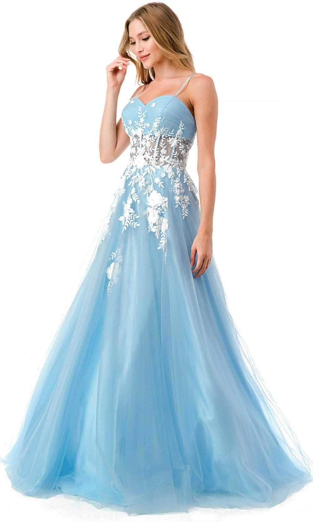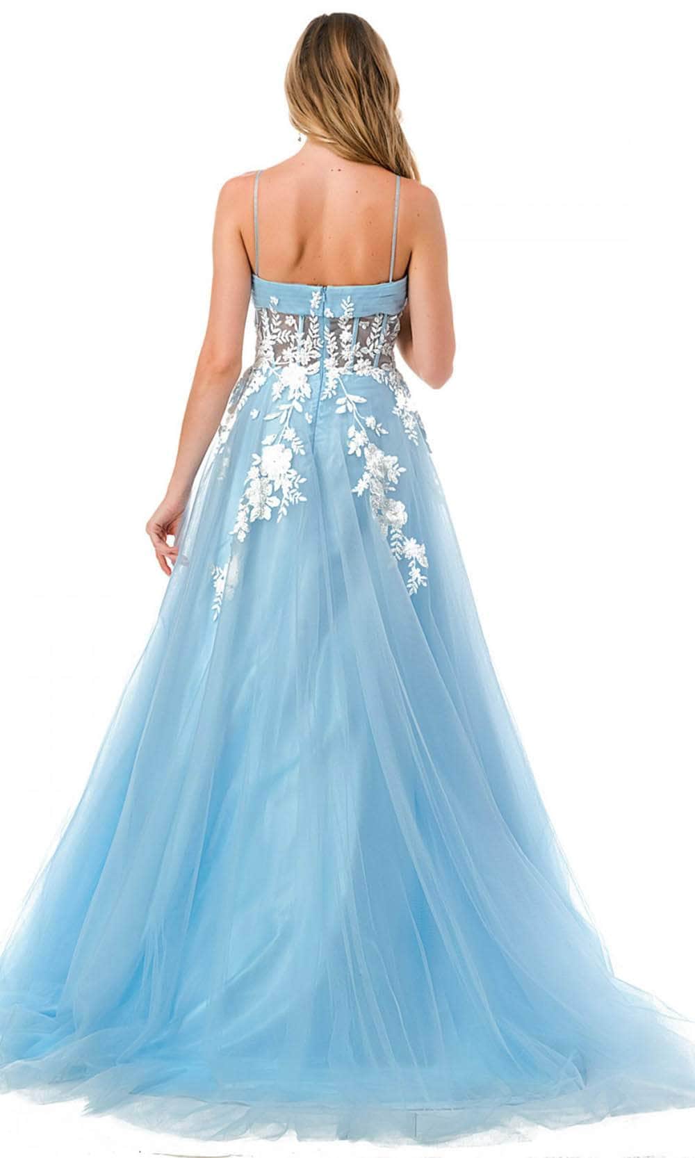 Indulge in a fairy tale fantasy with Trevi Collection L2778B, a captivating prom gown that radiates grace and allure. The sleeveless corset bodice is a canvas of intricate lace appliqué, resembling an enchanting garden in full bloom, and crowned with a romantic sweetheart neckline that adds a touch of charm. The mid-open back, complemented by a back zipper closure, invites a hint of mystery. The ballgown silhouette gracefully cascades to the floor, exuding elegance with every step, and the dress is adorned with a stunning train, ensuring your presence leaves a lasting impression. Prepare to dance the night away in this exquisite Trevi Collection L2778B masterpiece, where dreams and elegance unite. Model is wearing Ice Blue color.