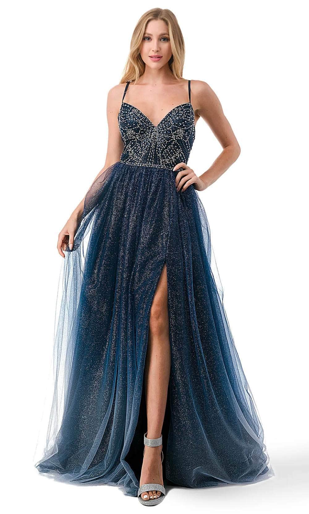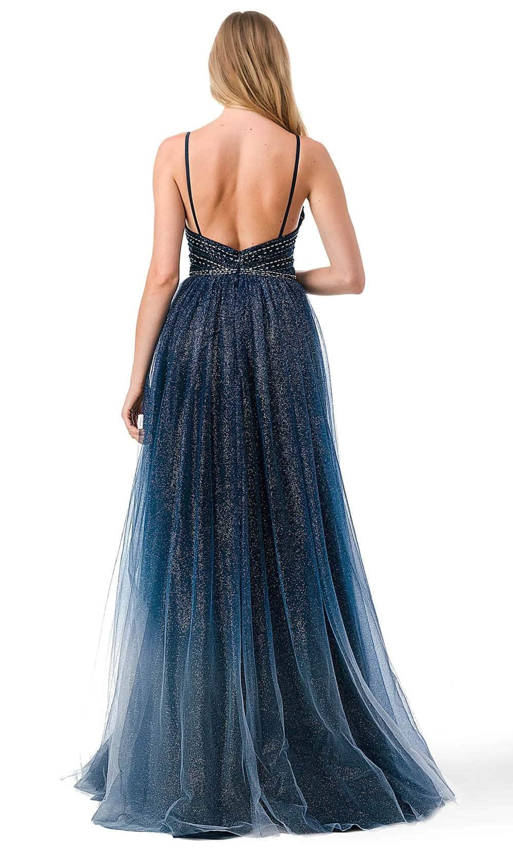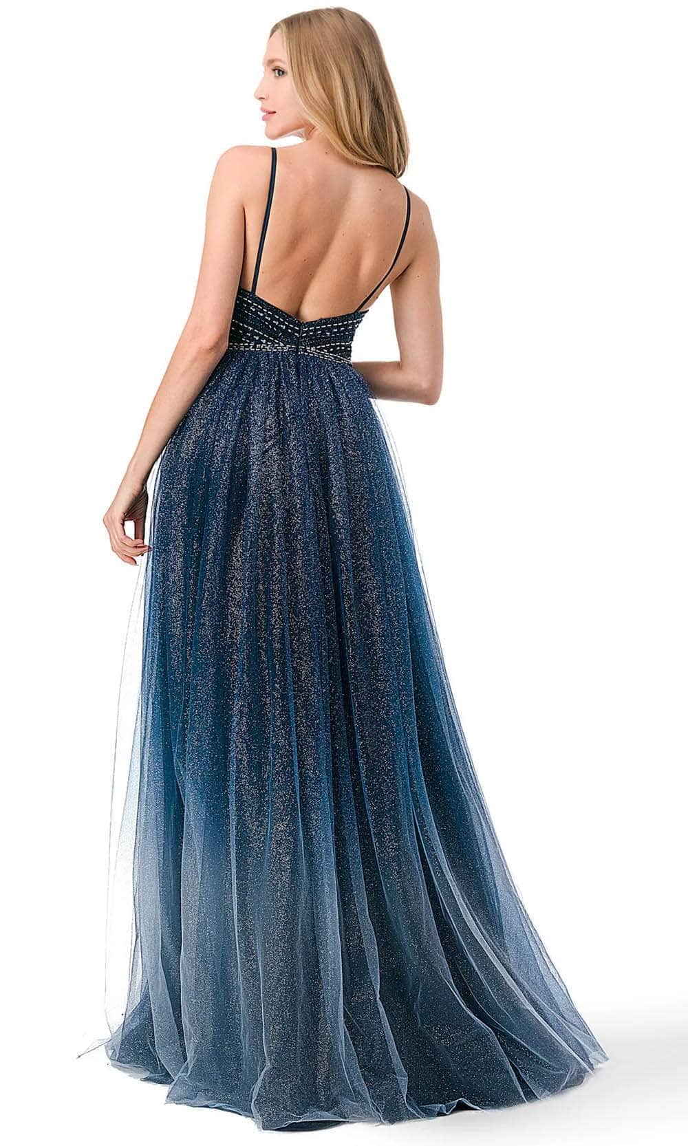 Immerse yourself in the enchanting allure of the Trevi Collection L2788F creation. This mesmerizing masterpiece features delicate spaghetti straps and a captivating v-neckline that gracefully highlights your collarbone and décolletage. The bodice is adorned with a stunning beaded butterfly motif. With a low open back and a zipper closure, this opulent piece shows an A-line silhouette effortlessly flatters your figure, while the ombre glitter tulle skirt cascades with a high slit, revealing just the right amount of leg. Completing the look is a sweep train that touches the floor. Step into the spotlight and dazzle the crowd in the Trevi Collection L2788F masterpiece. Model is wearing the Navy Ombre color.