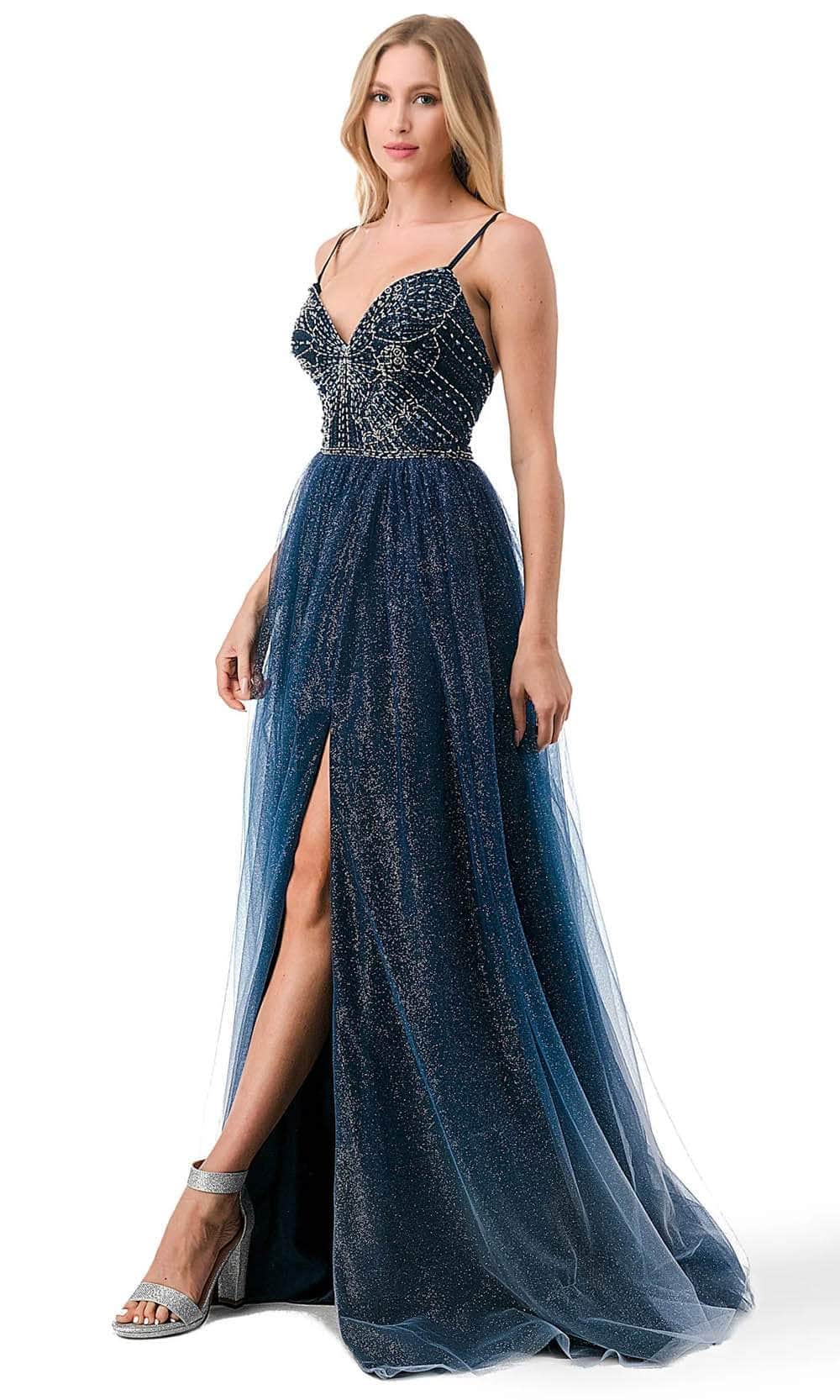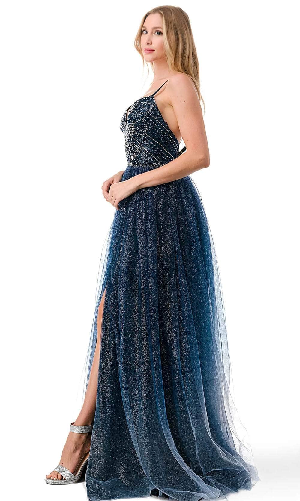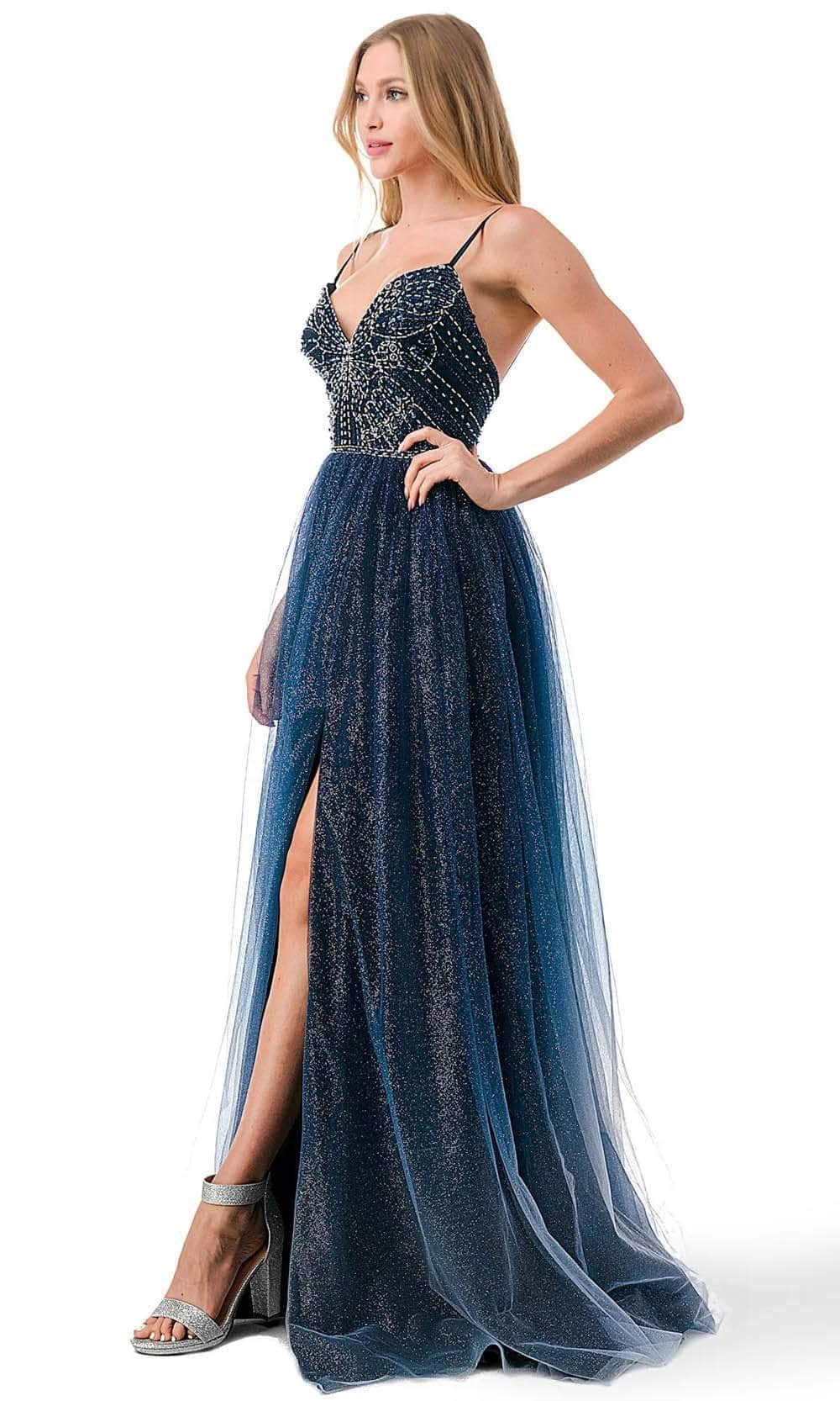 Immerse yourself in the enchanting allure of the Trevi Collection L2788F creation. This mesmerizing masterpiece features delicate spaghetti straps and a captivating v-neckline that gracefully highlights your collarbone and décolletage. The bodice is adorned with a stunning beaded butterfly motif. With a low open back and a zipper closure, this opulent piece shows an A-line silhouette effortlessly flatters your figure, while the ombre glitter tulle skirt cascades with a high slit, revealing just the right amount of leg. Completing the look is a sweep train that touches the floor. Step into the spotlight and dazzle the crowd in the Trevi Collection L2788F masterpiece. Model is wearing the Navy Ombre color.