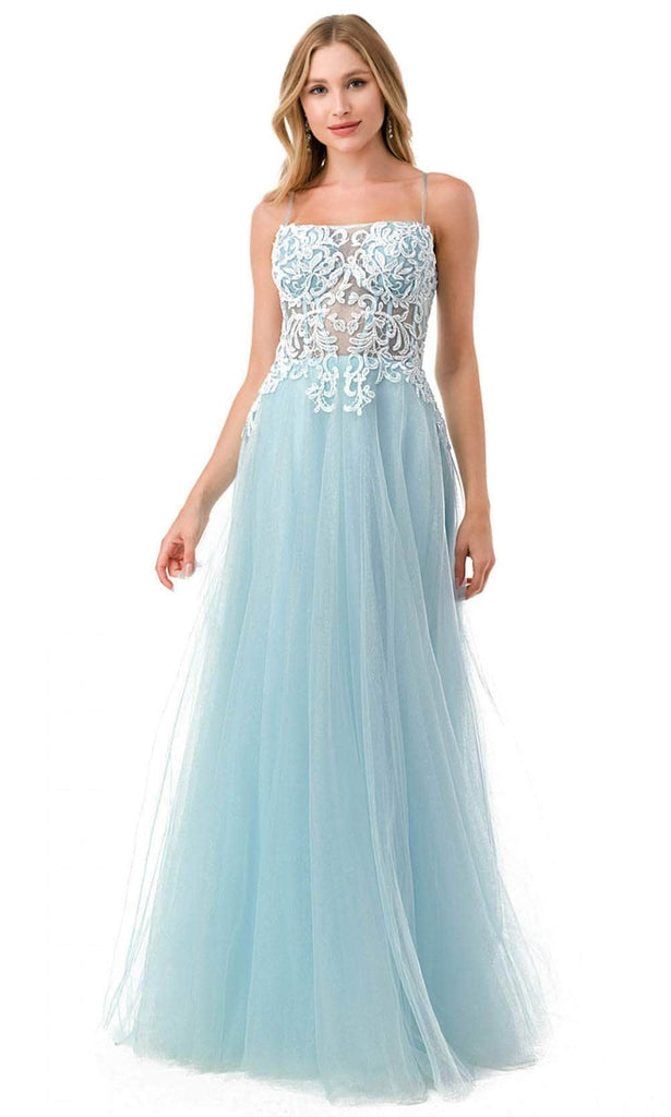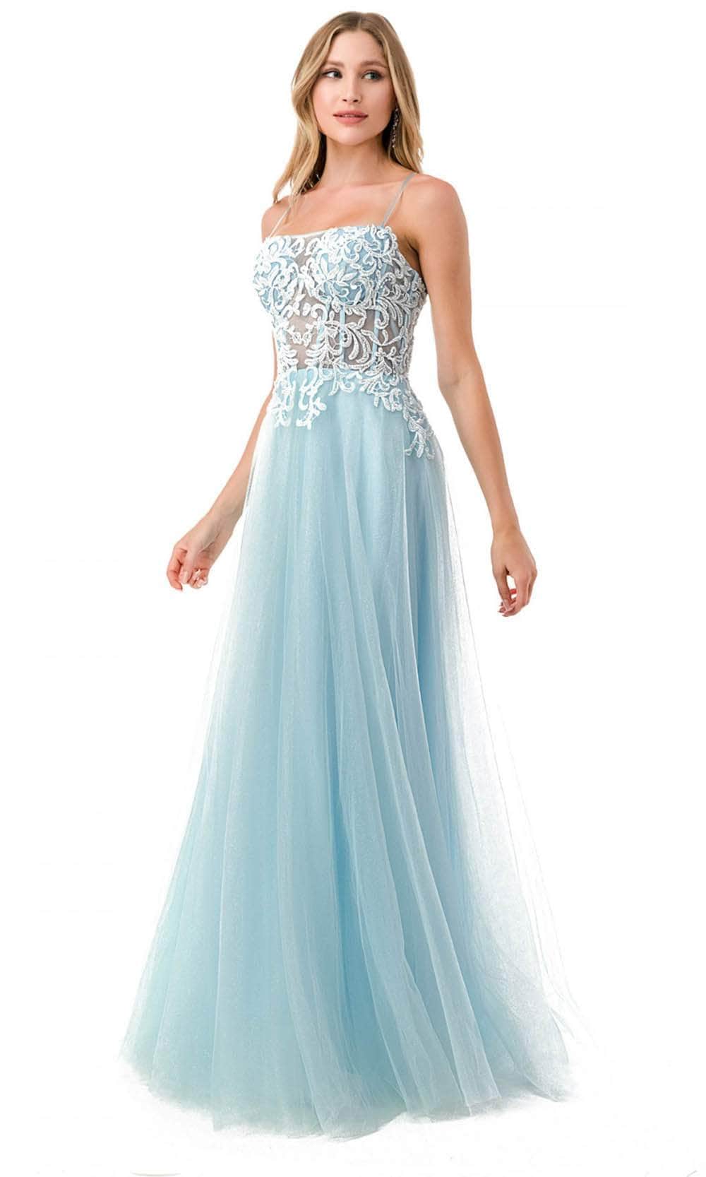 Be the belle of the ball in this Trevi Collection L2809A. The sleeveless corset bodice is a stunning display of intricate lace appliqué, exuding an air of timeless elegance. The straight-across neckline adds a touch of sophistication to this enchanting ensemble. The mid-open back, secured with a back zipper closure, ensures a seamless fit. The full-length A-line skirt gracefully cascades, allowing you to dance with grace and charm, and finishes with a train that adds a sense of grandeur and drama. This Trevi Collection L2809A is a true statement piece, perfect for making a lasting impression on any special occasion. Model is wearing Ice Blue color.