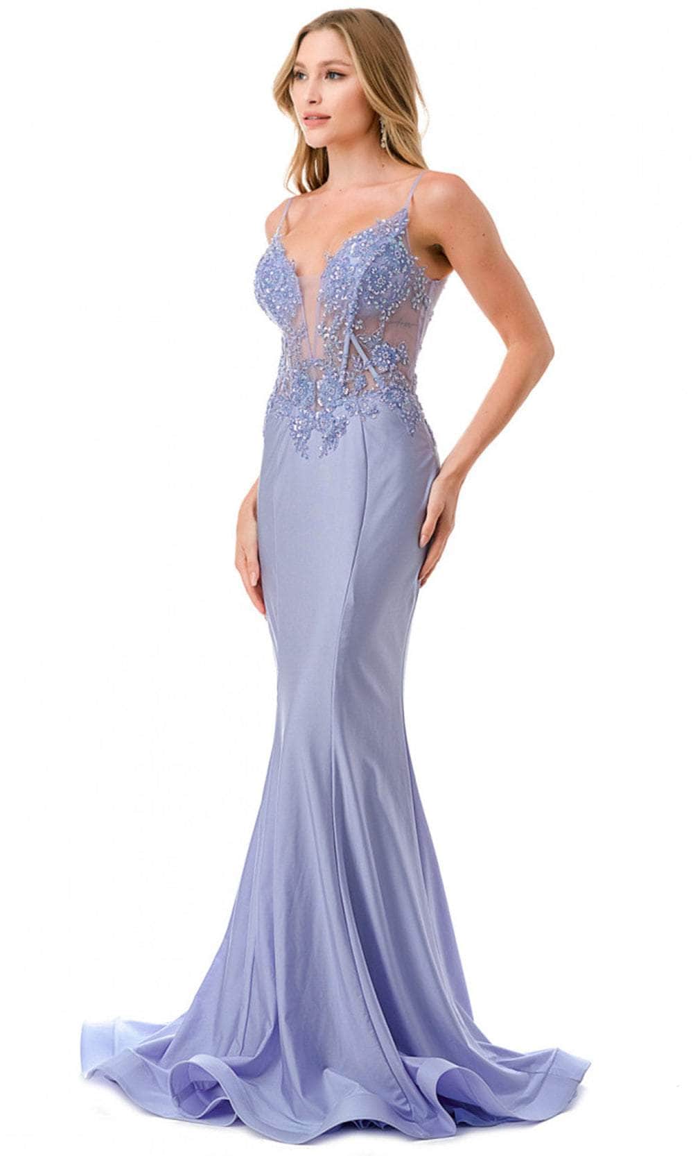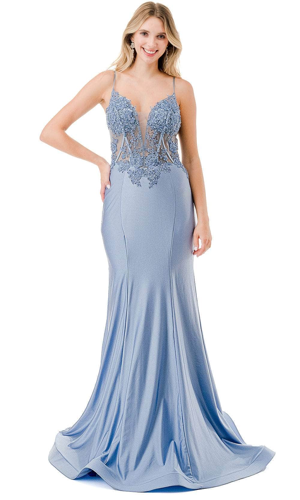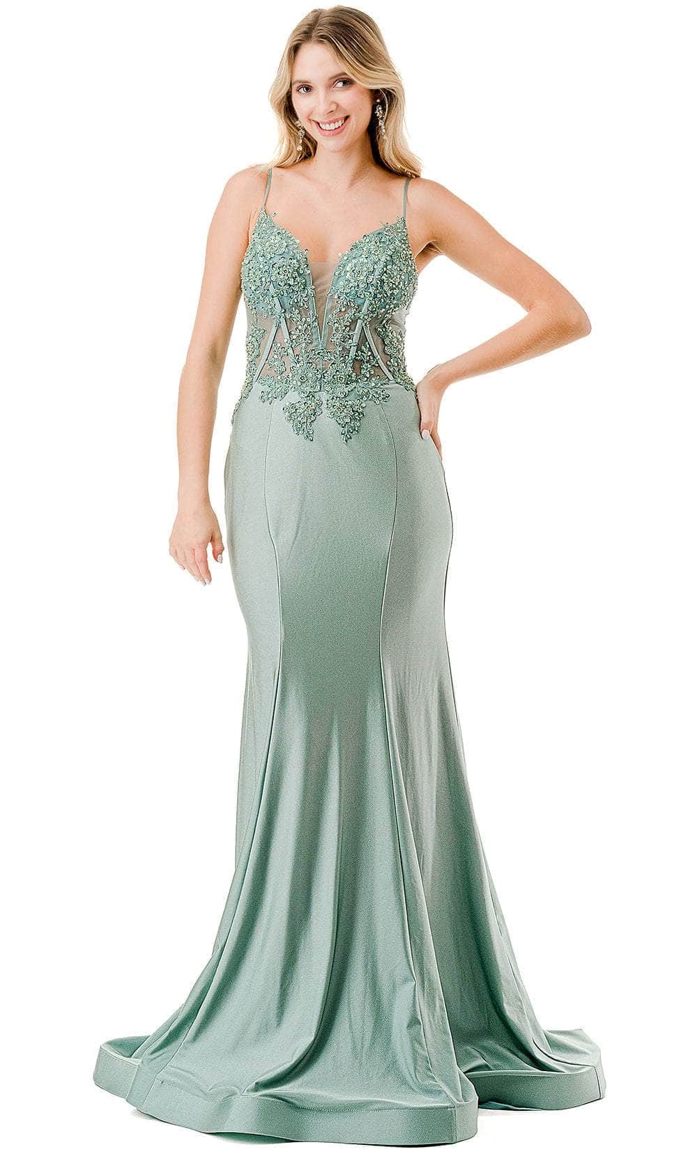 Make a grand entrance at any event that exudes regal elegance in this Trevi Collection L2813 masterpiece. This sleeveless gown has a daring see-through corset bodice with beaded and lace applique embellishment, adding a touch of enchantment to your look. Slim straps are used to hold the plunging v-neckline and V-shaped open back. Sculpted in princess seams and a mermaid silhouette, the skirt accentuates your curves and it flows graciously into a sweeping train. Embrace the compelling charm of the Trevi Collection L2813 creation. Models are wearing Lilac, Sage, and Smokey Blue colors.