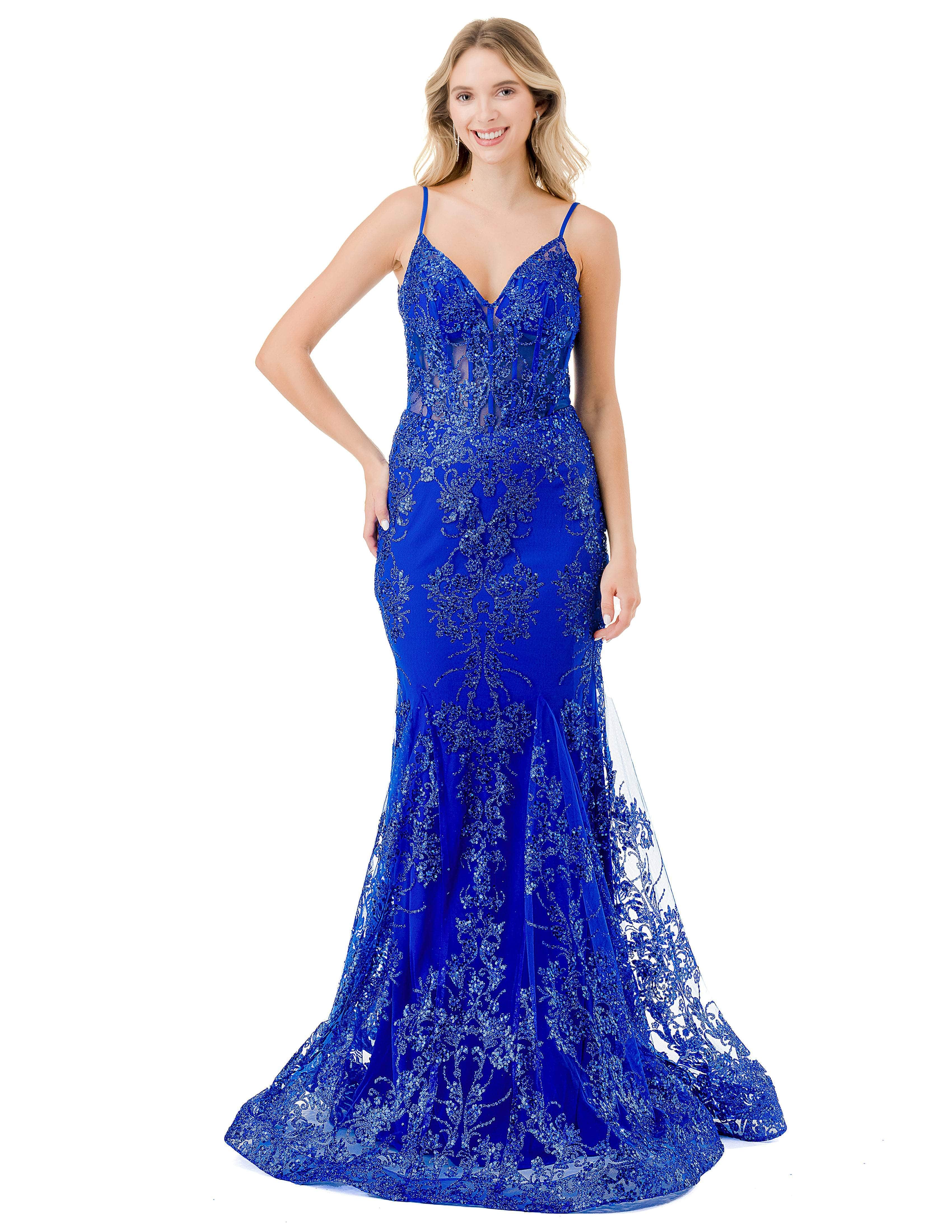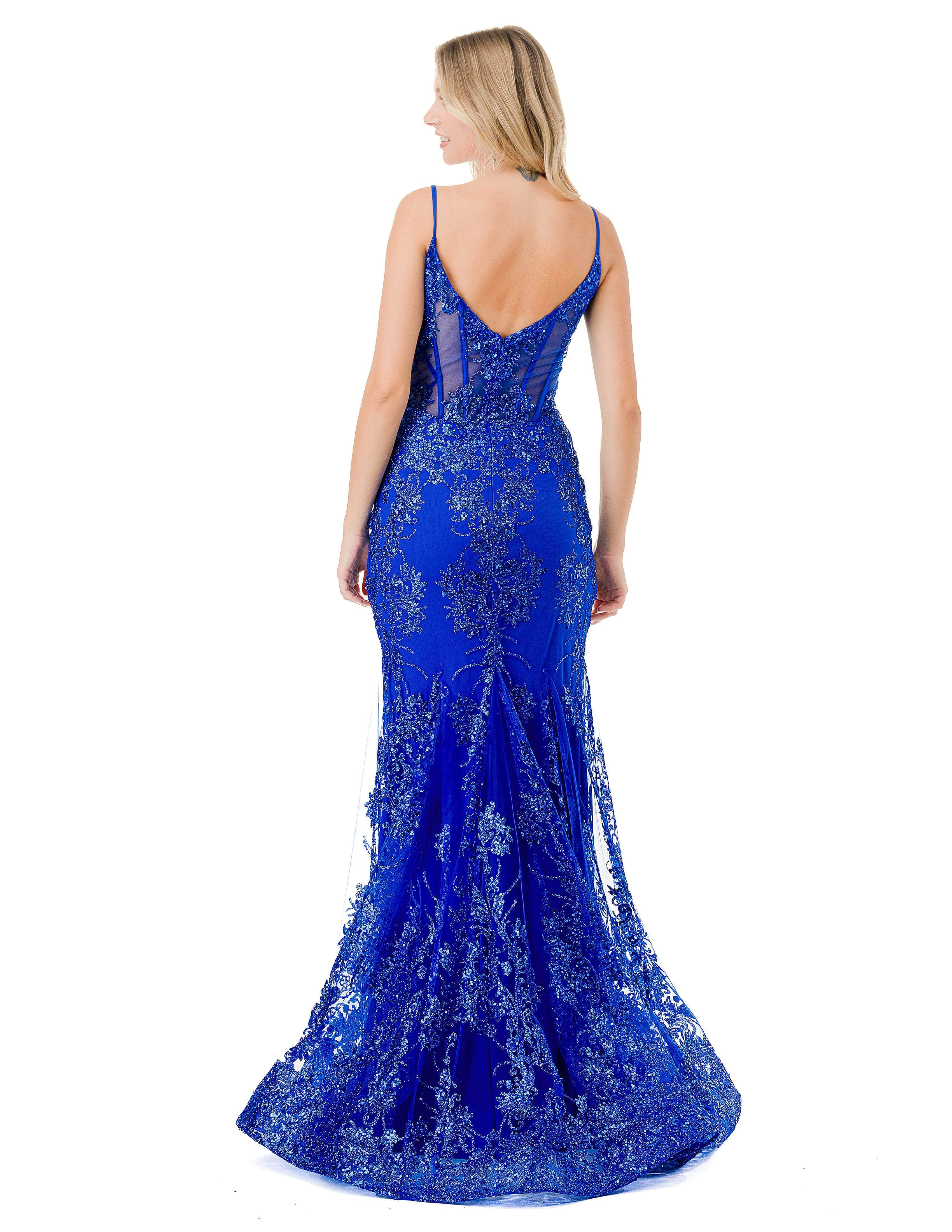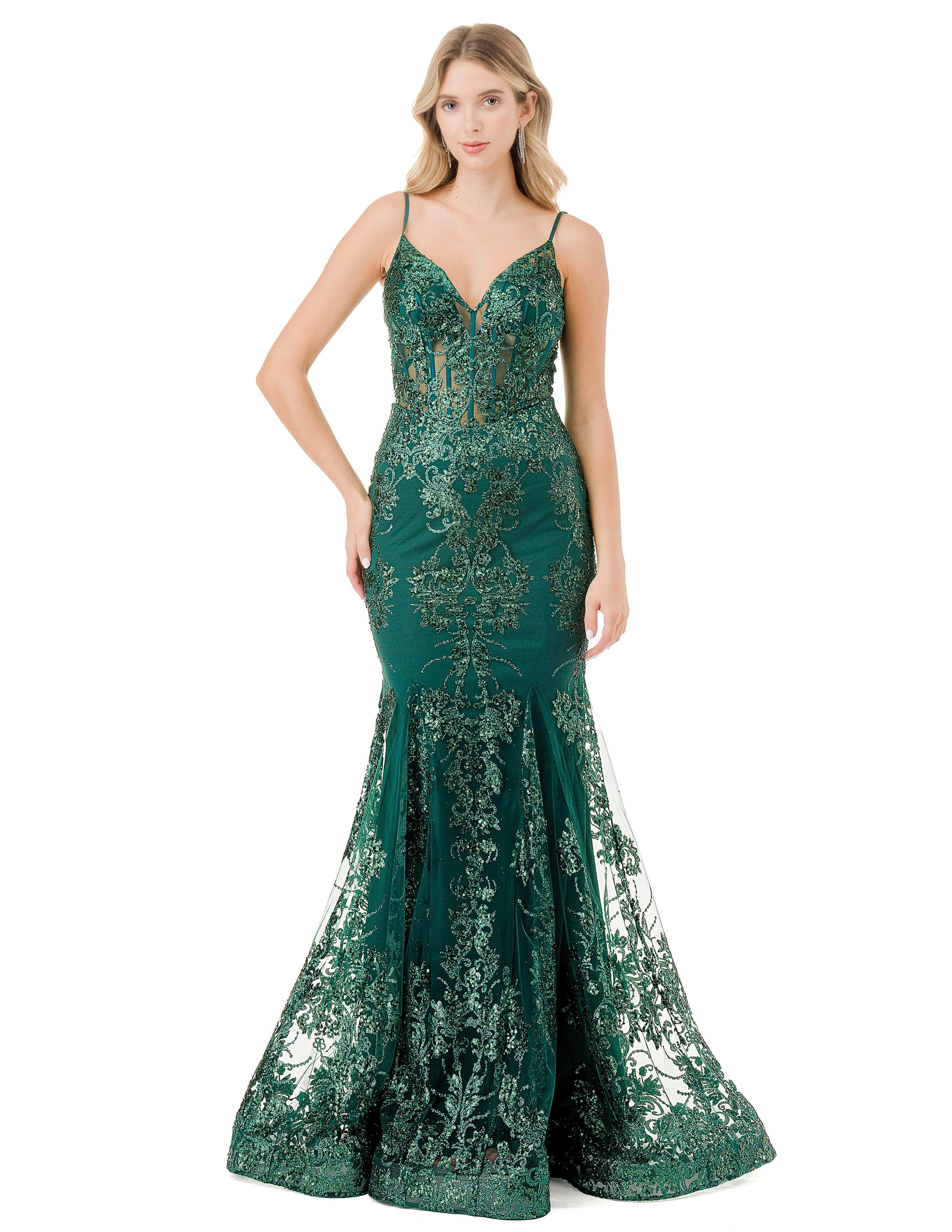 Sparkle from the crowd wearing this glamorous evening gown by Trevi Collection L2820W. Richly ornamented with sequins and glitters, this elegant gown will keep everyone's eyes on you. Highlighted by an illusion corset bodice with exposed boning detail, this style comes with v-neckline and spaghetti straps that navigate to the illusion v-open back. Fitted through the hips, the skirt reveals a godets accent to create a mermaid silhouette. A horsehair hem and sweeping train complete this look. Walk the red carpet in style wearing this Trevi Collection L2820W ensemble. Models are pictured wearing the Rosegold, Hunter Green, and Royal colors.