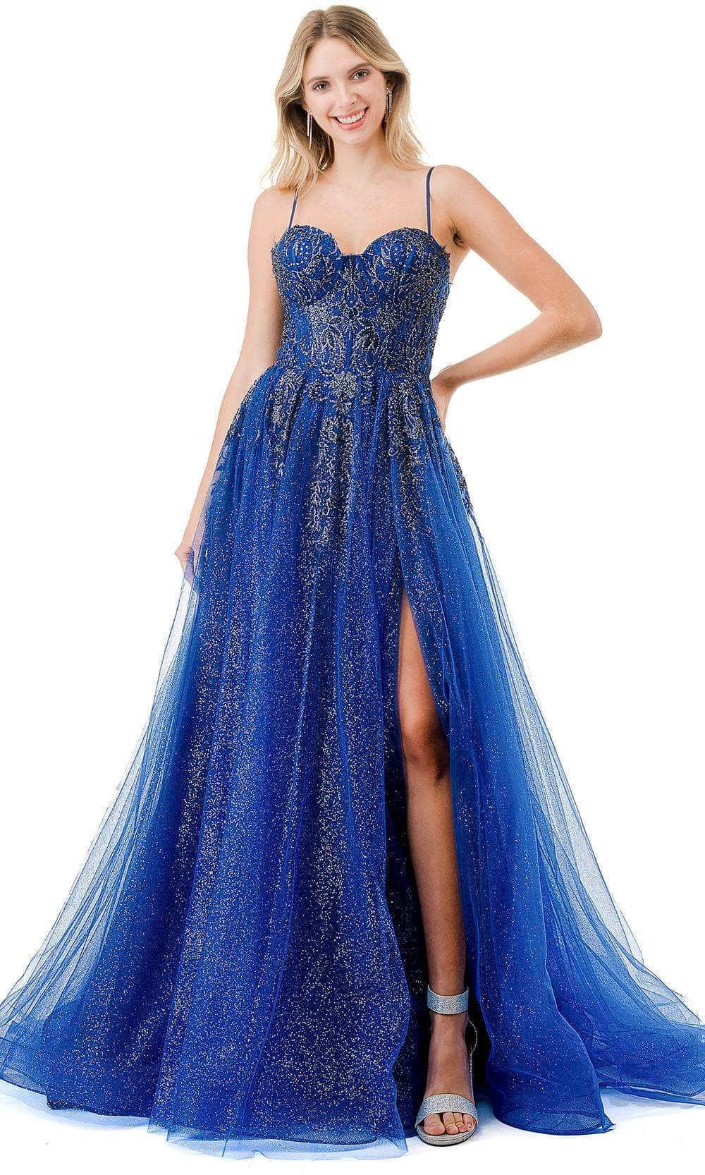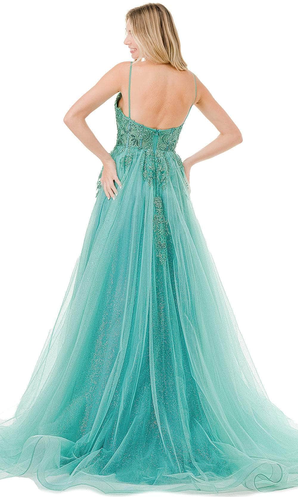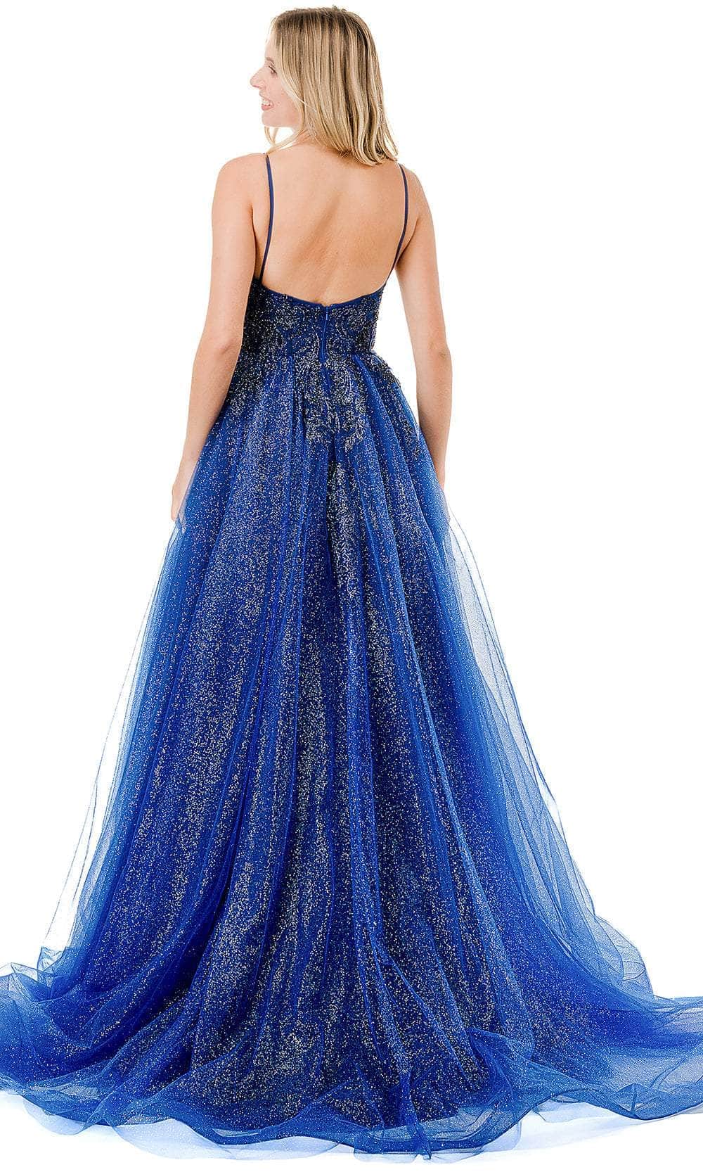 Heighten the allure of any special occasion in this Trevi Collection L2846B masterpiece. Fashioned in glitter fabric with beadwork and lace appliques, this sleeveless ensemble is the epitome of elegance and style. The sweetheart neckline frames your face beautifully, while the spaghetti straps fall to the sultry open back. For structural support and fit, it displays a visible boning on the corset bodice. The skirt is fascinatingly layered and forms into an A-line silhouette. A sexy thigh-high slit and sweeping train with horsehair hem complete this ensemble. Make your night one to remember with the timeless beauty of this Trevi Collection L2846B gown. Models are wearing Mint, and Navy colors.