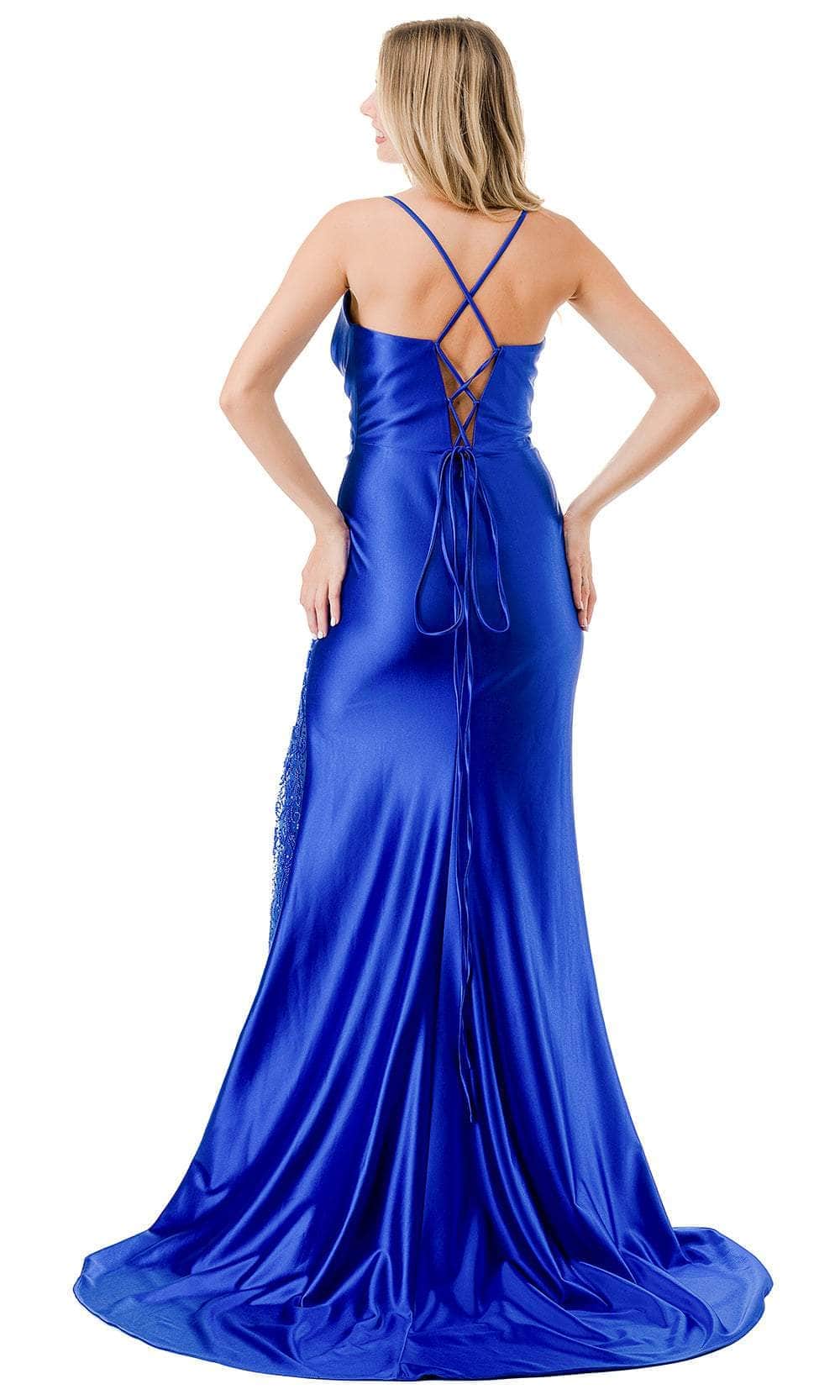 Make an unforgettable impression on your special night in Trevi Collection L2849P masterpiece. This sleeveless dress boasts thin straps, and a ruched bodice that flawlessly highlights your beautiful curves. It features a deep v-neckline with an illusion insert at the bust for coverage. The asymmetrical beaded appliques cascade down the bodice, adding a touch of glamour and sparkle. It has a corset lace-up design that ensures a perfect fit. The high slit and sweep train brings a dramatic appeal to the sheath skirt. Simplicity and elegance as defined by Trevi Collection L2849P dress. Models are wearing Fuchsia, and Royal colors.