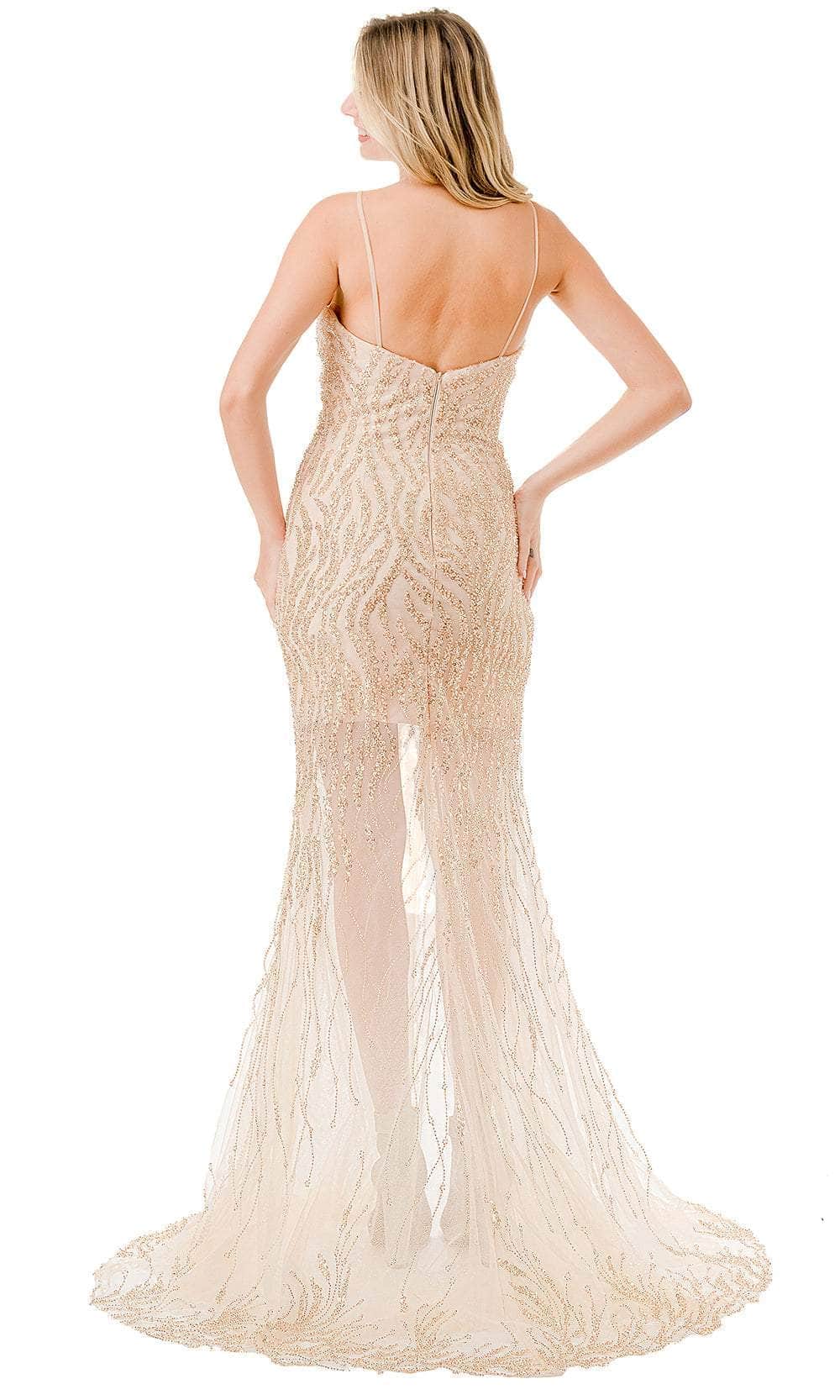 Step into glamour and command attention in this creation by Trevi Collection L2860B. This sleeveless design is opulently decorated with a mix of beaded and sequins. The thin straps accentuate your shoulders, while the plunging v-neckline and open back add allure to the look. It also flaunts an asymmetrical sheer inset at the bust and a zipper fastening in the back. The side thigh-high leg slit and see-through details on the skirt are breathtaking. Completed in a sheath silhouette that hugs your shape and dramatic sweeping train. This Trevi Collection L2860B long gown is perfect for any special event. Models are wearing Champagne, and Ice Blue colors.