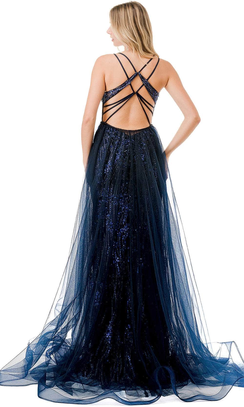 Steal the show in this dazzling Trevi Collection L2910F, a mesmerizing masterpiece adorned with sparkling embellishments. This gown features a sleeveless sheer bodice that adds a hint of allure, complemented by a flattering V-neckline. The open back is intricately detailed with elegant strappy elements, enhancing its modern appeal. The floor-length skirt cascades in a sheath silhouette, with an overskirt that adds volume and drama. Concluding with a graceful train, this Trevi Collection L2910F is perfect for making a sophisticated statement at any special occasion. Model is wearing Navy color.