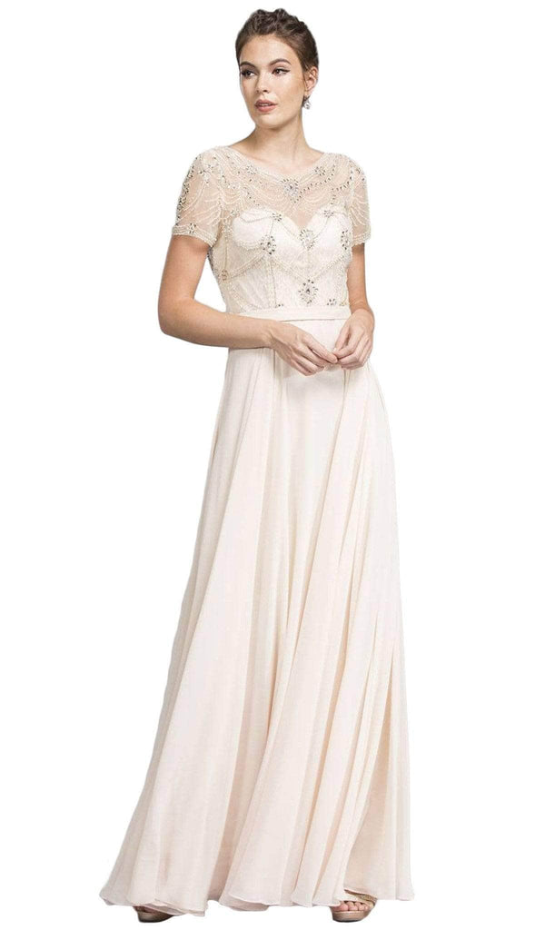 Beam with pride when you wear this radiant dress from Trevi Collection L2010. Fashions an illusion bateau neckline with short sleeves. The sweetheart lined bodice is made of lace fabric and adorned with glittering embellishments. The back has a low V-cut and a zipper closure. The waist is cinched in a thin band and flourishes a full length sheath skirt. Make a sophisticated statement in this glittery dress by Trevi Collection.